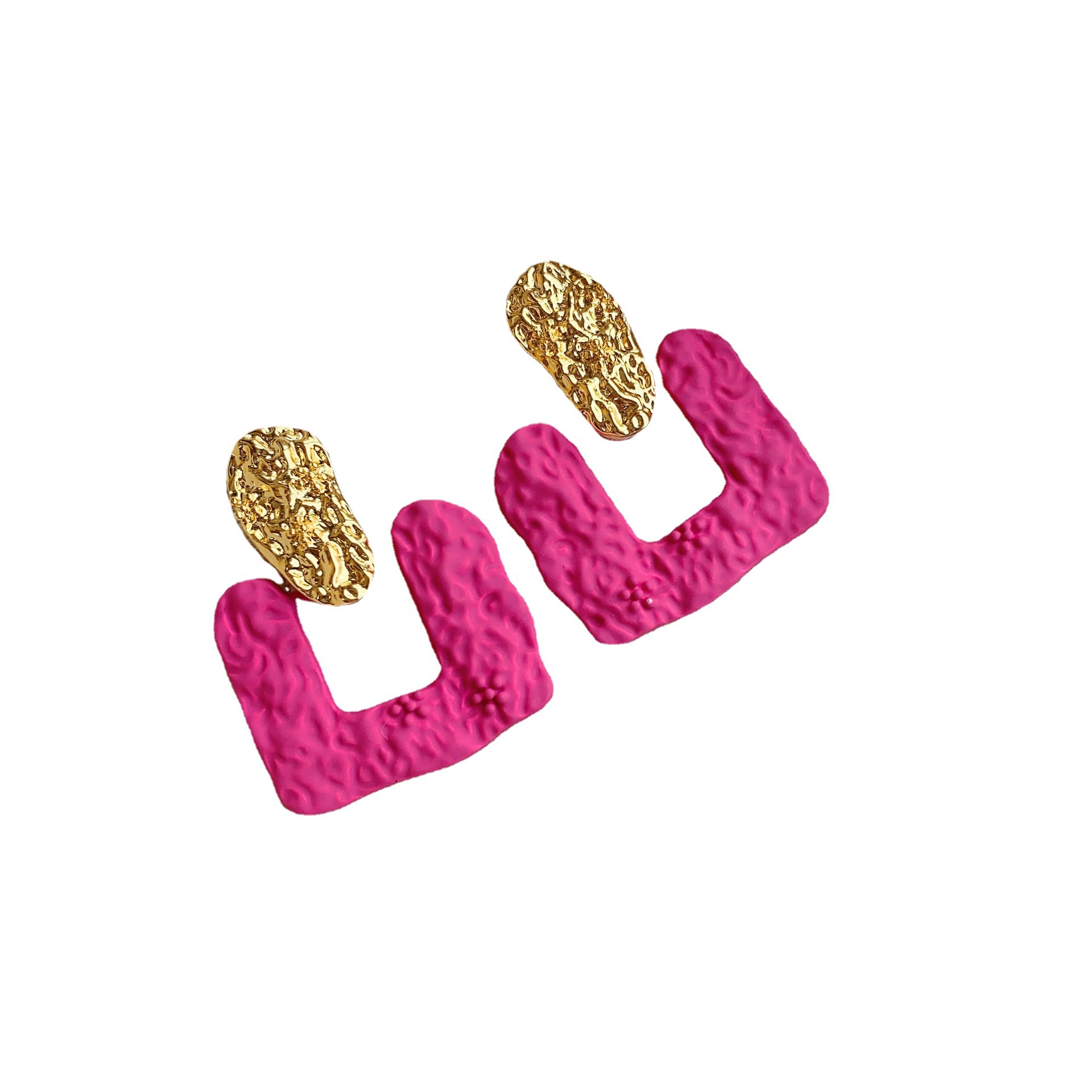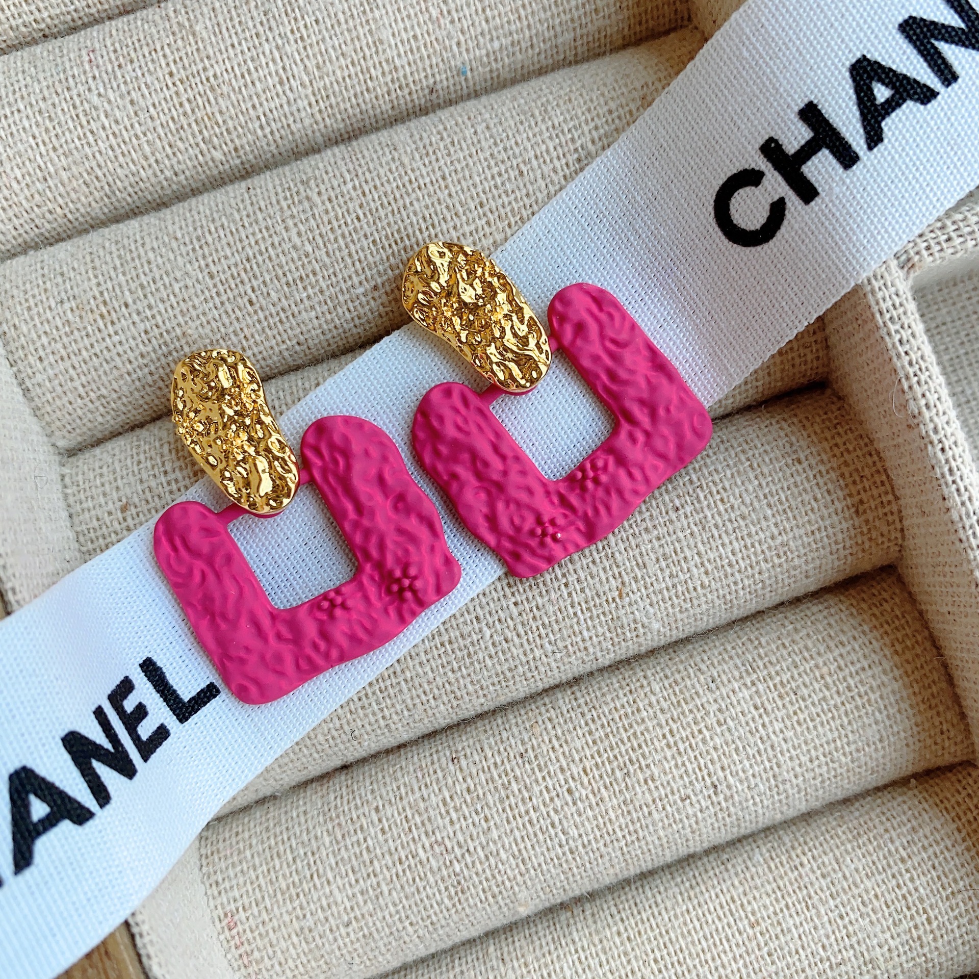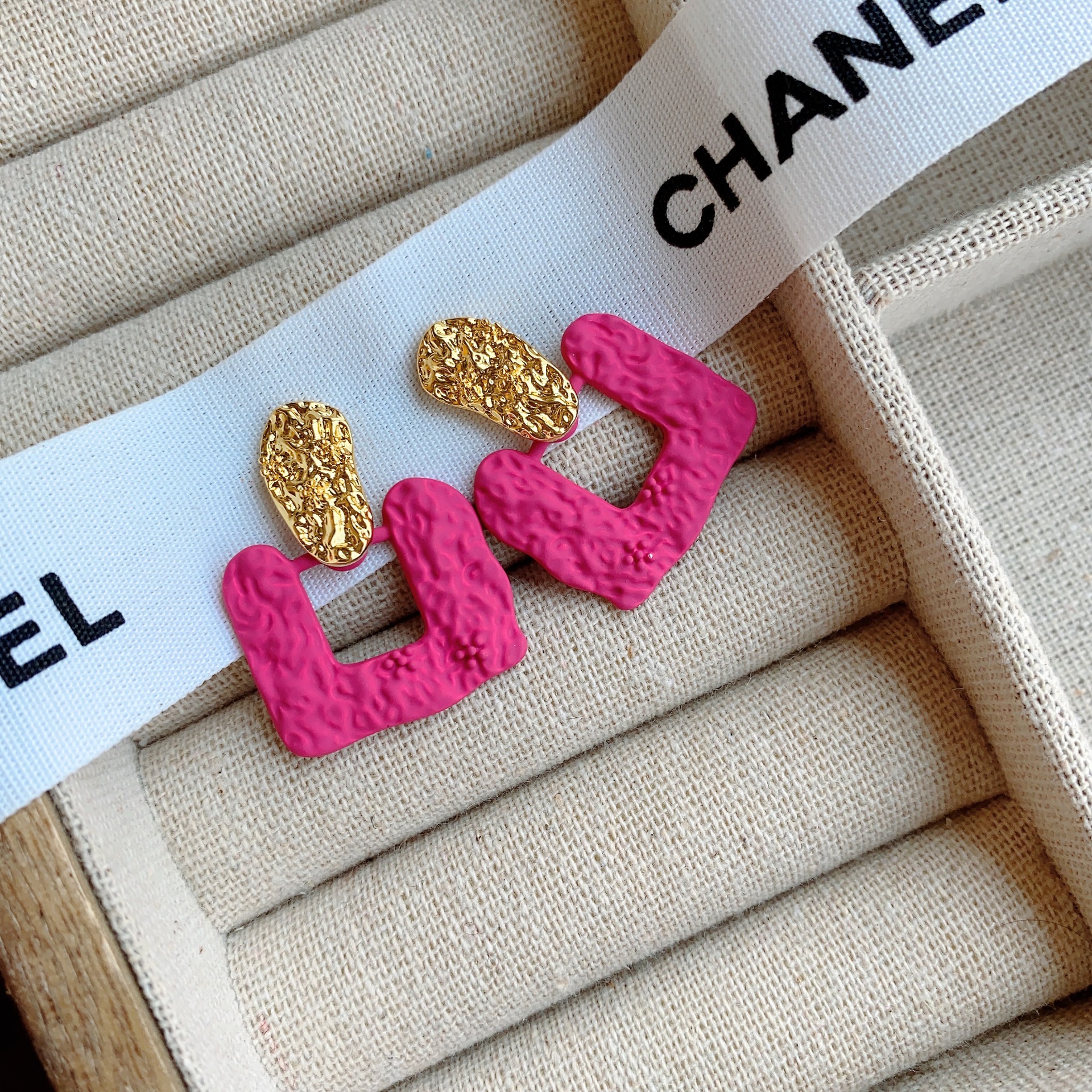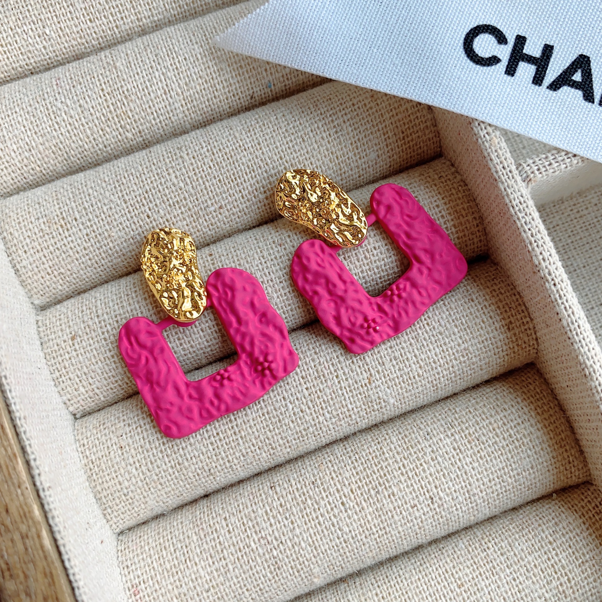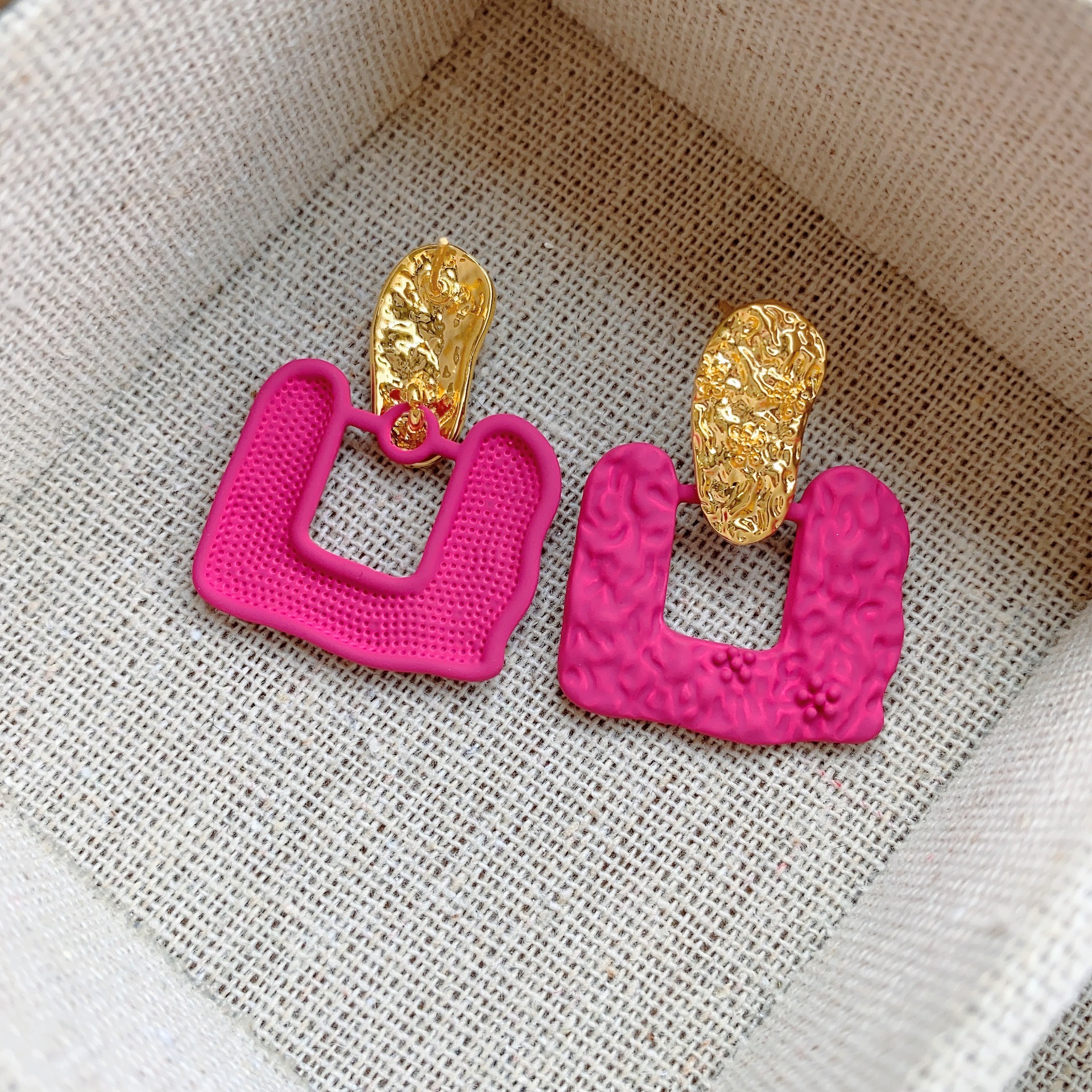 夏季新款百搭通勤方型撞色耳环个性玫红耳钉复古洋气时尚小众耳饰