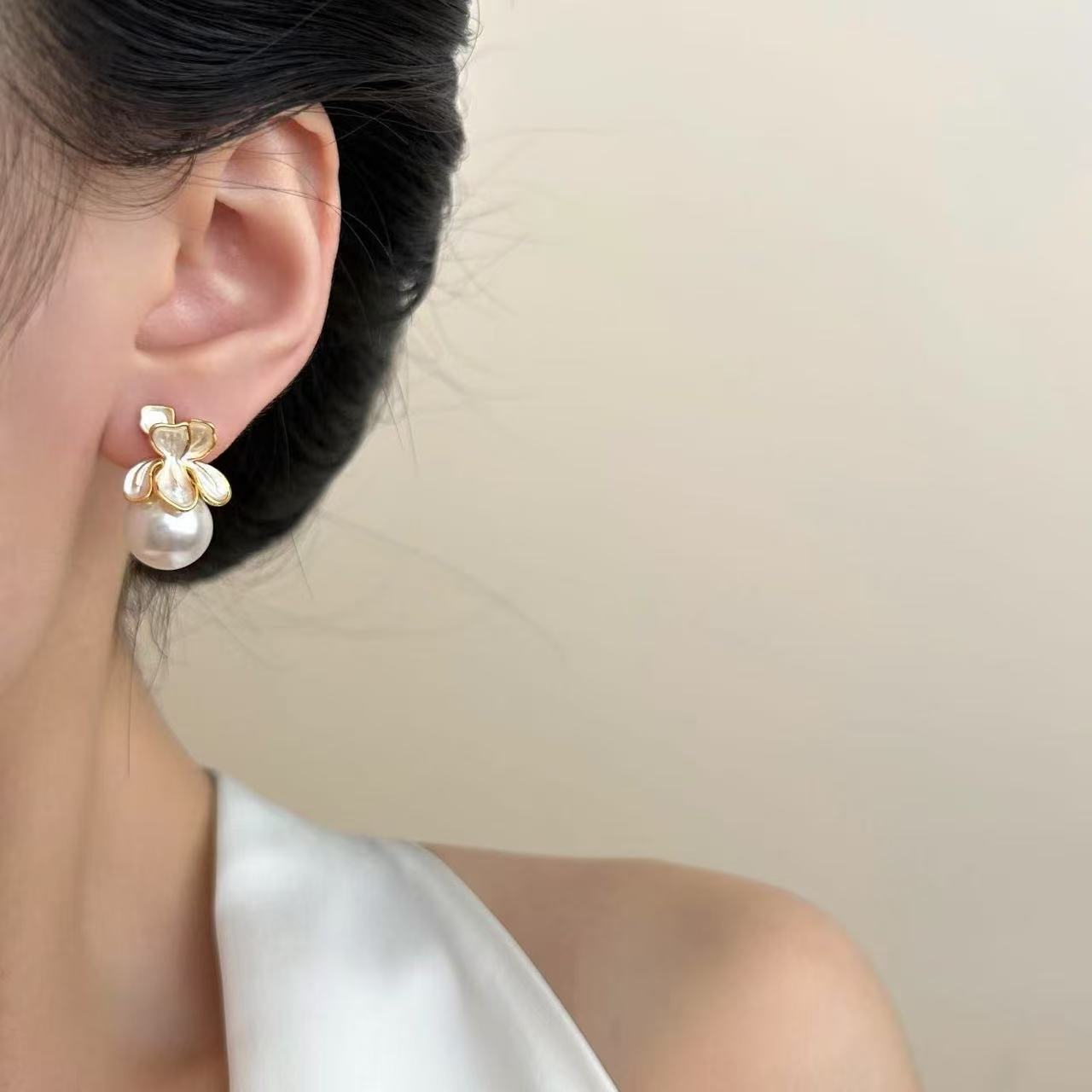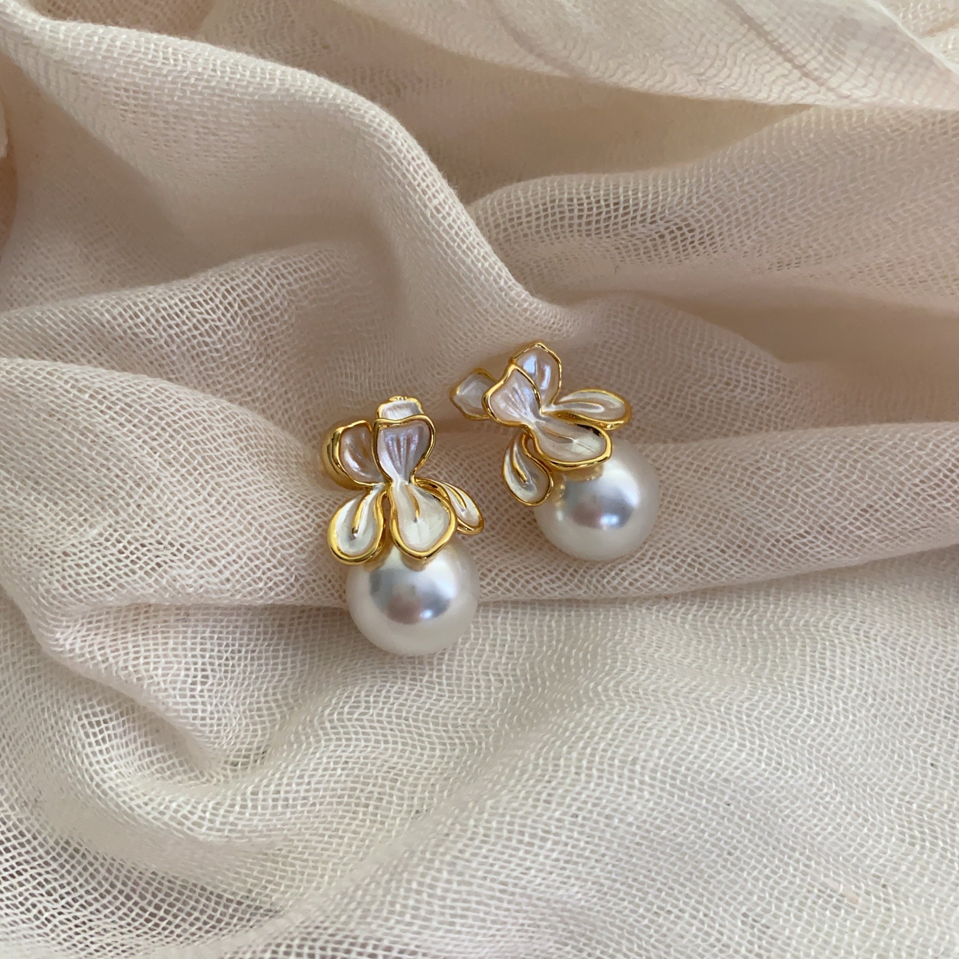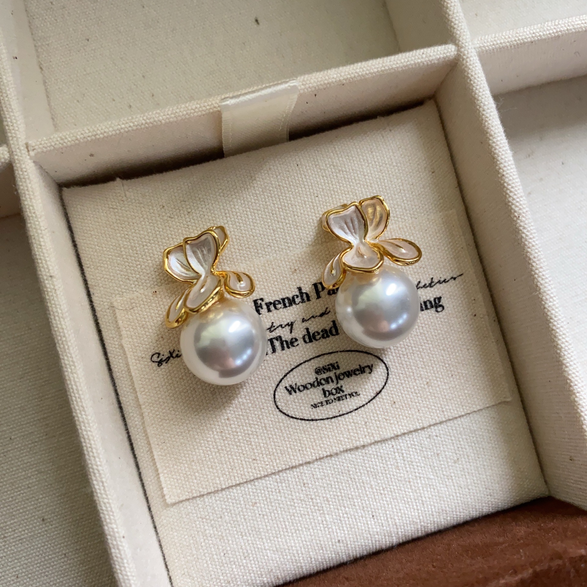 个性简约气质新款精致蝴蝶兰珐琅设计珍珠耳钉时尚百搭小众耳环女
