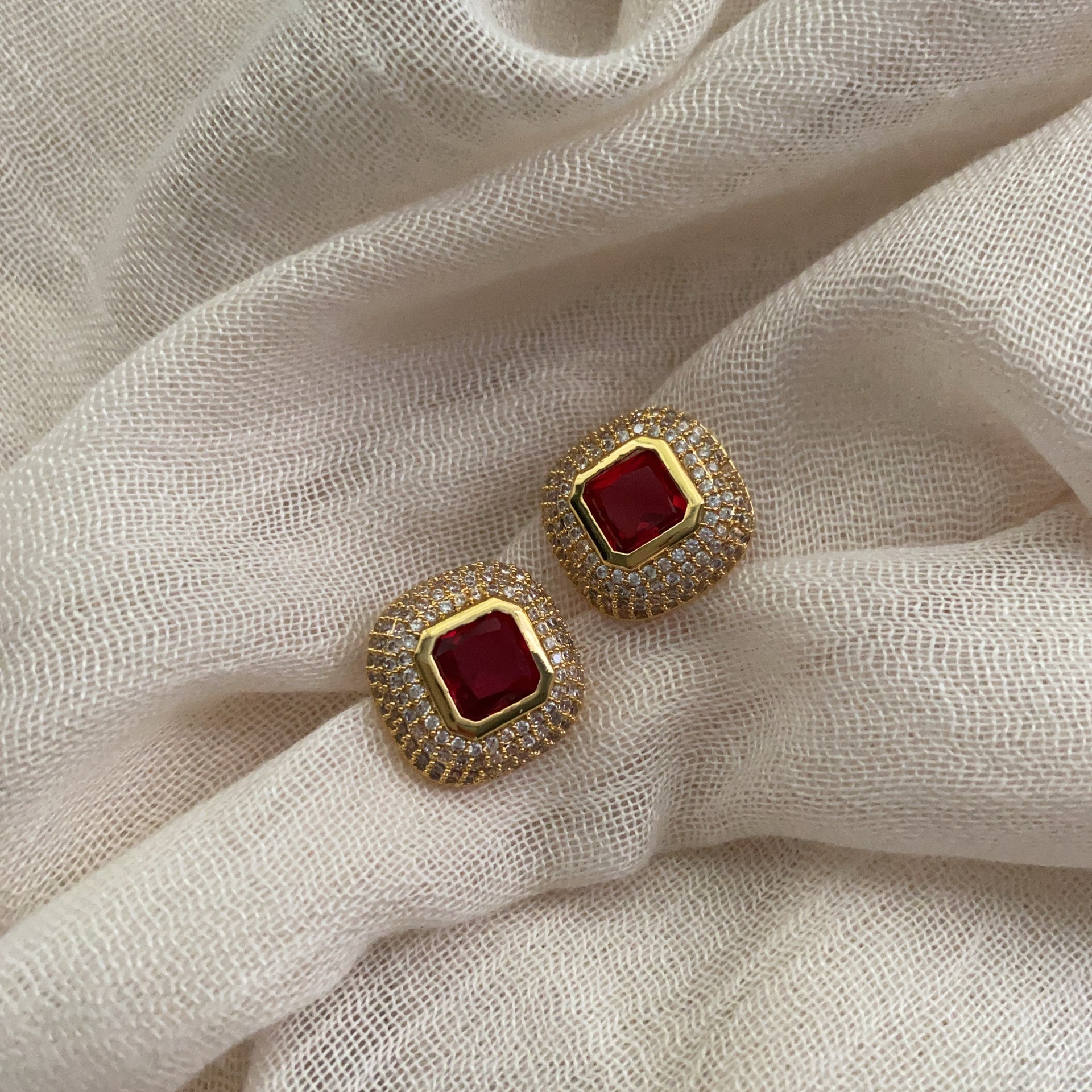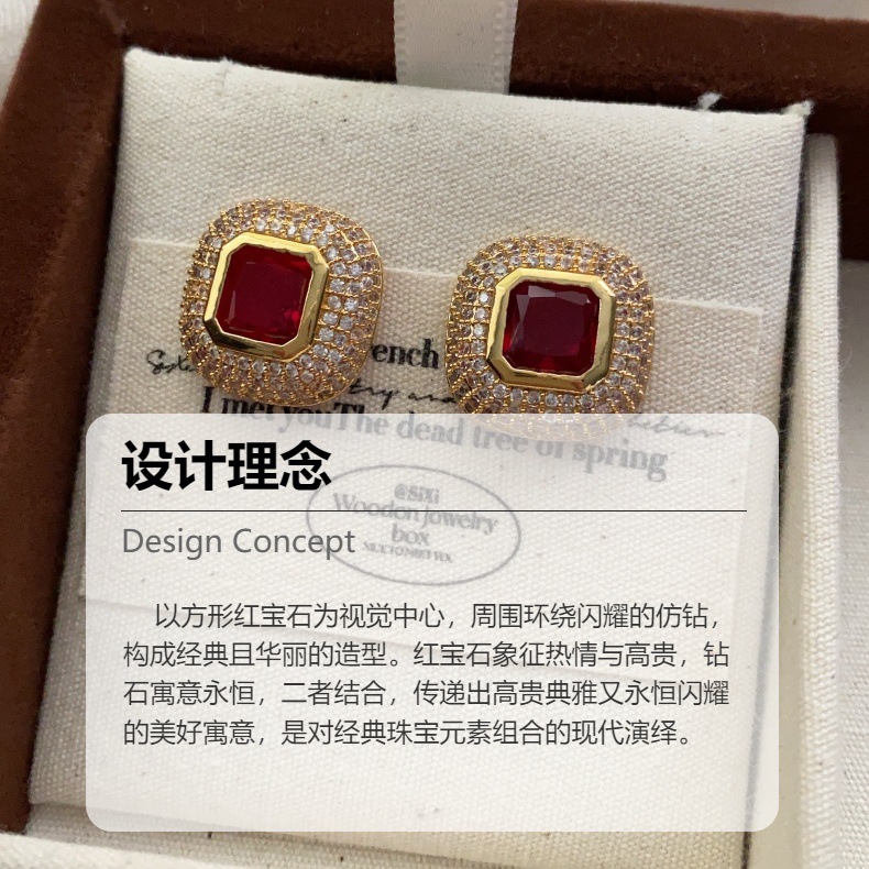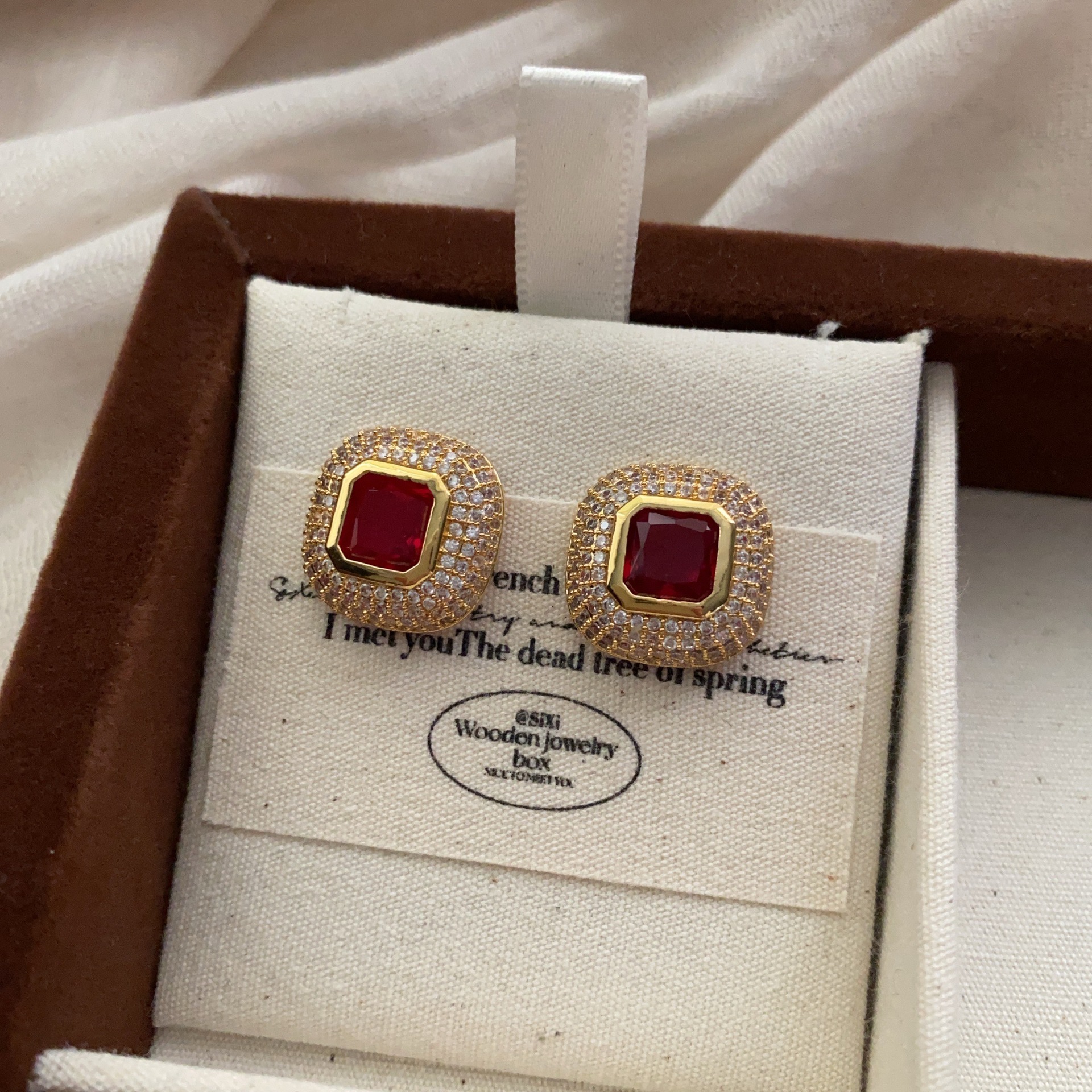 复古轻奢方形彩色锆石耳钉女简约气质小巧高级感耳钉通体满钻镶嵌