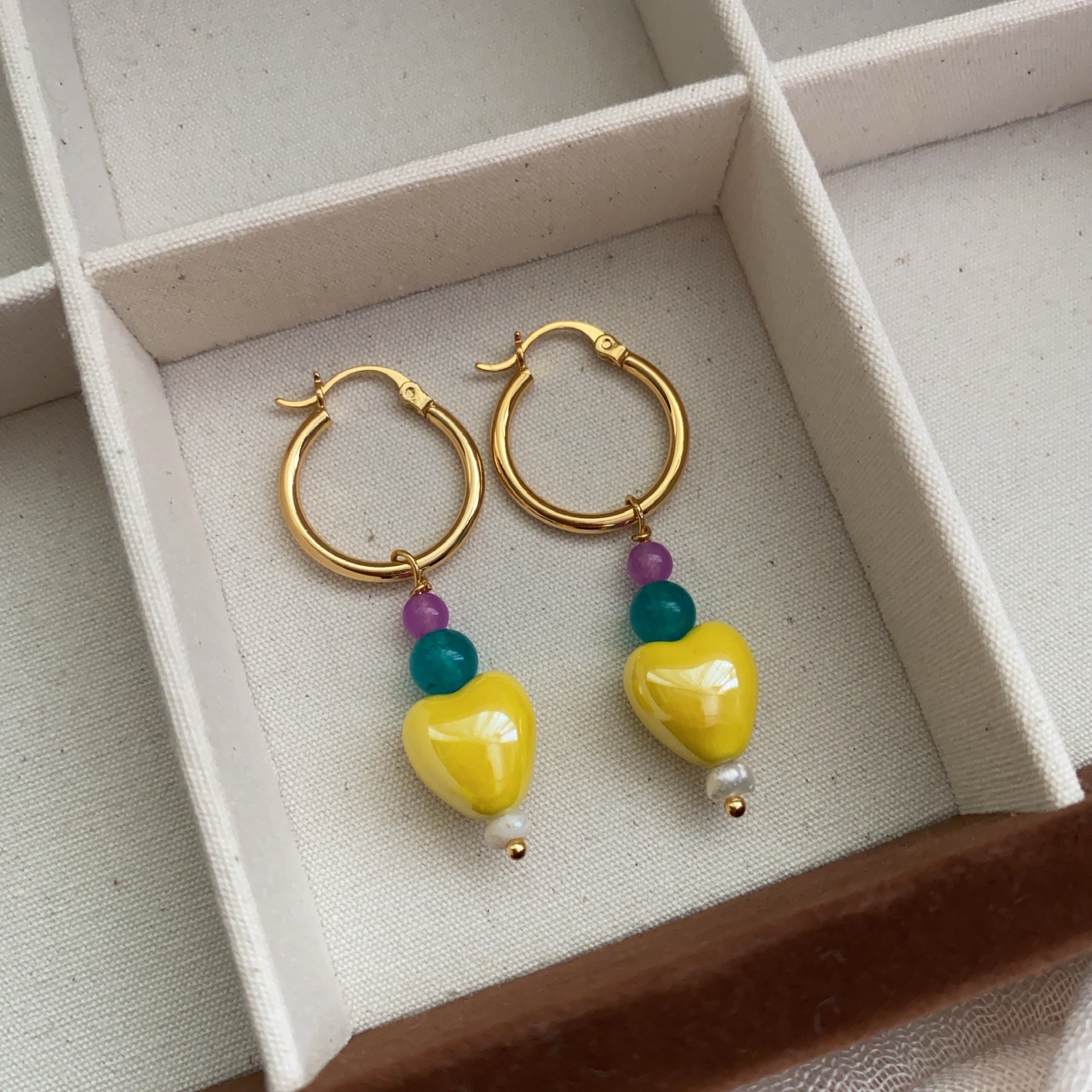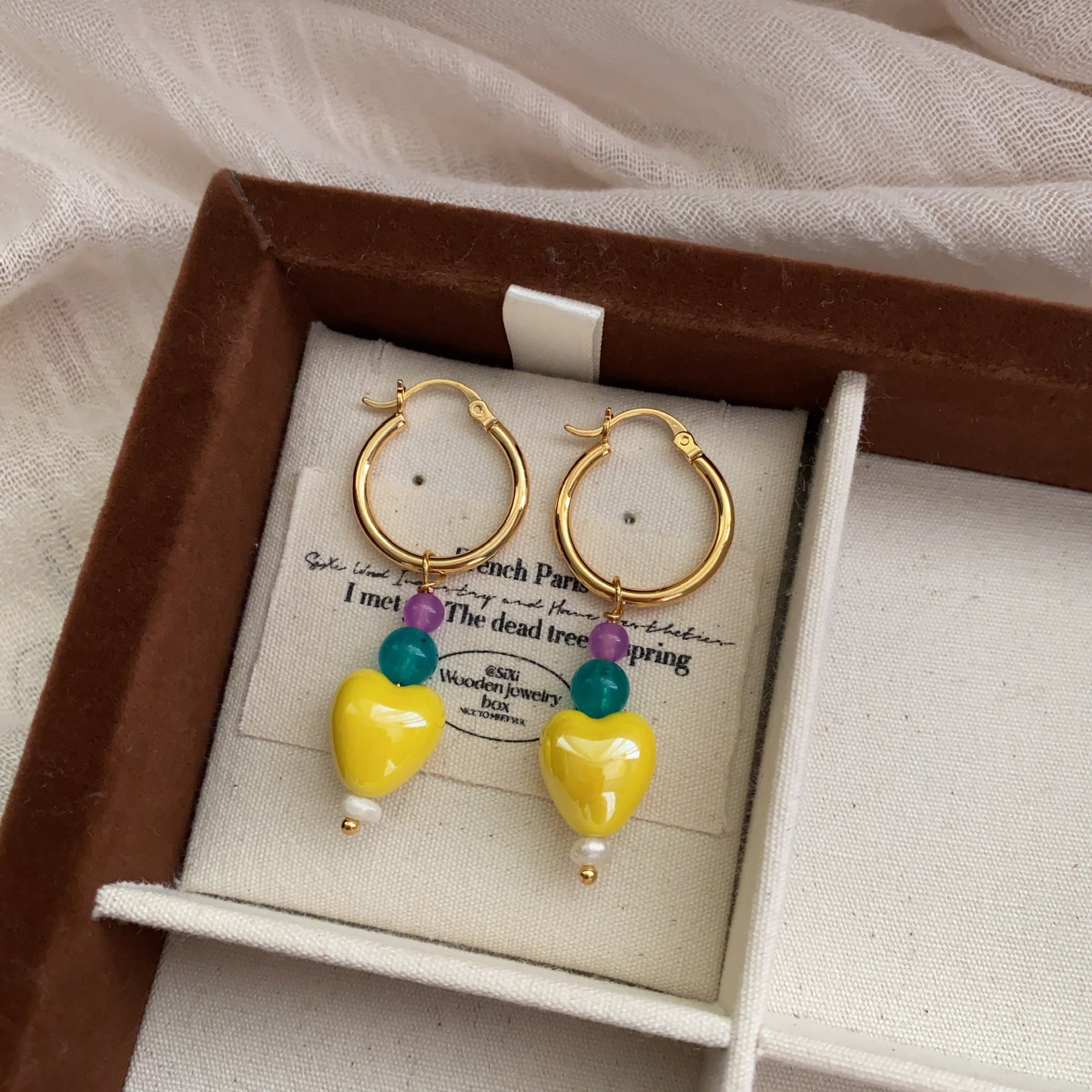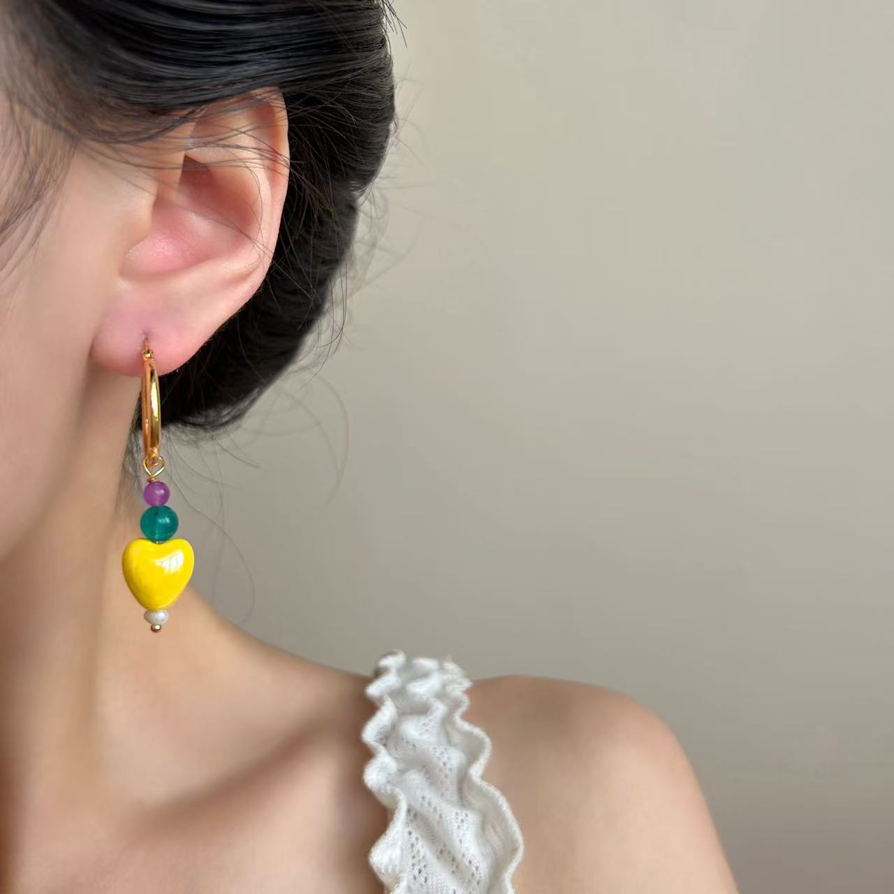 优雅气质设计感小清新黄色耳环女生简约小众百搭爱心挂珠耳坠耳钉