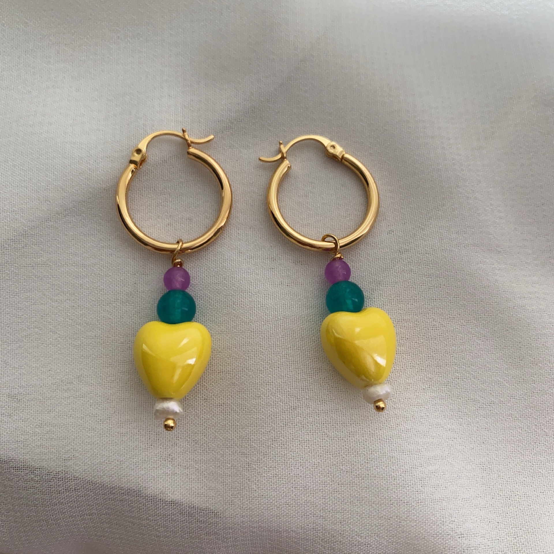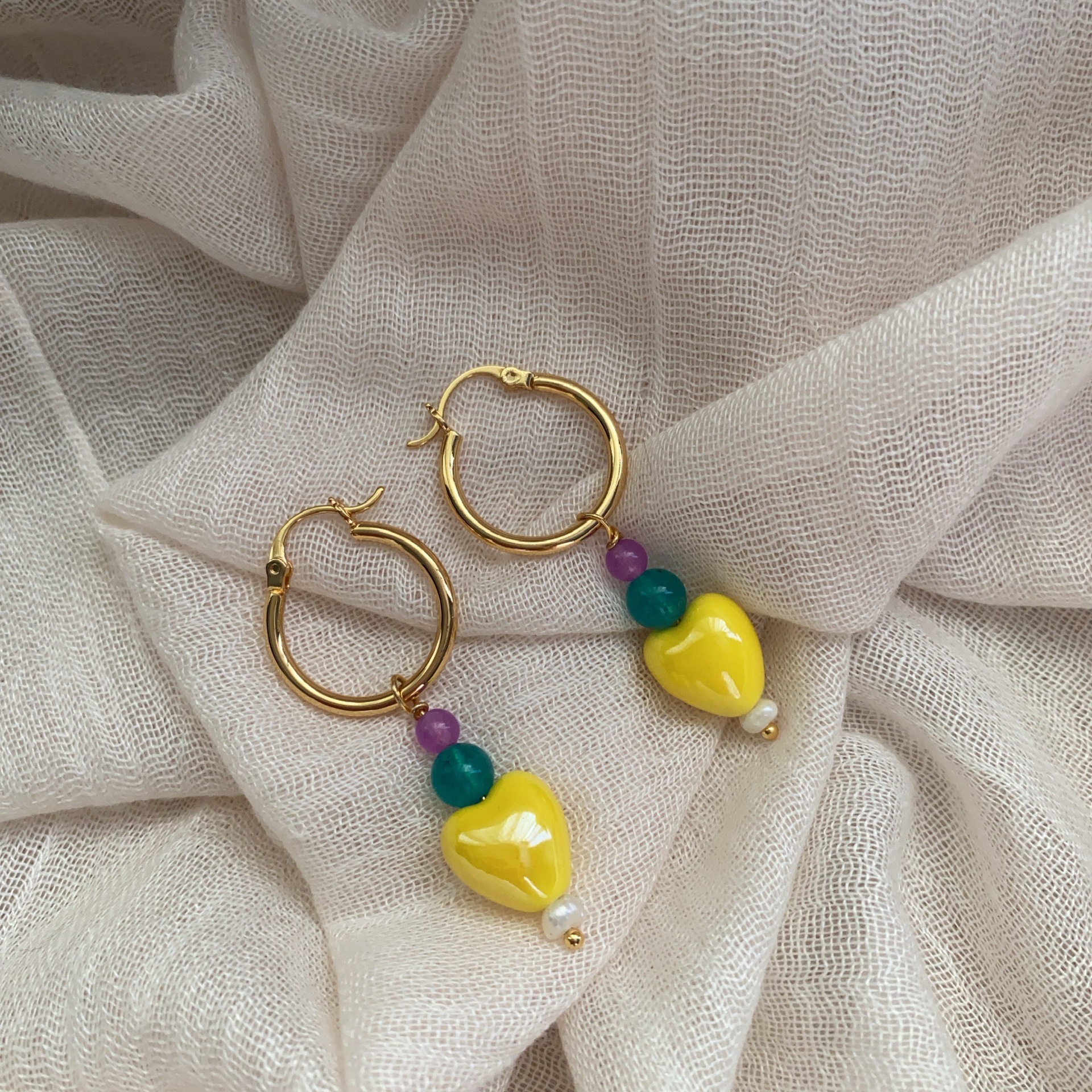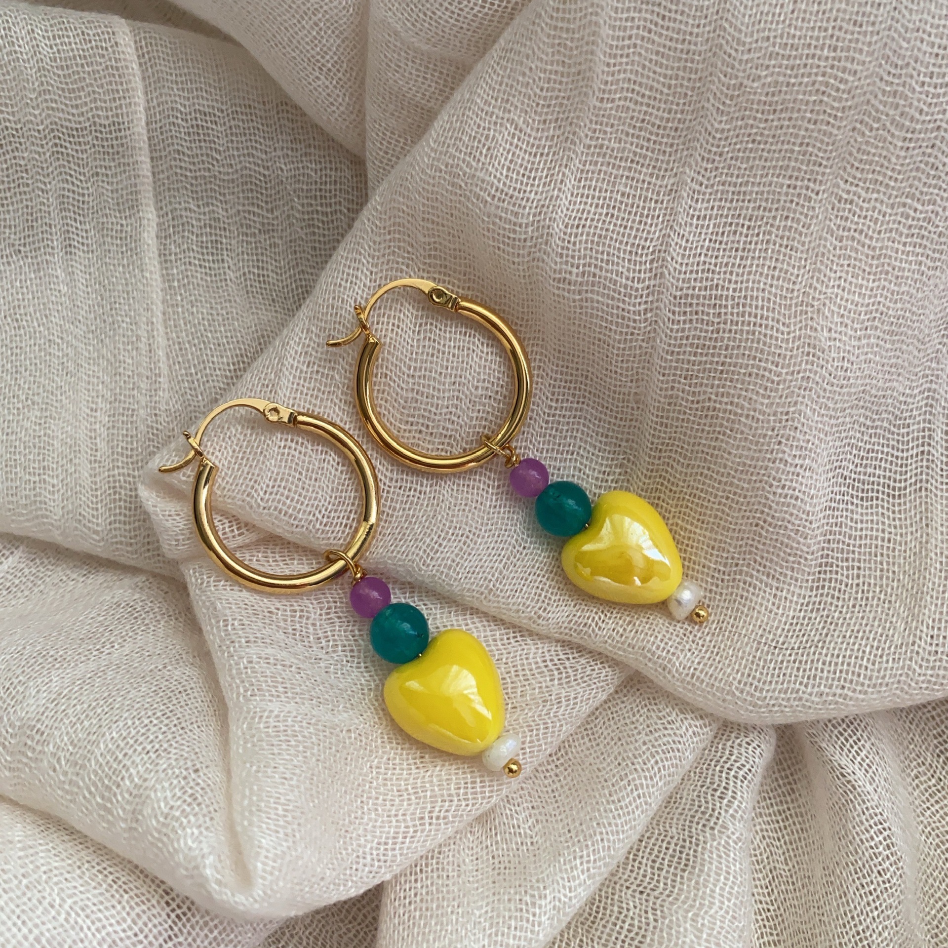 优雅气质设计感小清新黄色耳环女生简约小众百搭爱心挂珠耳坠耳钉