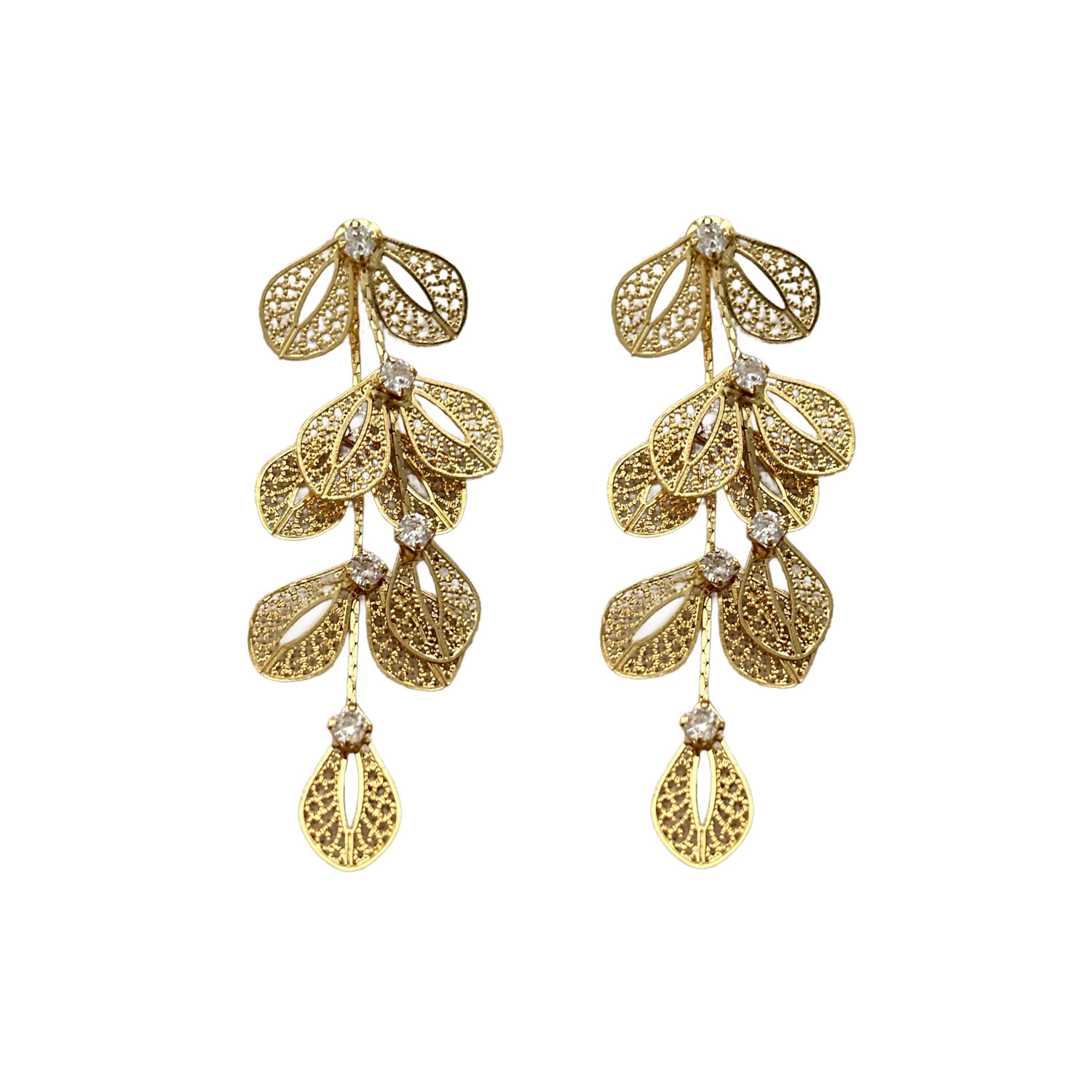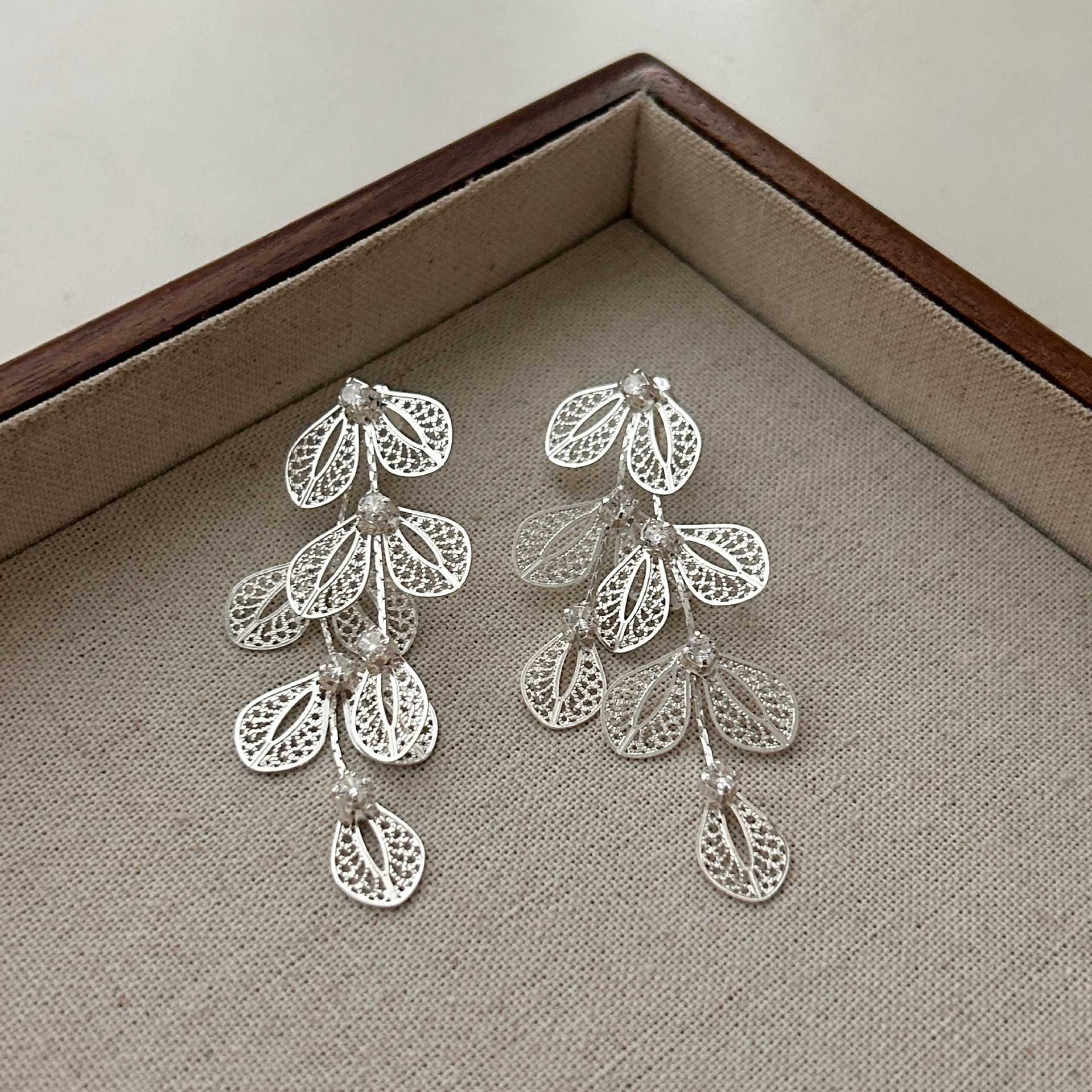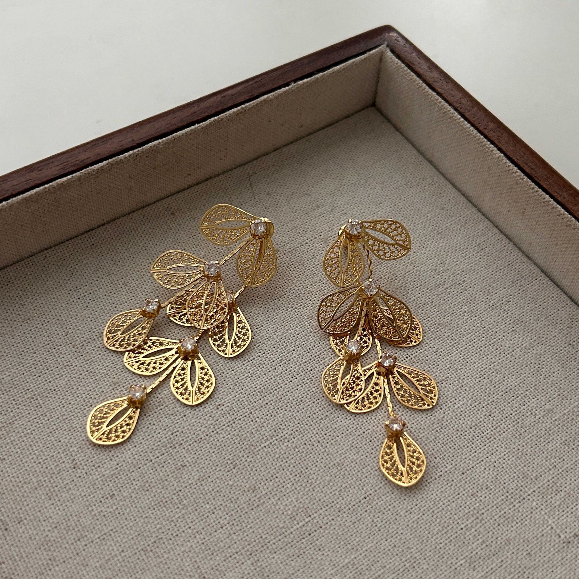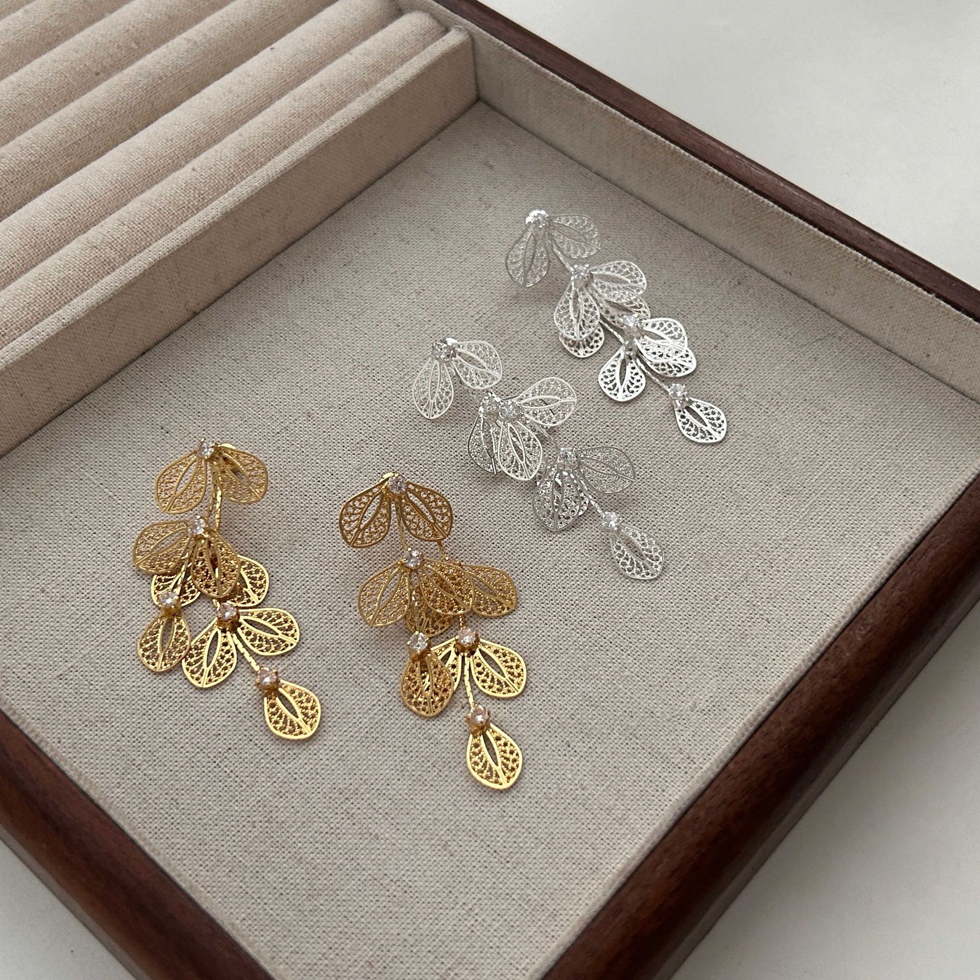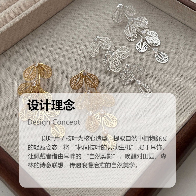 新款中式树叶花片流苏耳钉耳环轻奢高级感镶锆石小众设计耳环夸张