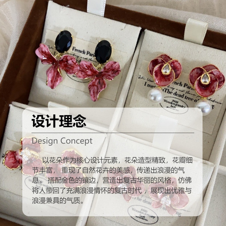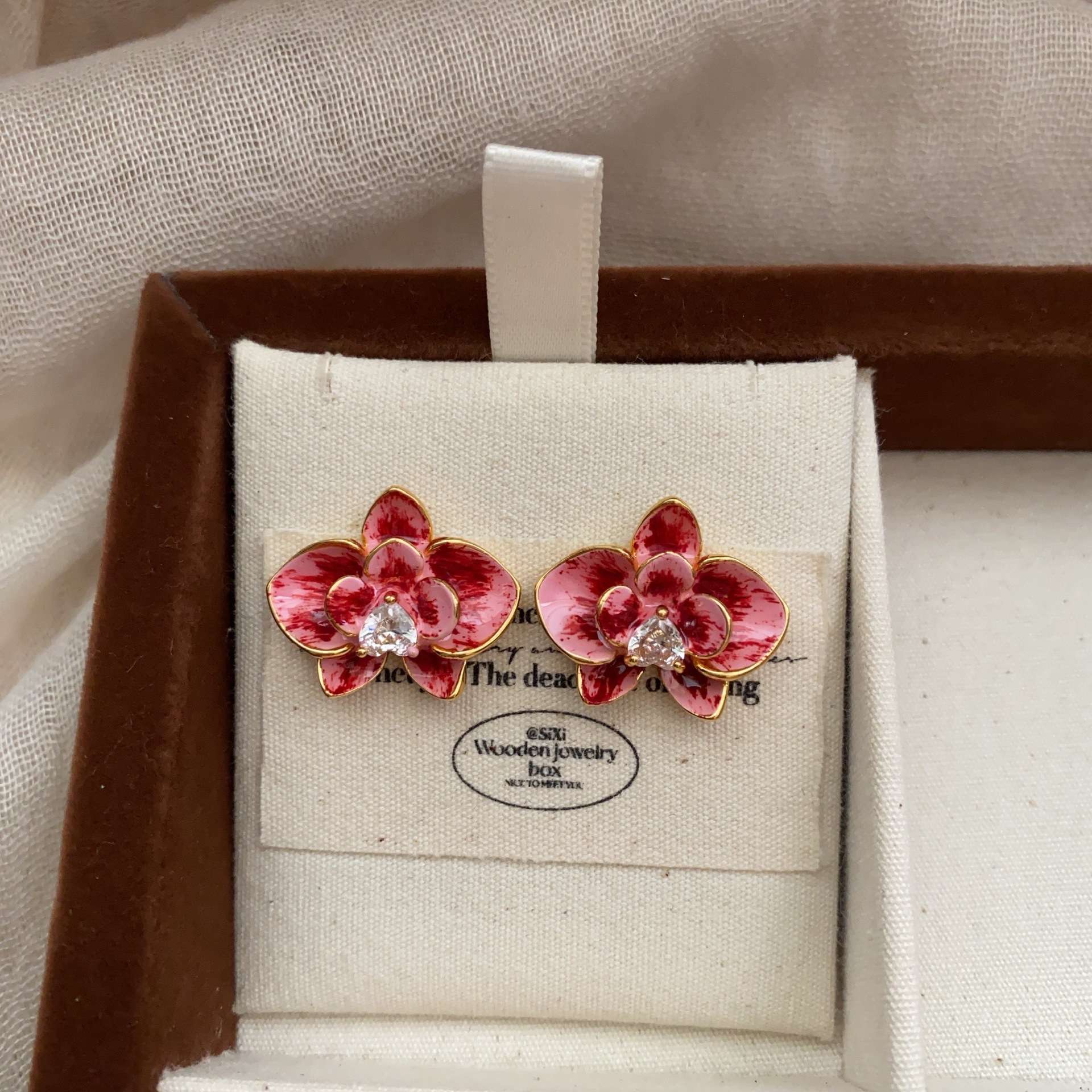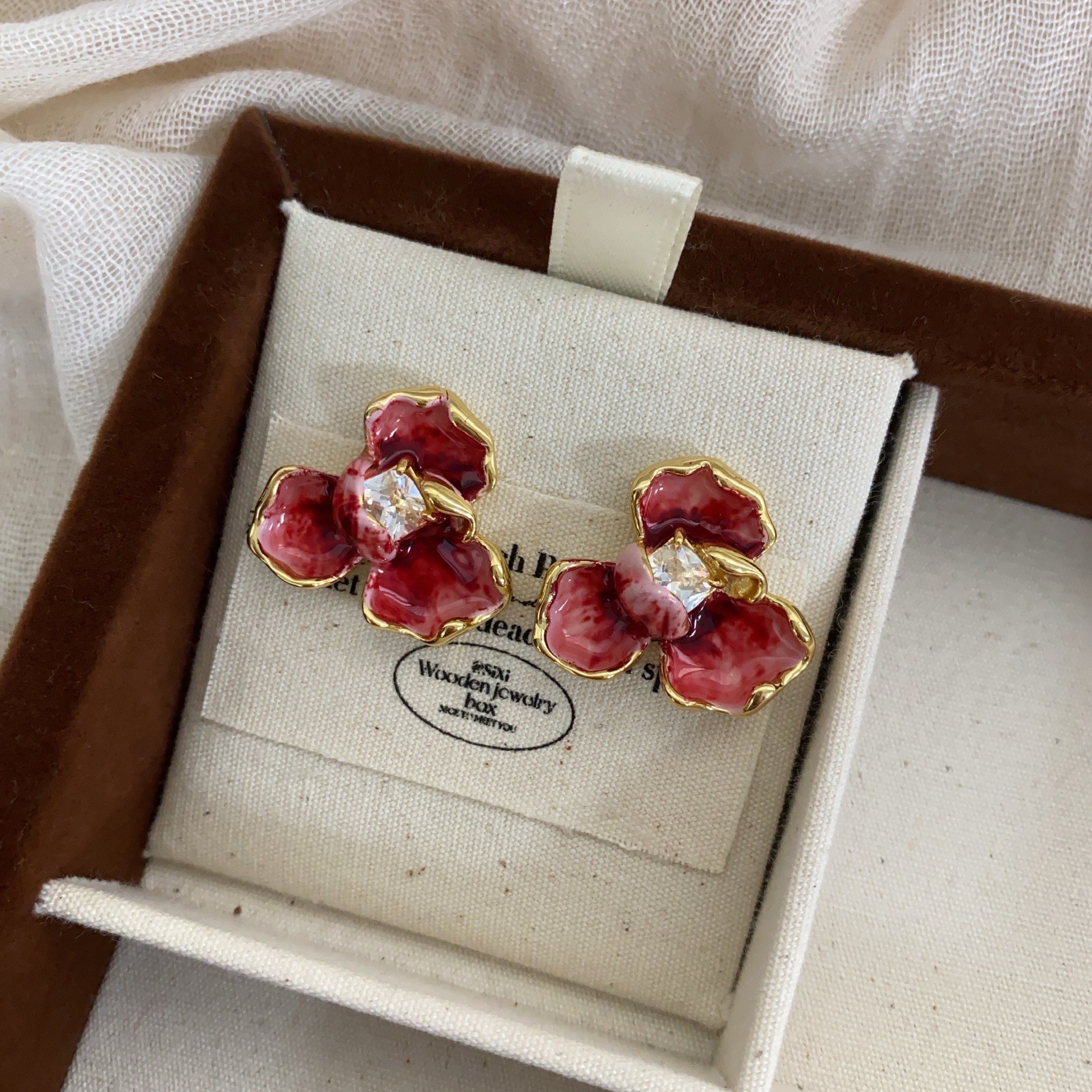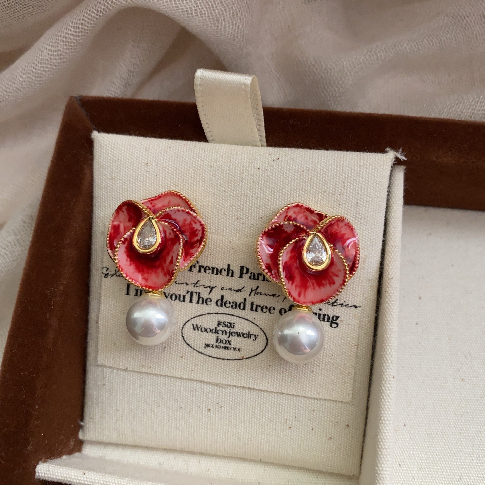珐琅工艺红色系花瓣锆石珍珠耳钉2025年新款耳环轻奢华丽气质耳饰