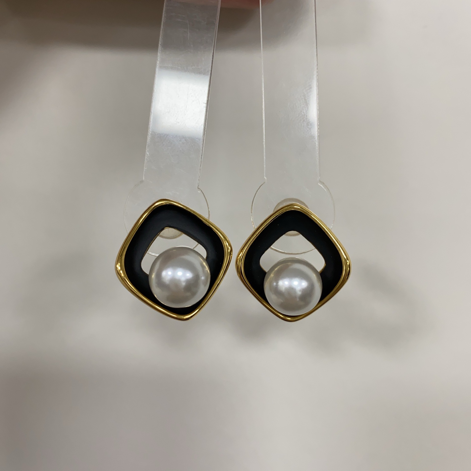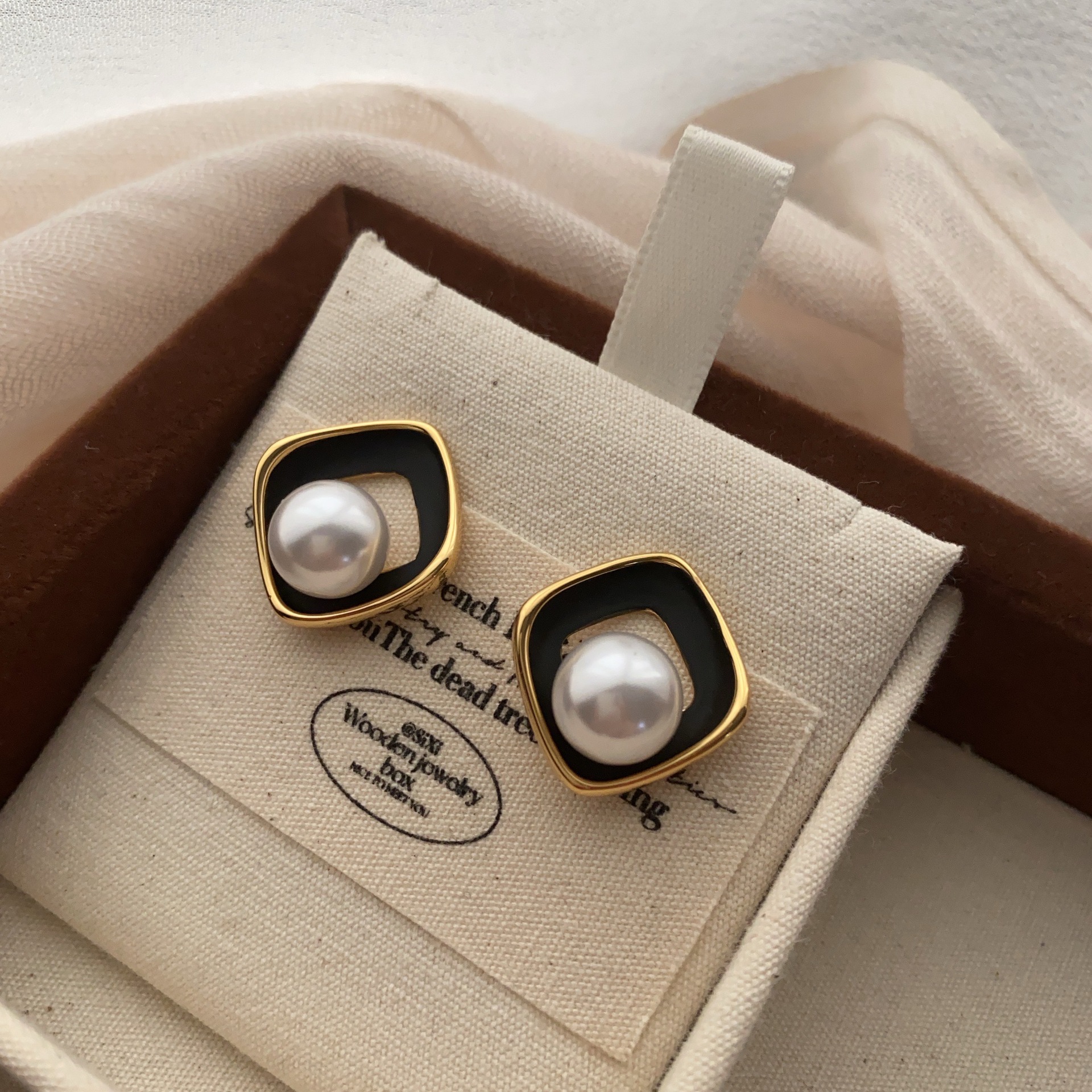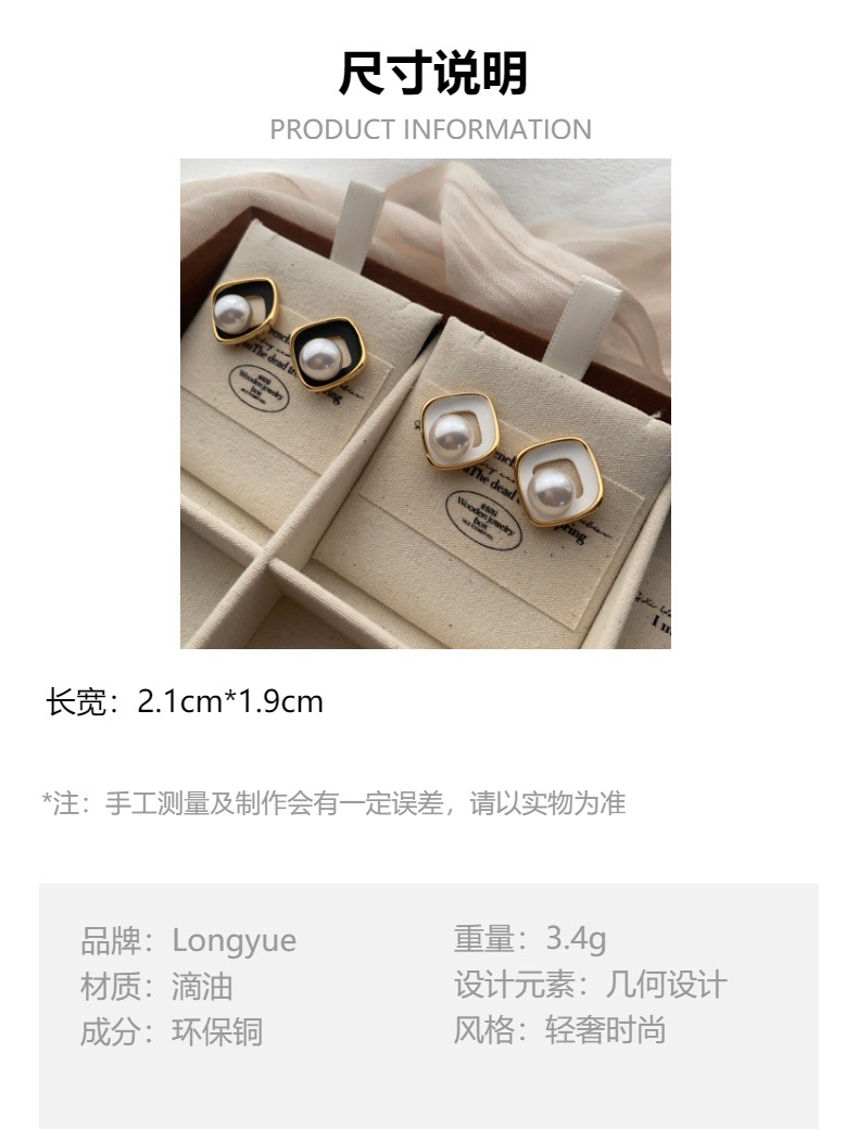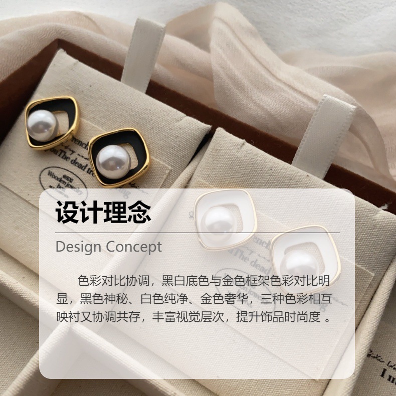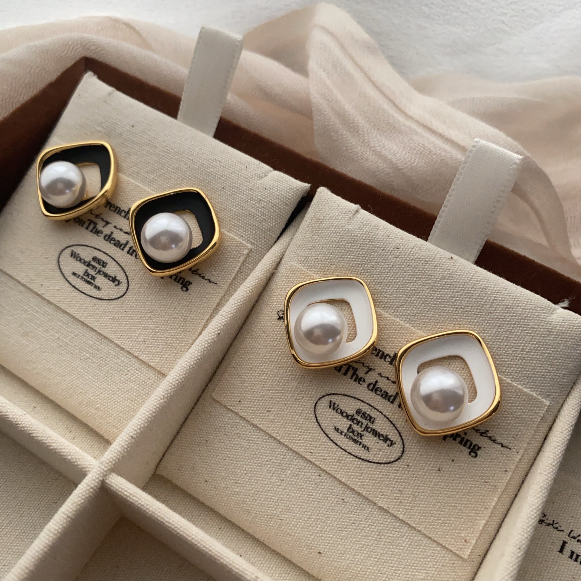 时尚气质珍珠耳钉白色复古女式几何型滴油黑白两色百搭通勤耳环女