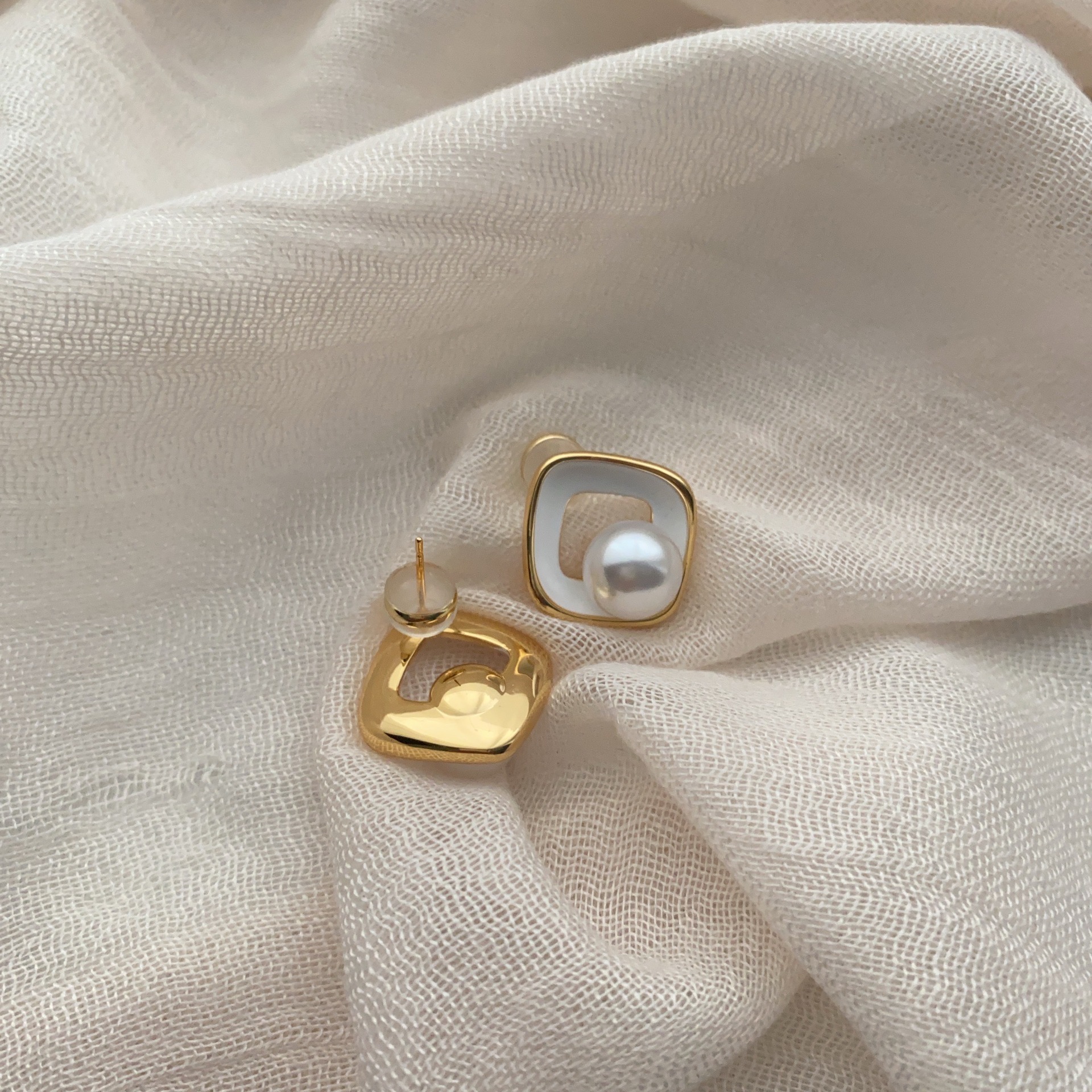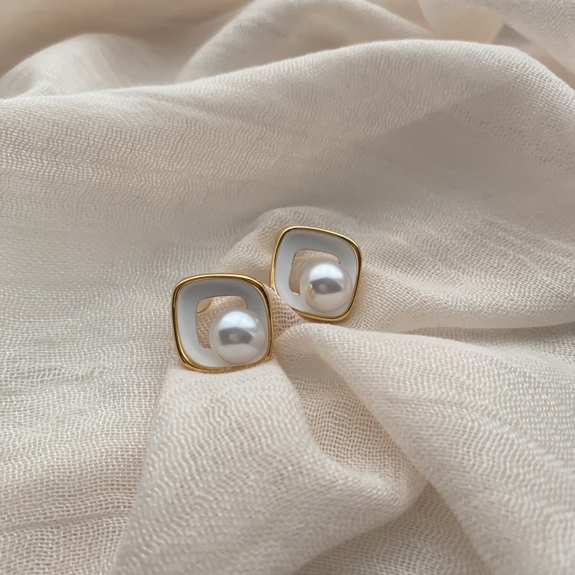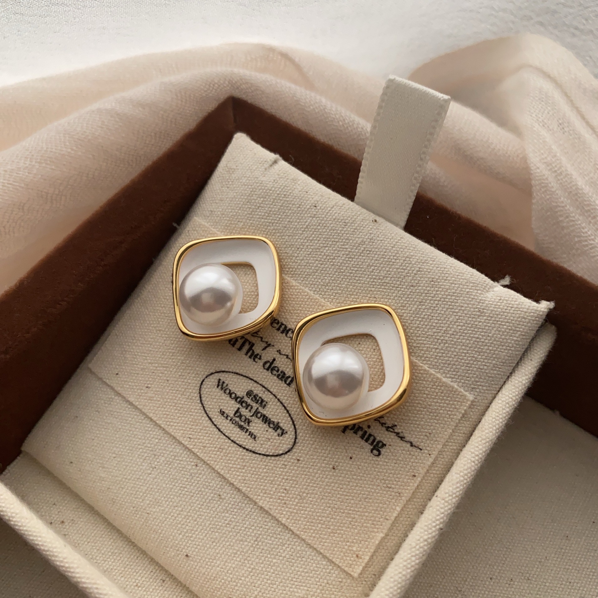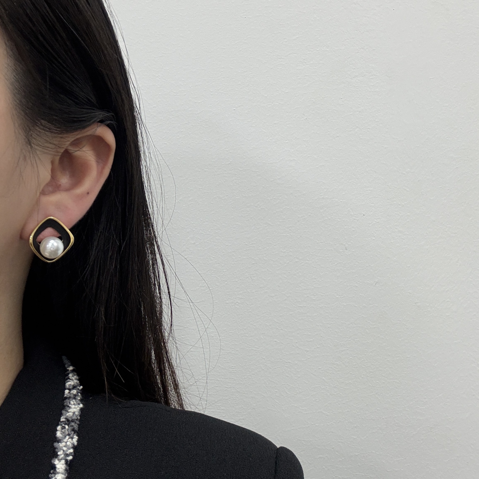 时尚气质珍珠耳钉白色复古女式几何型滴油黑白两色百搭通勤耳环女