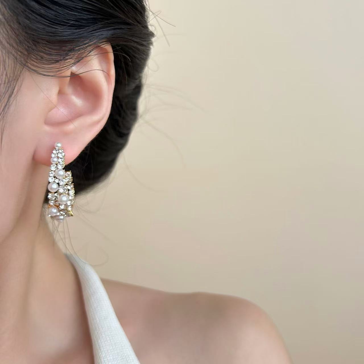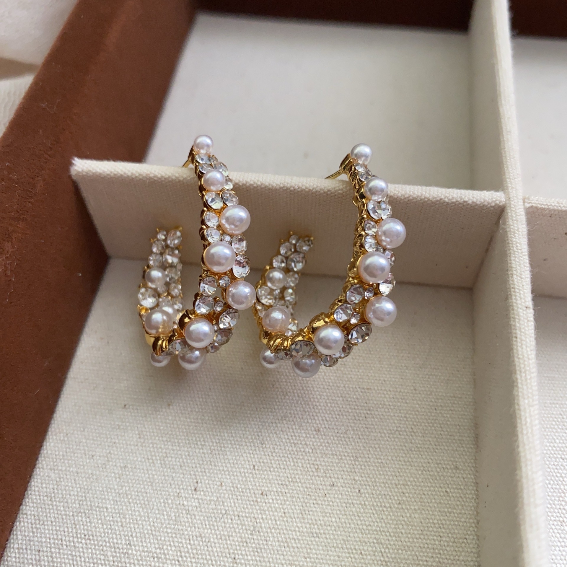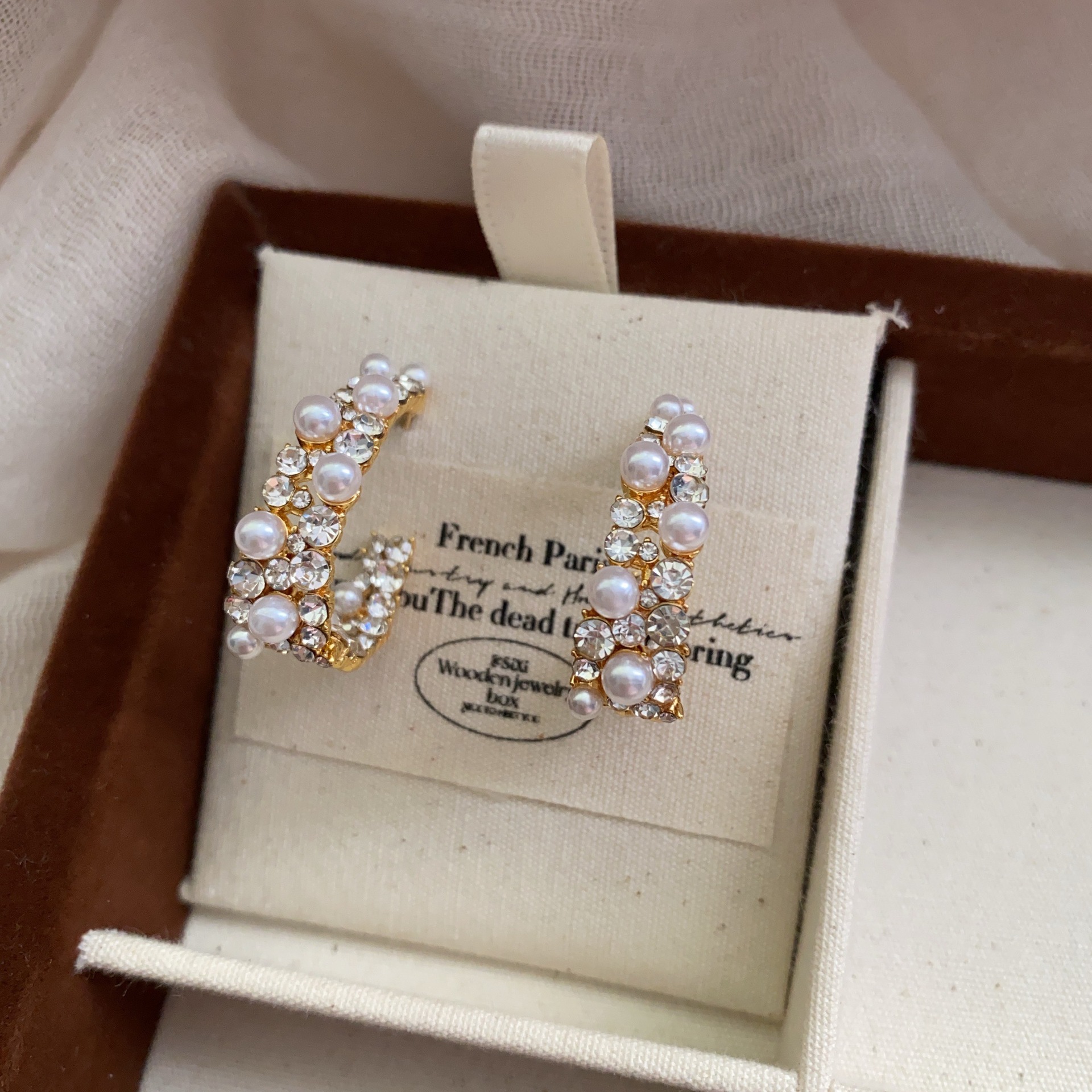 法式复古风镶钻珍珠C形耳钉轻奢高级感气质耳环2025年新款耳饰女