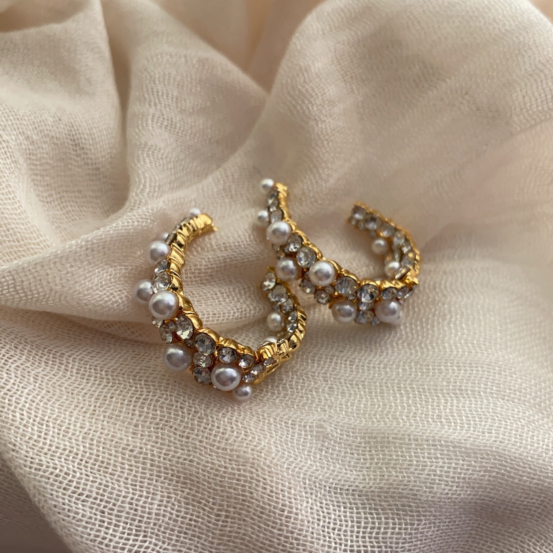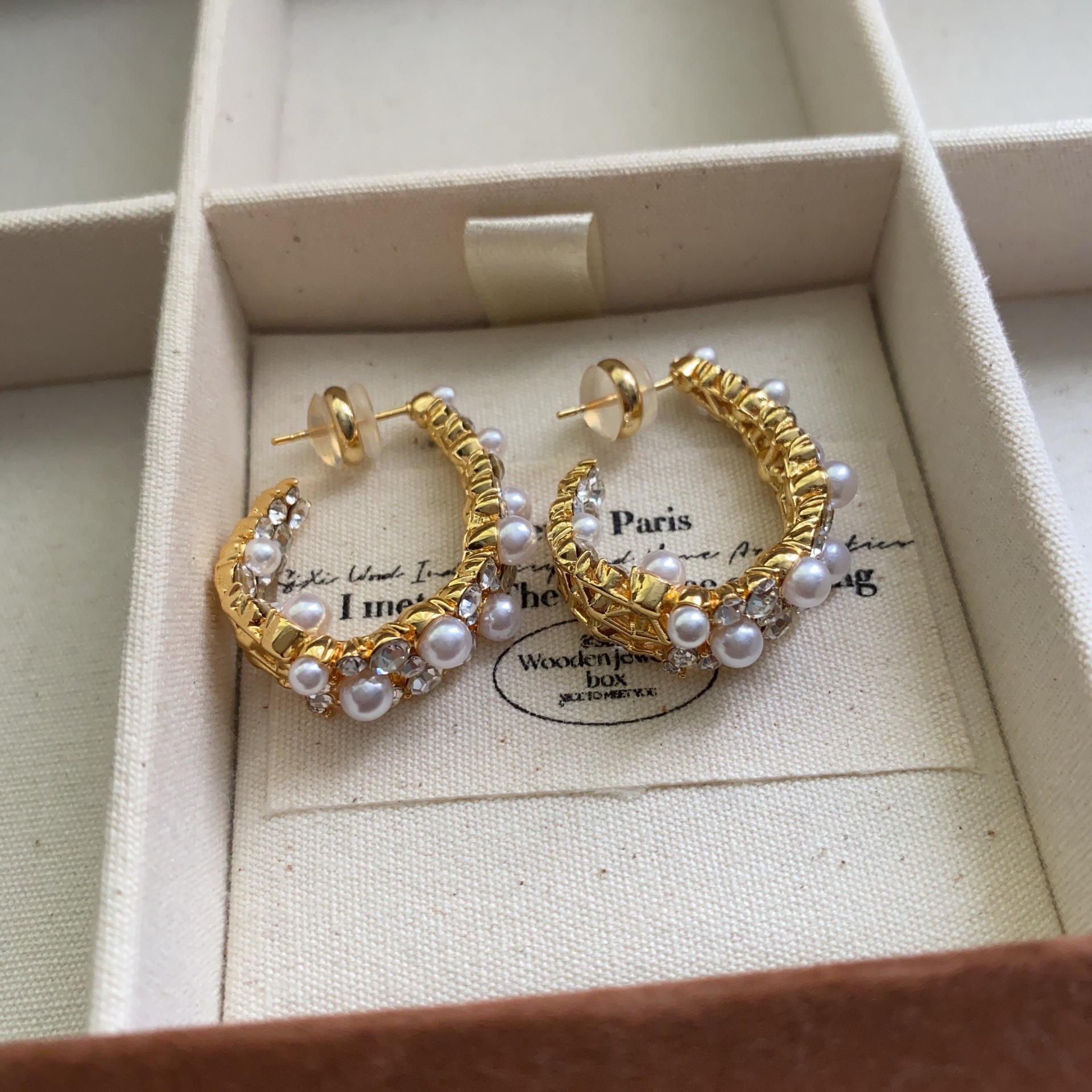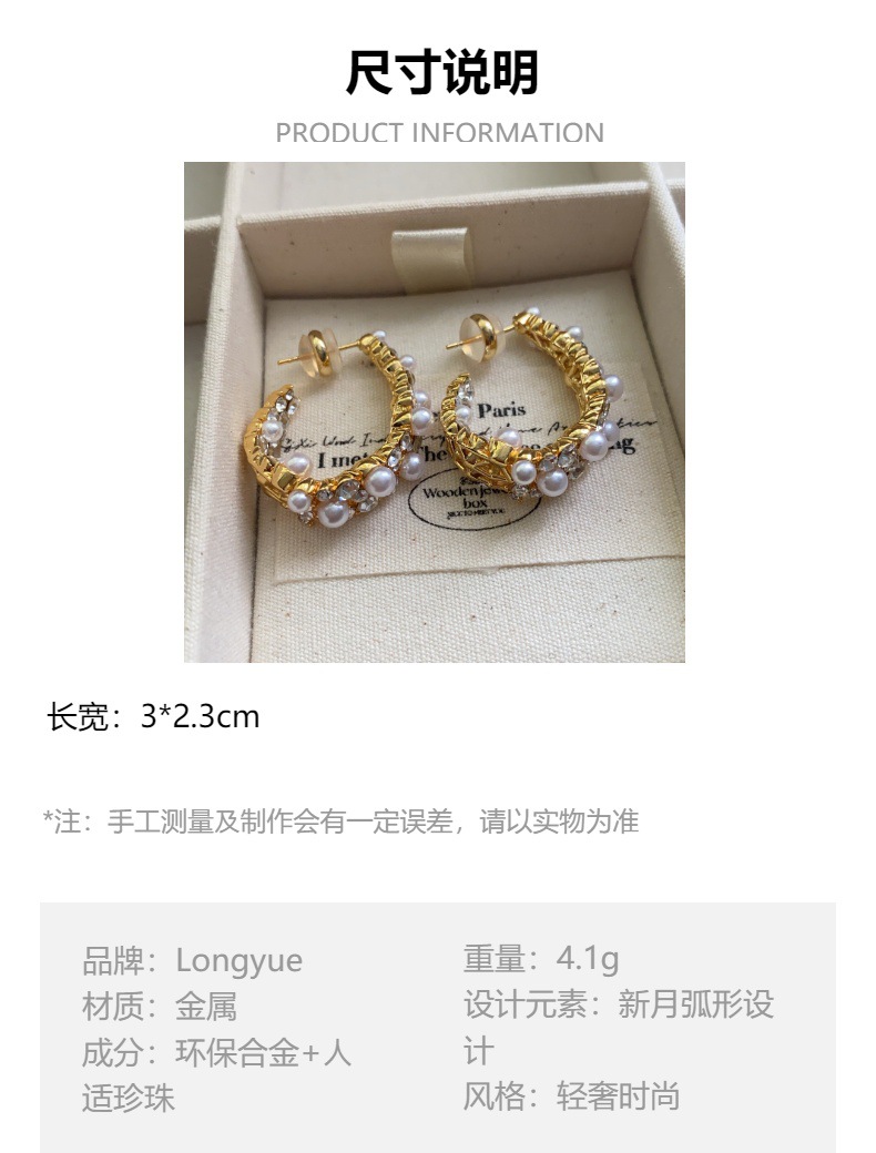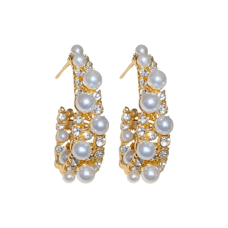 法式复古风镶钻珍珠C形耳钉轻奢高级感气质耳环2025年新款耳饰女