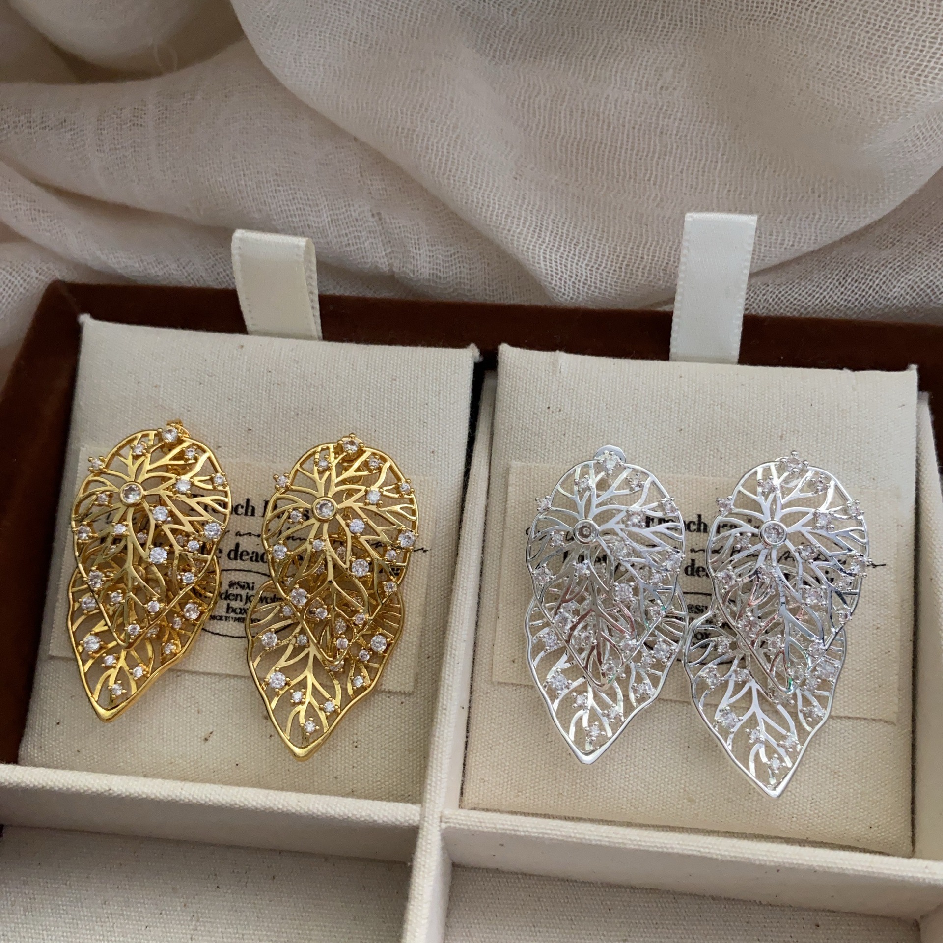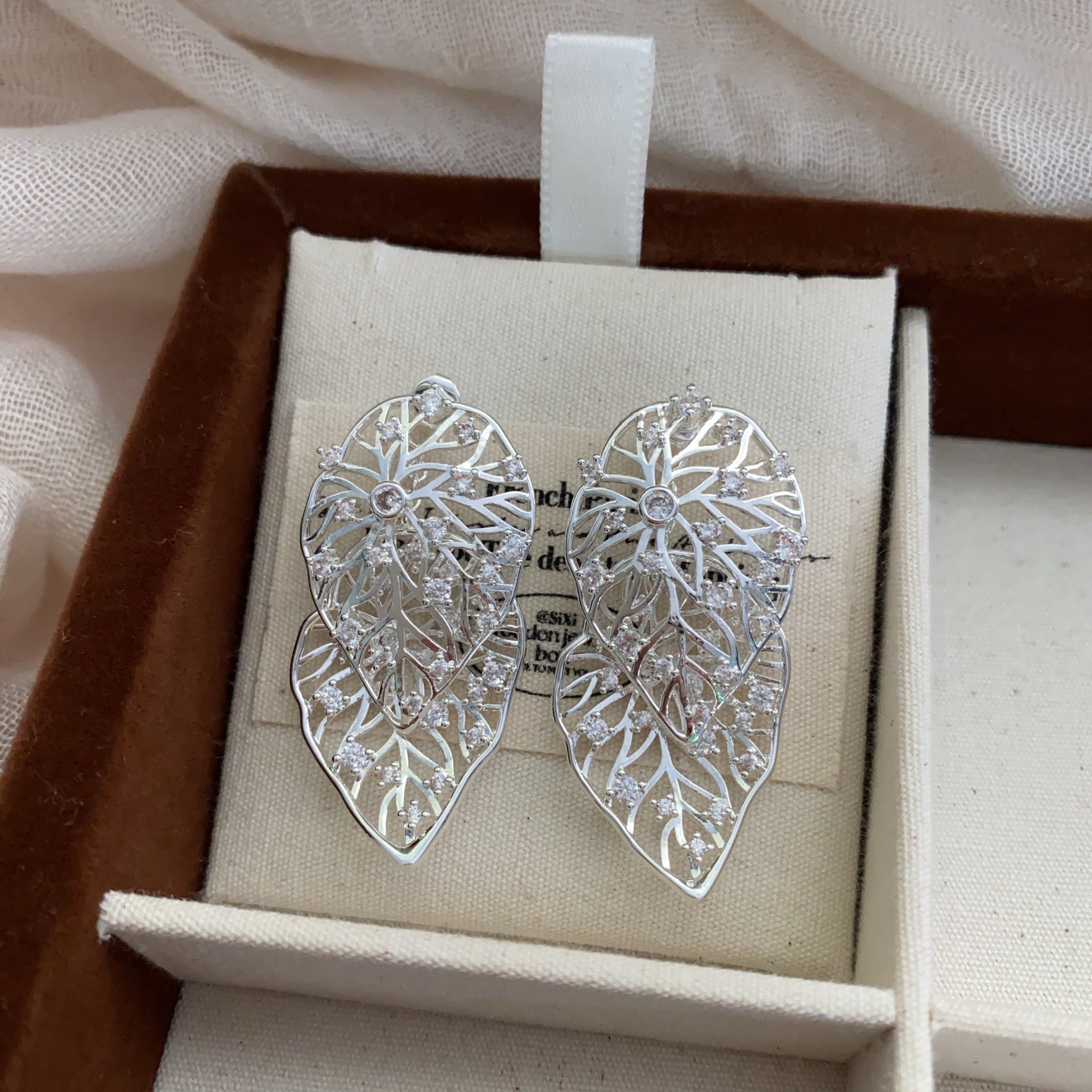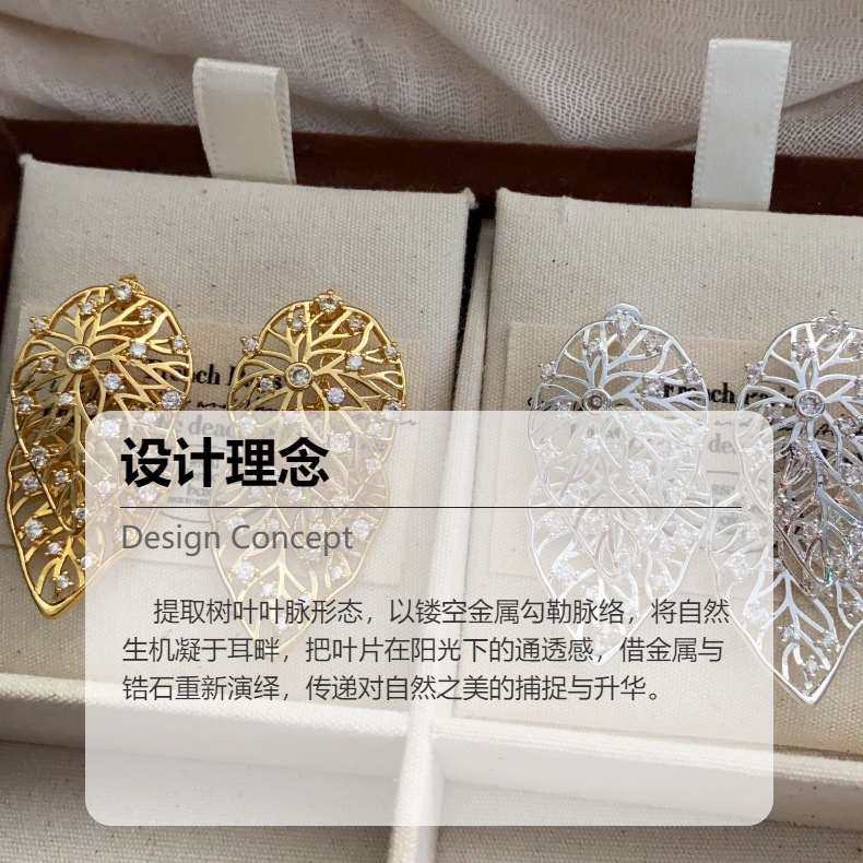 法式复古精致小众设计镂空波光粼粼叶片耳环一款两戴皓石点缀耳钉