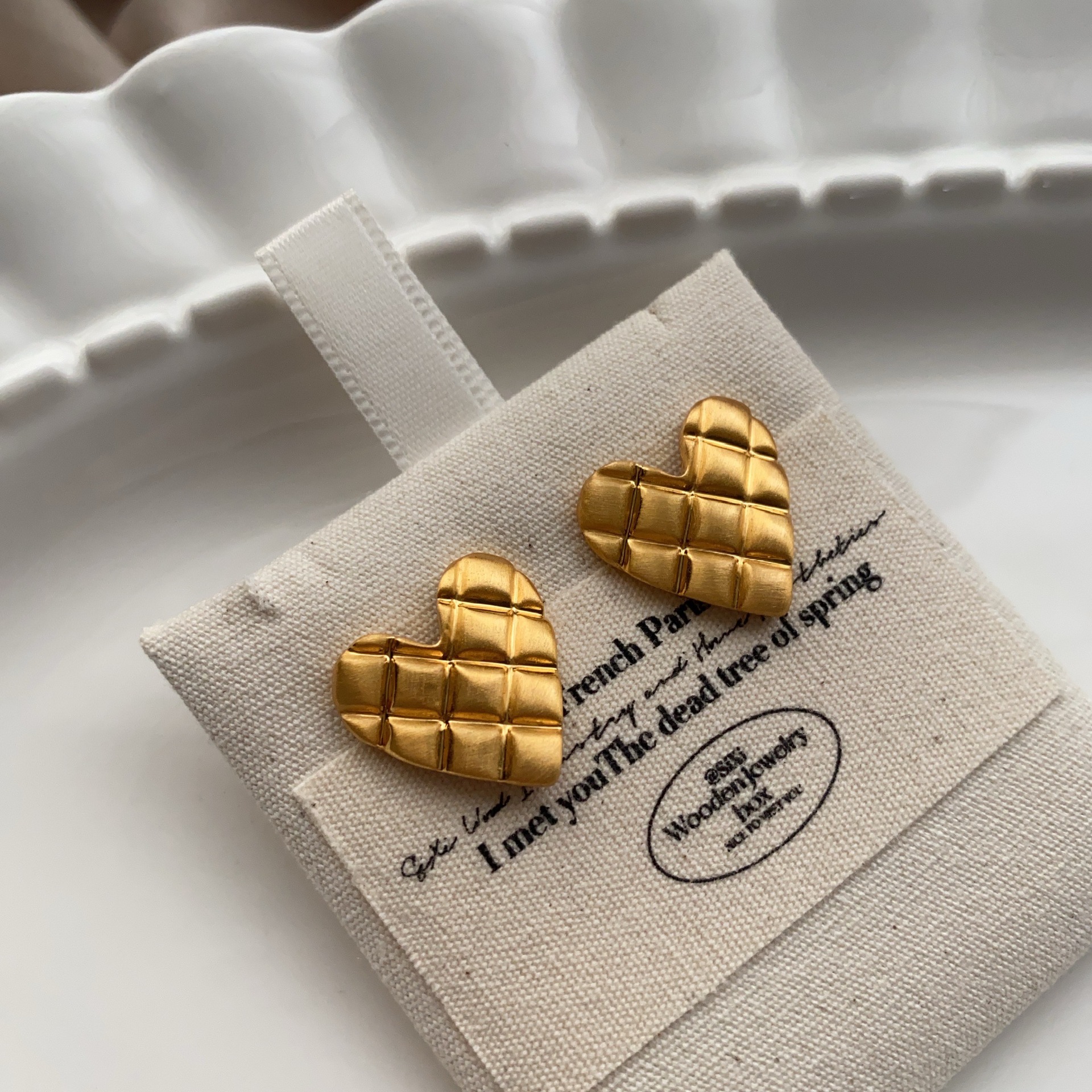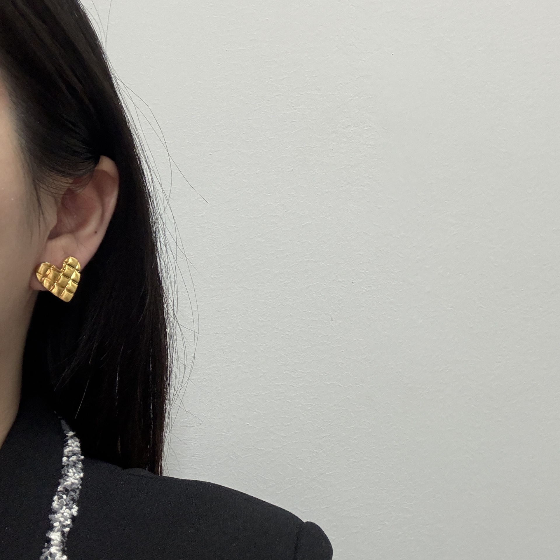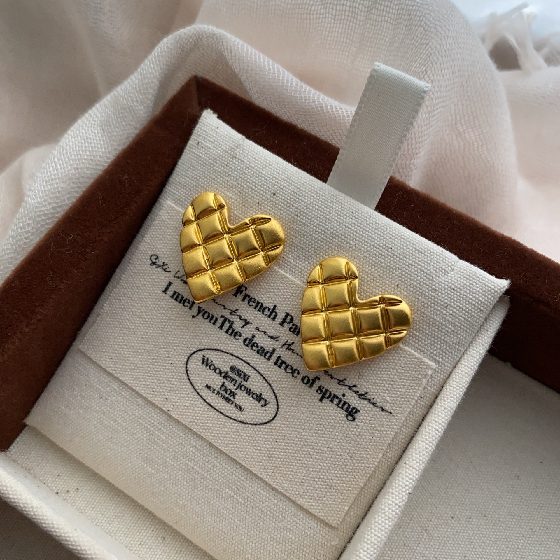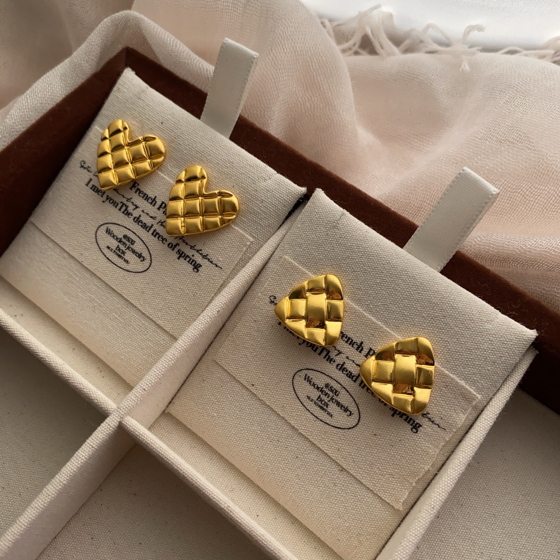 小众设计爱心款耳钉时尚气质金色菱格爱心心形个性百搭通勤耳饰女