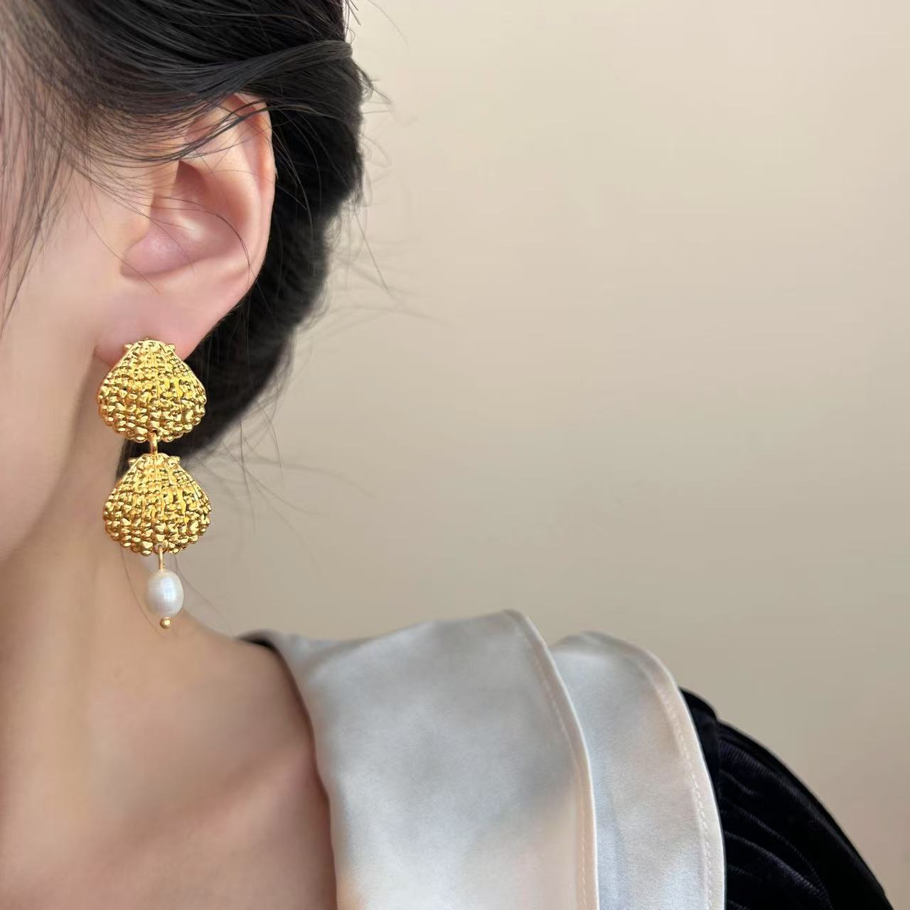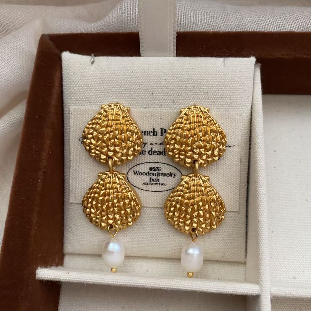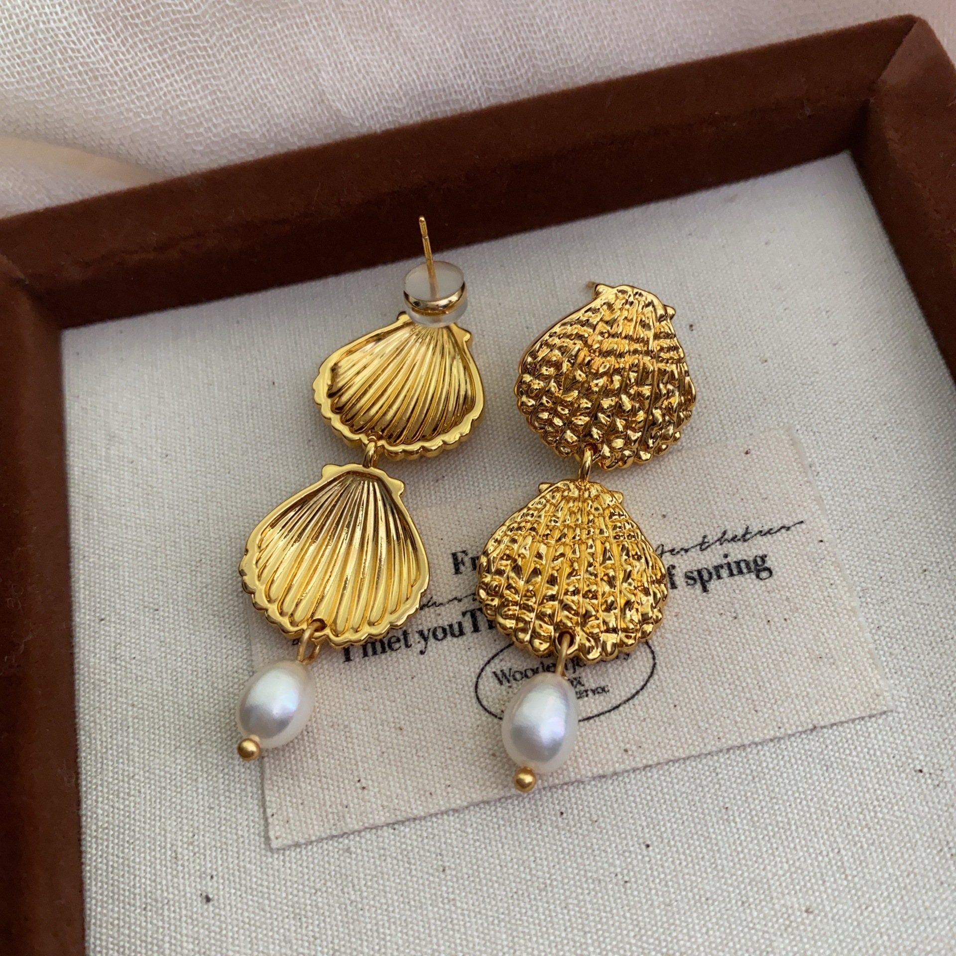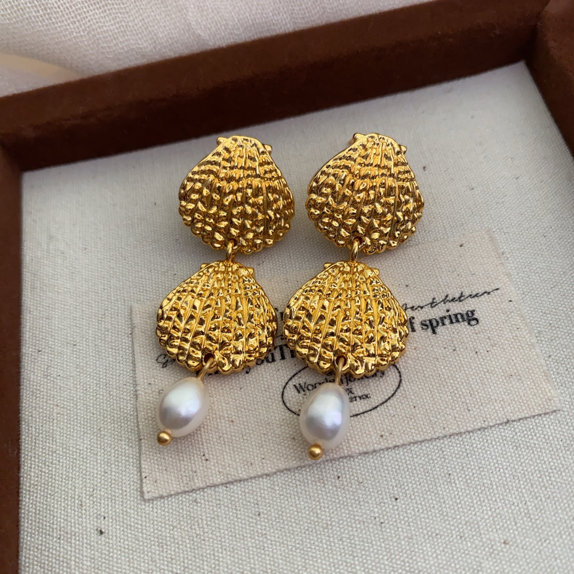 新款欧美时尚简约珍珠流苏耳钉金属贝壳气质优雅贝壳耳坠流行耳环
