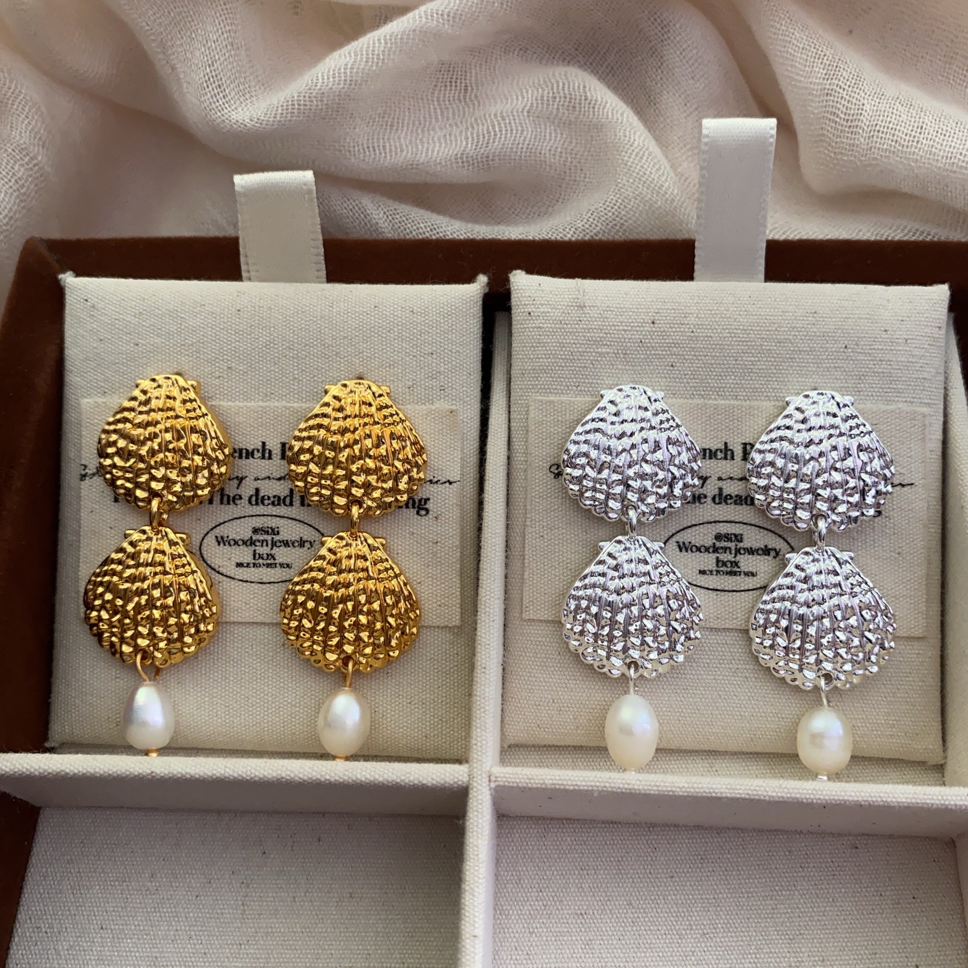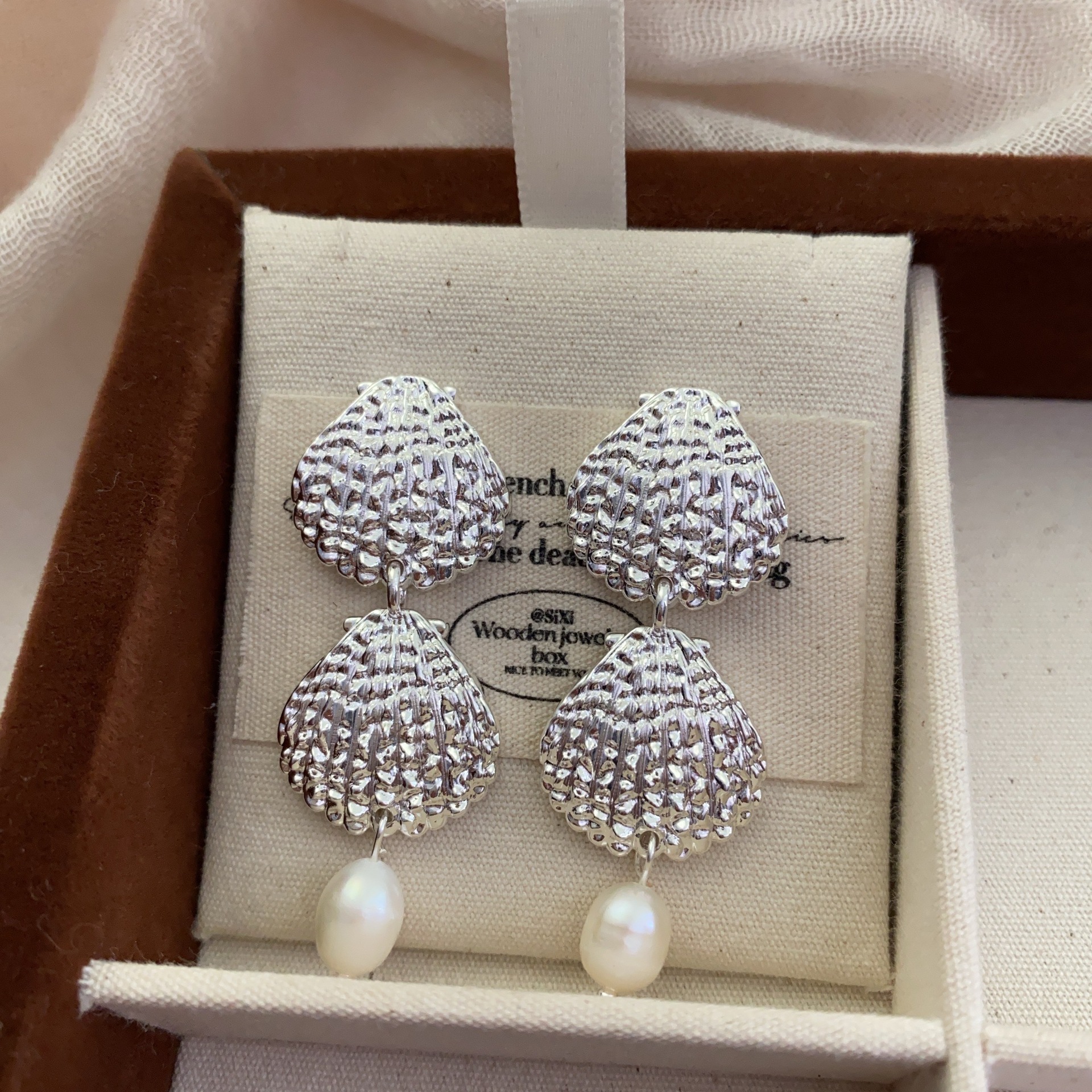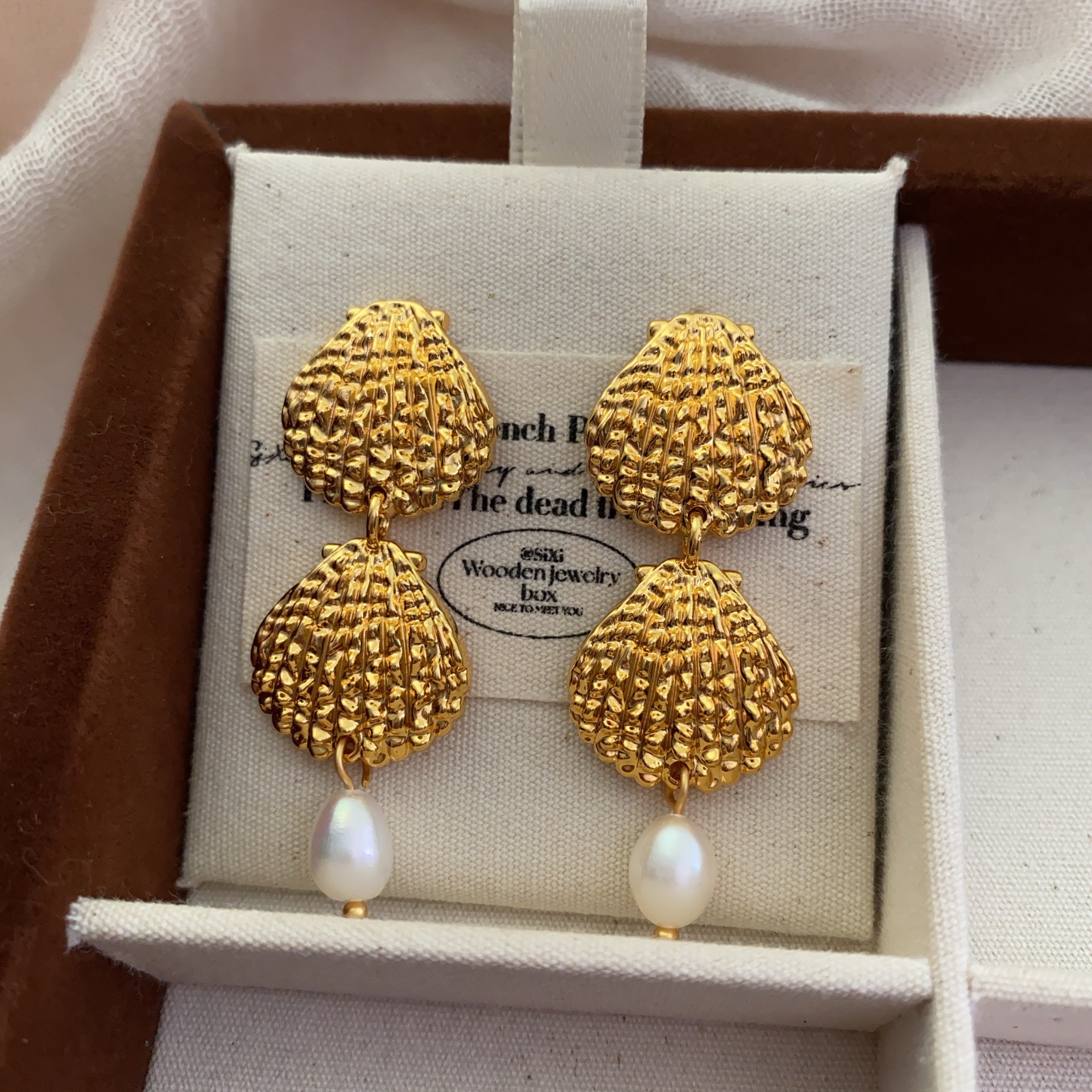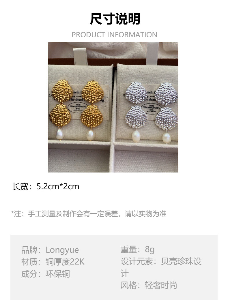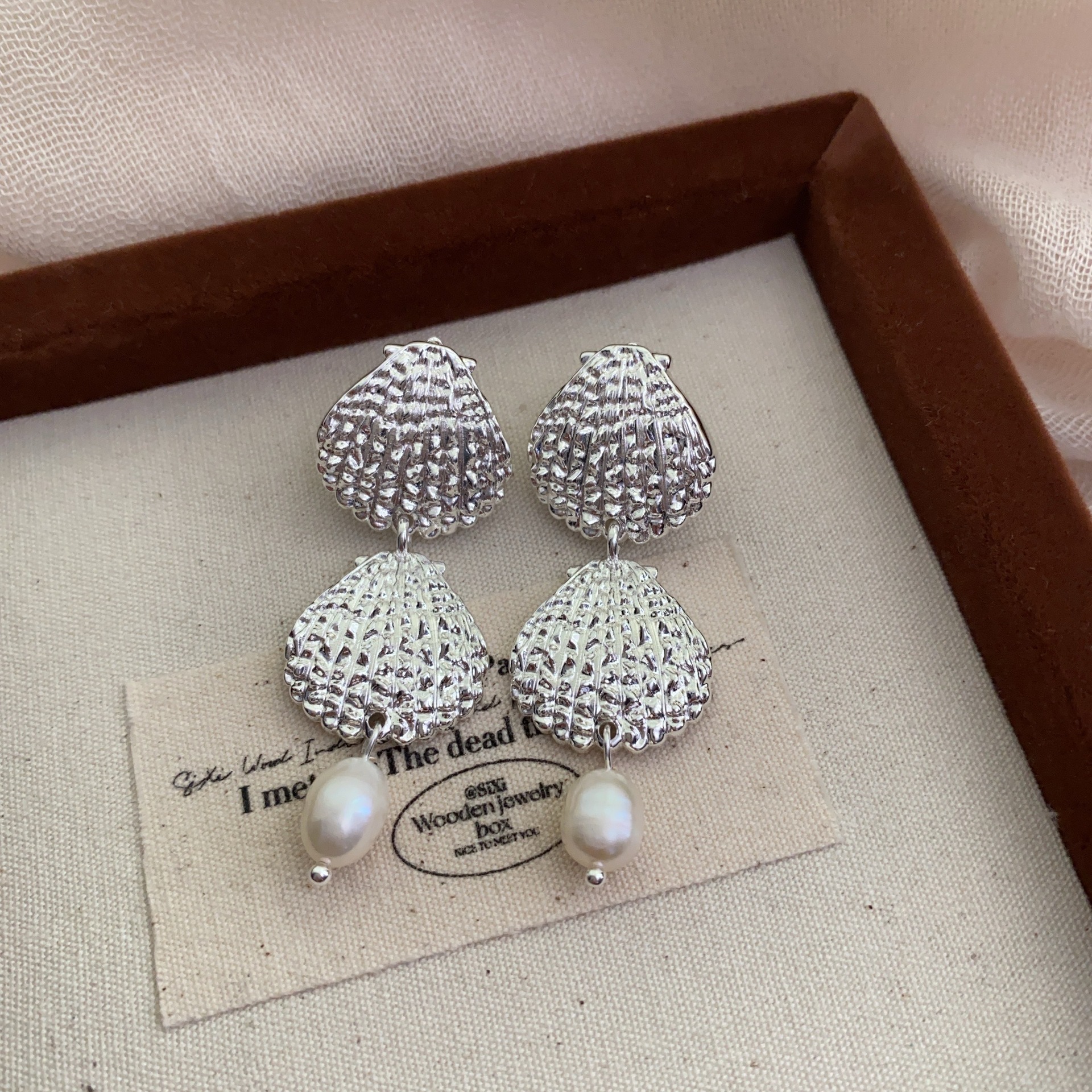 新款欧美时尚简约珍珠流苏耳钉金属贝壳气质优雅贝壳耳坠流行耳环