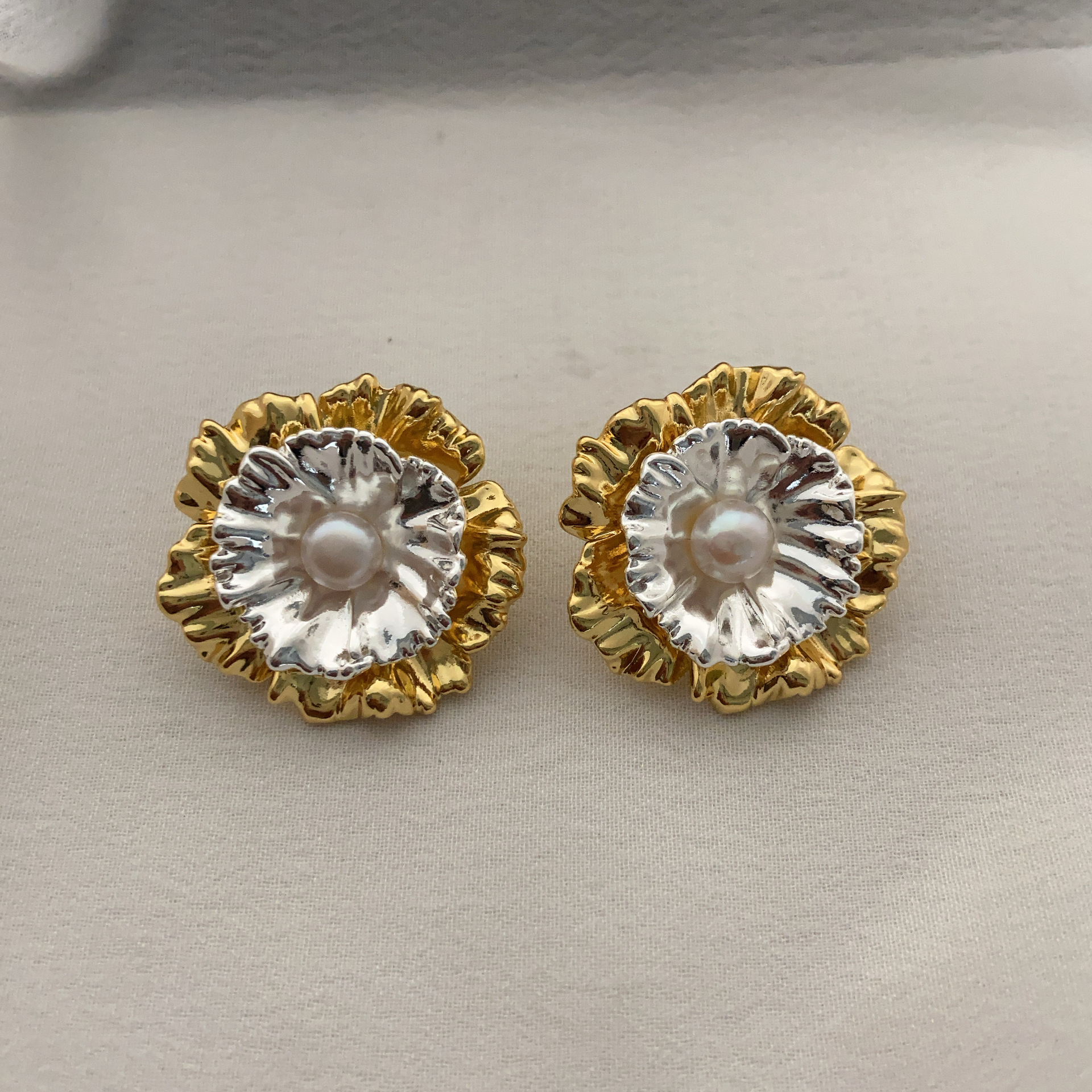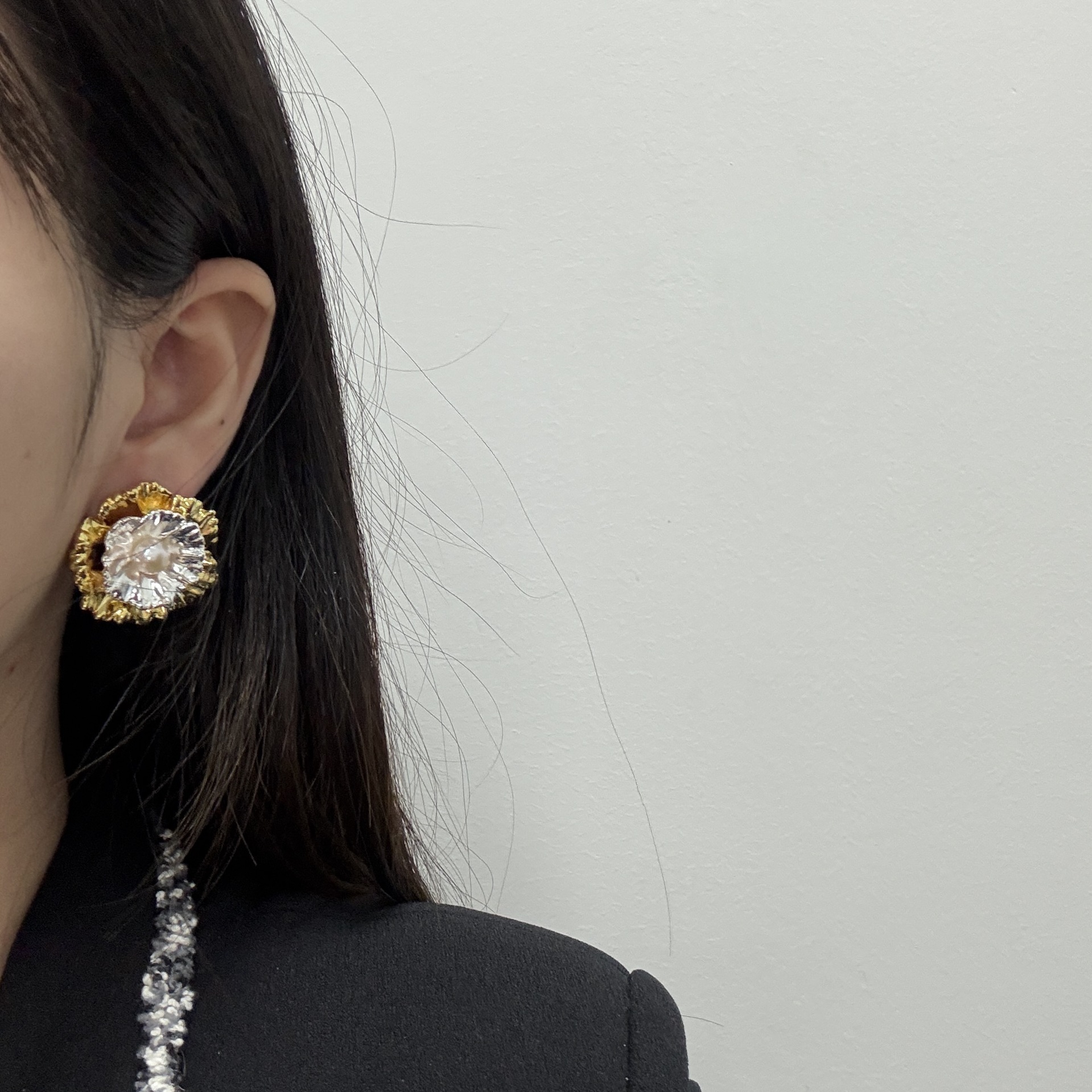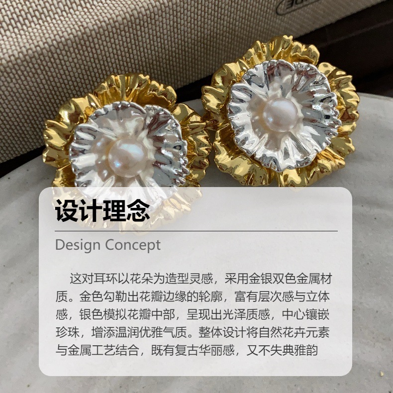 一款多戴耳饰金银撞色花朵耳钉金属感冷淡风重工精致时尚百搭耳环
