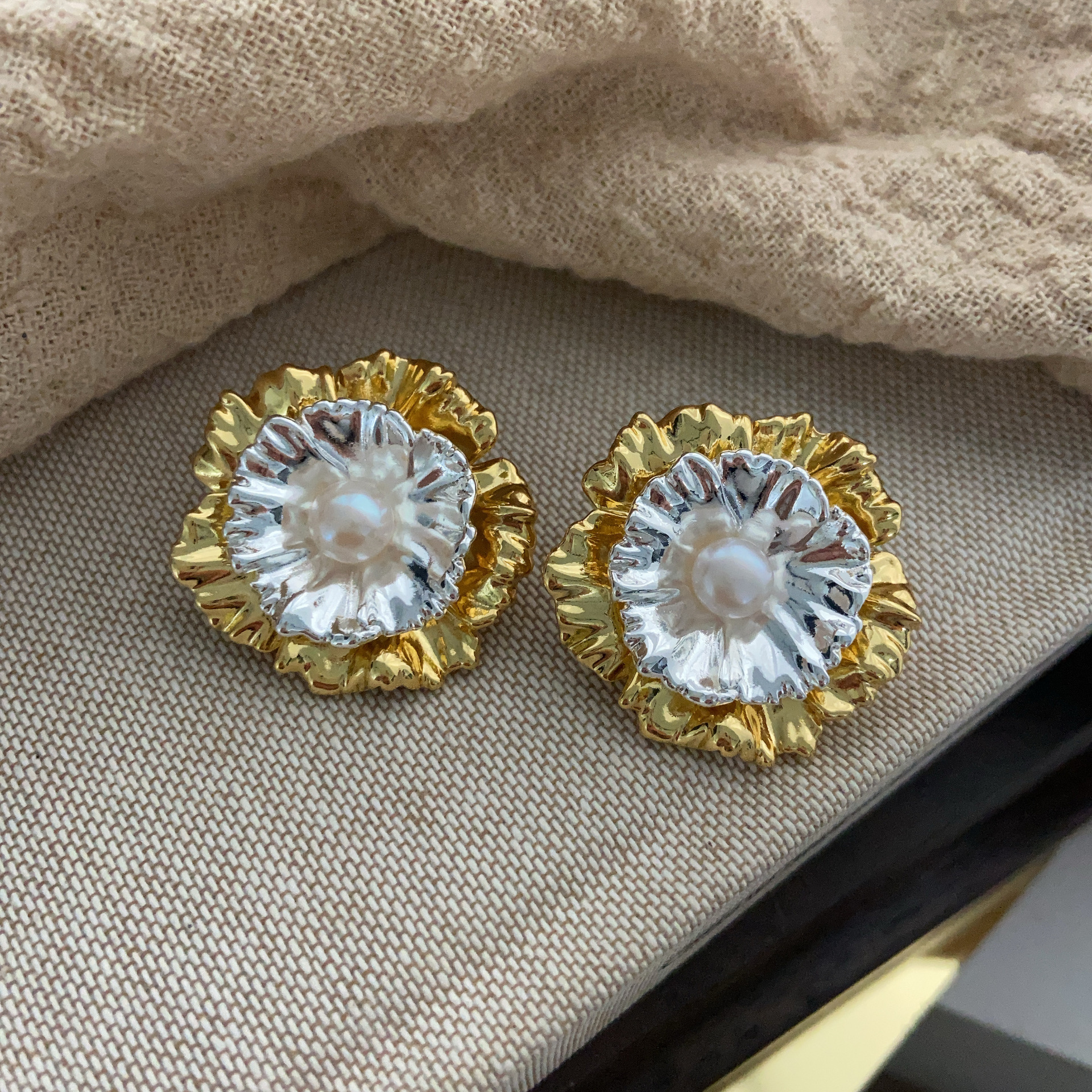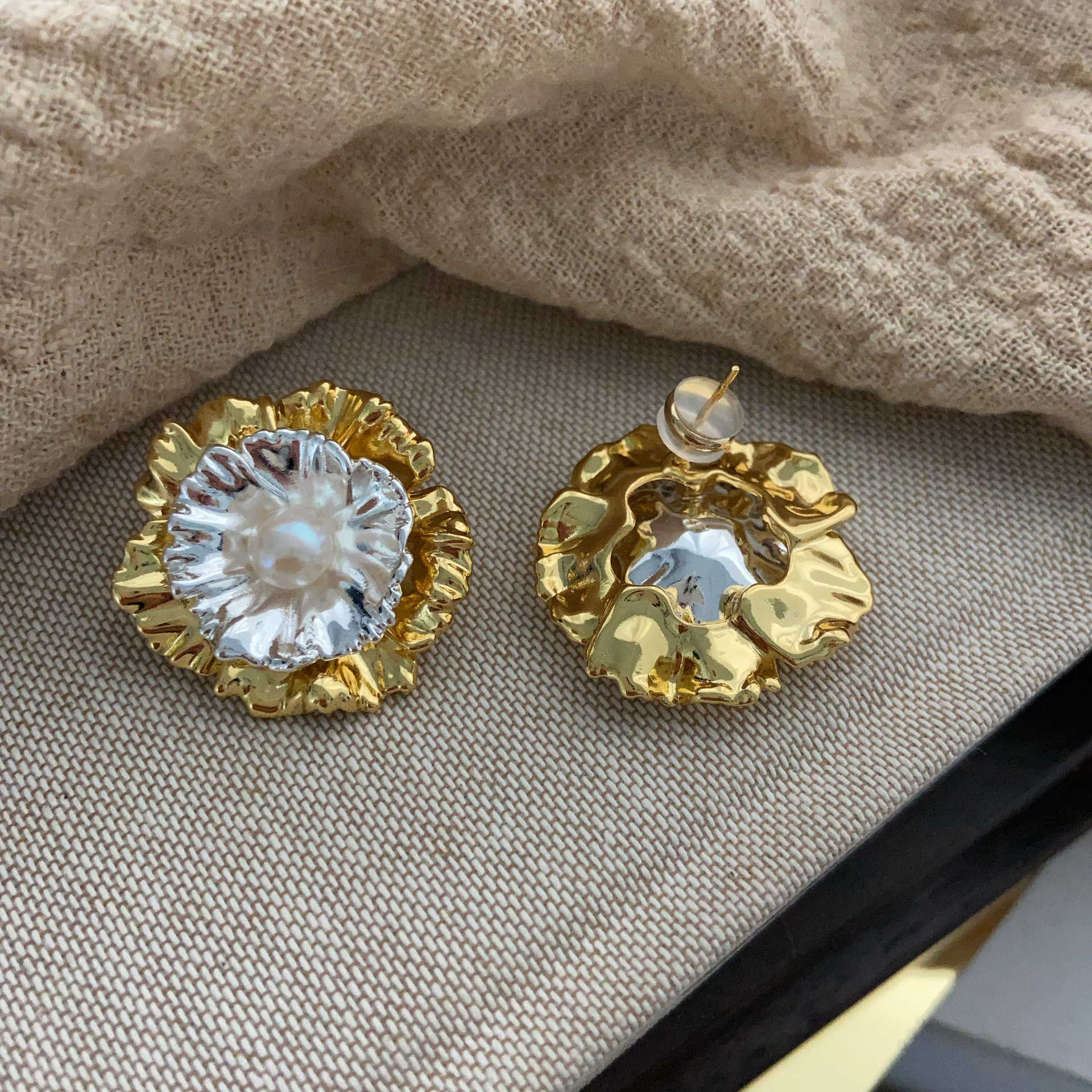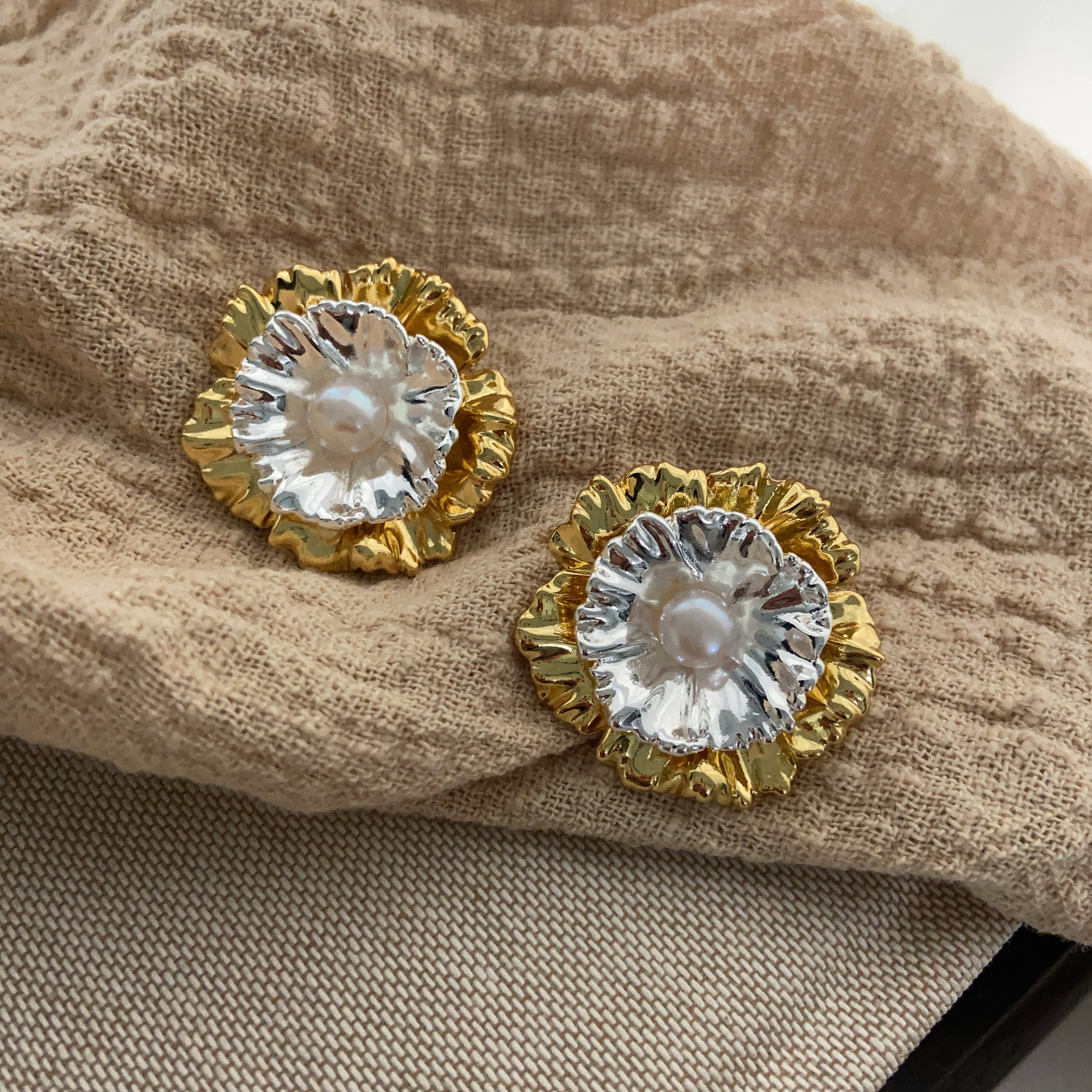 一款多戴耳饰金银撞色花朵耳钉金属感冷淡风重工精致时尚百搭耳环