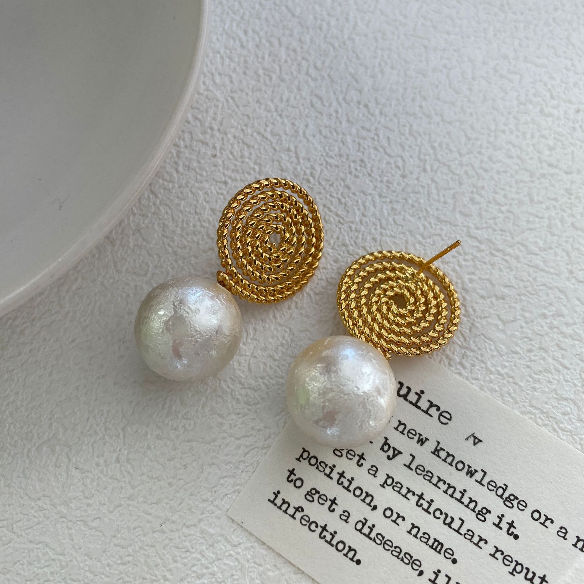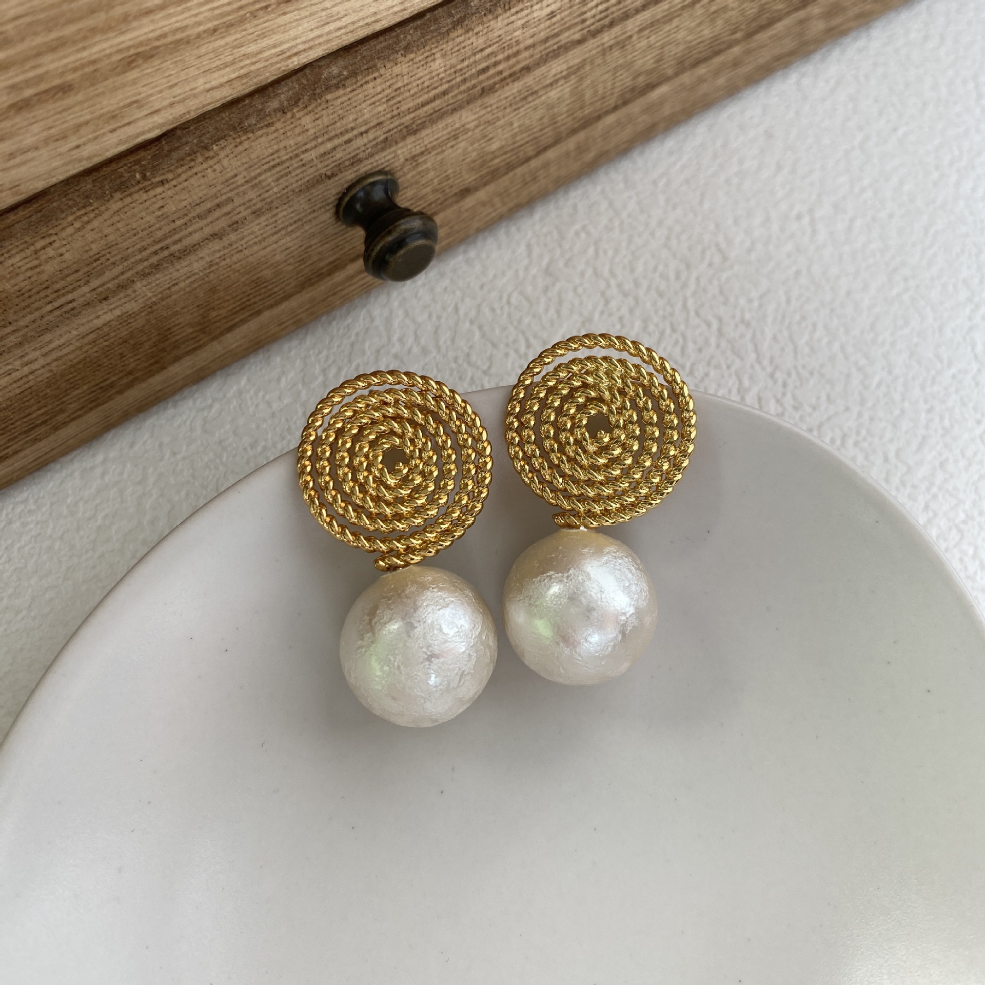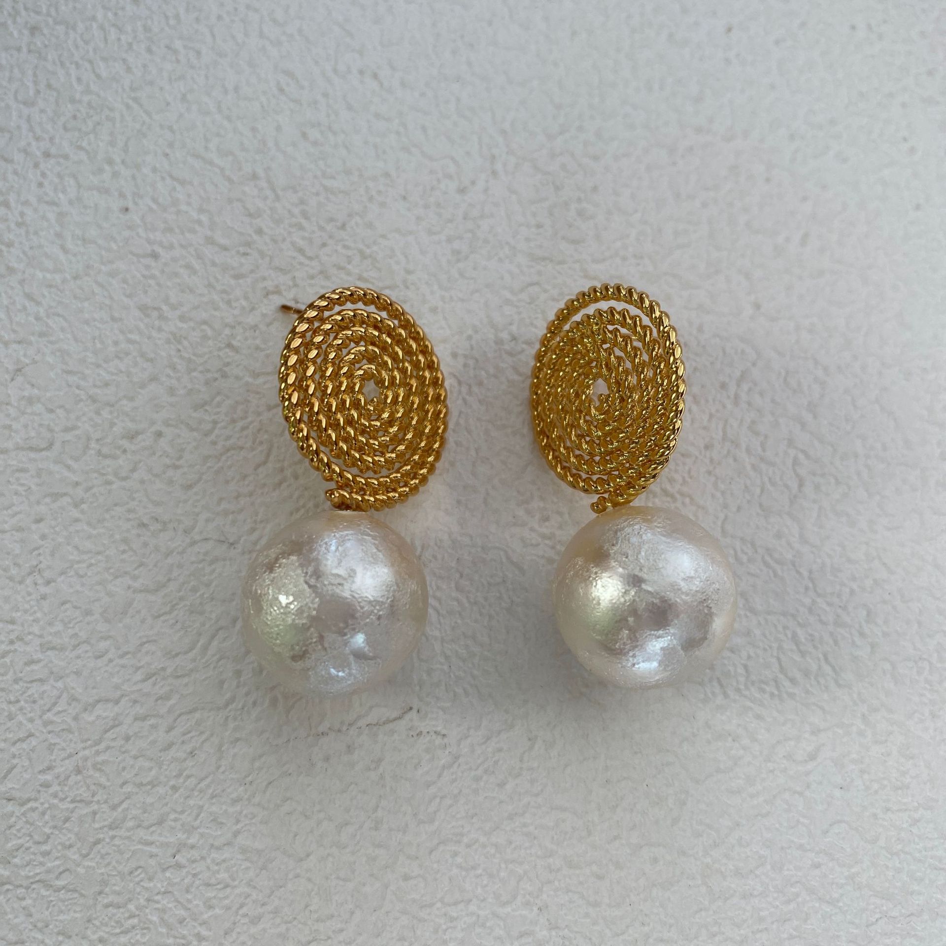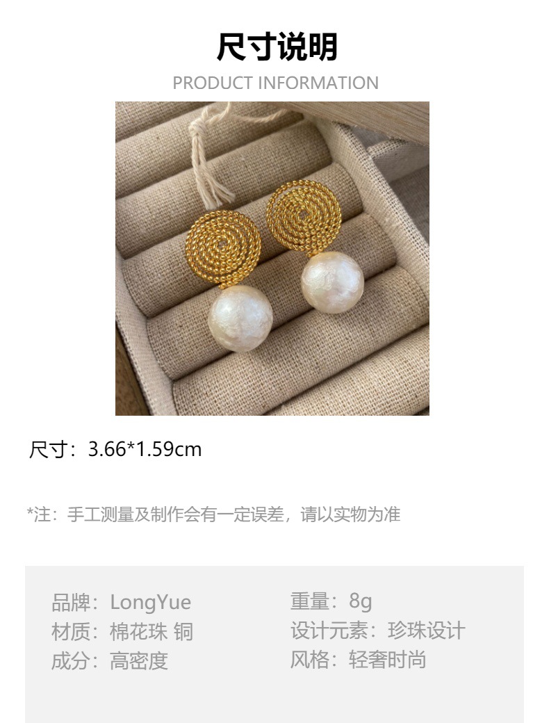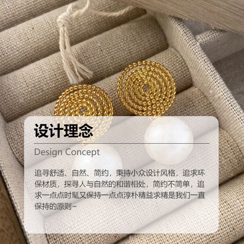 法式高级感耳环欧美新款螺旋草编织搭配棉花珍珠轻奢简约耳钉女