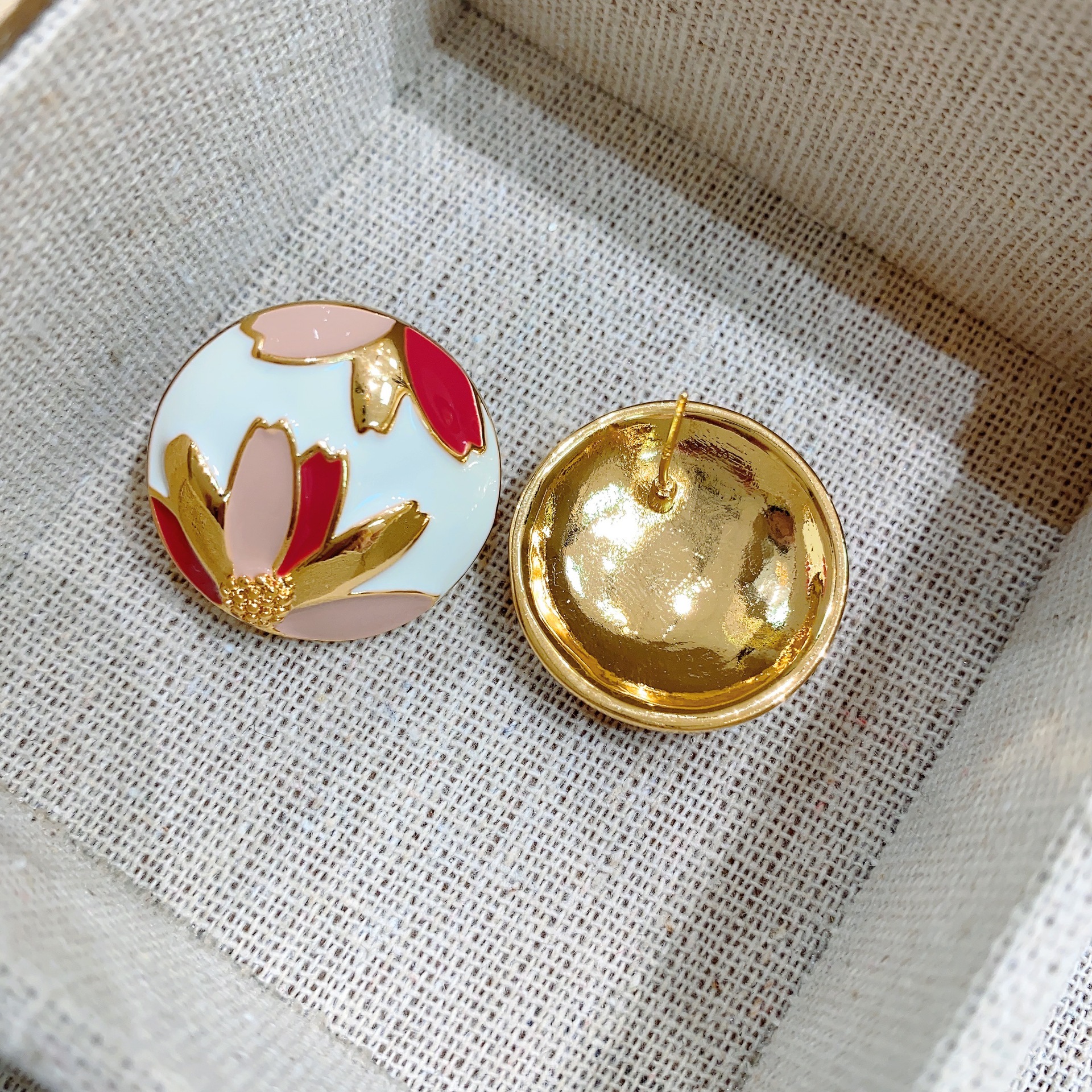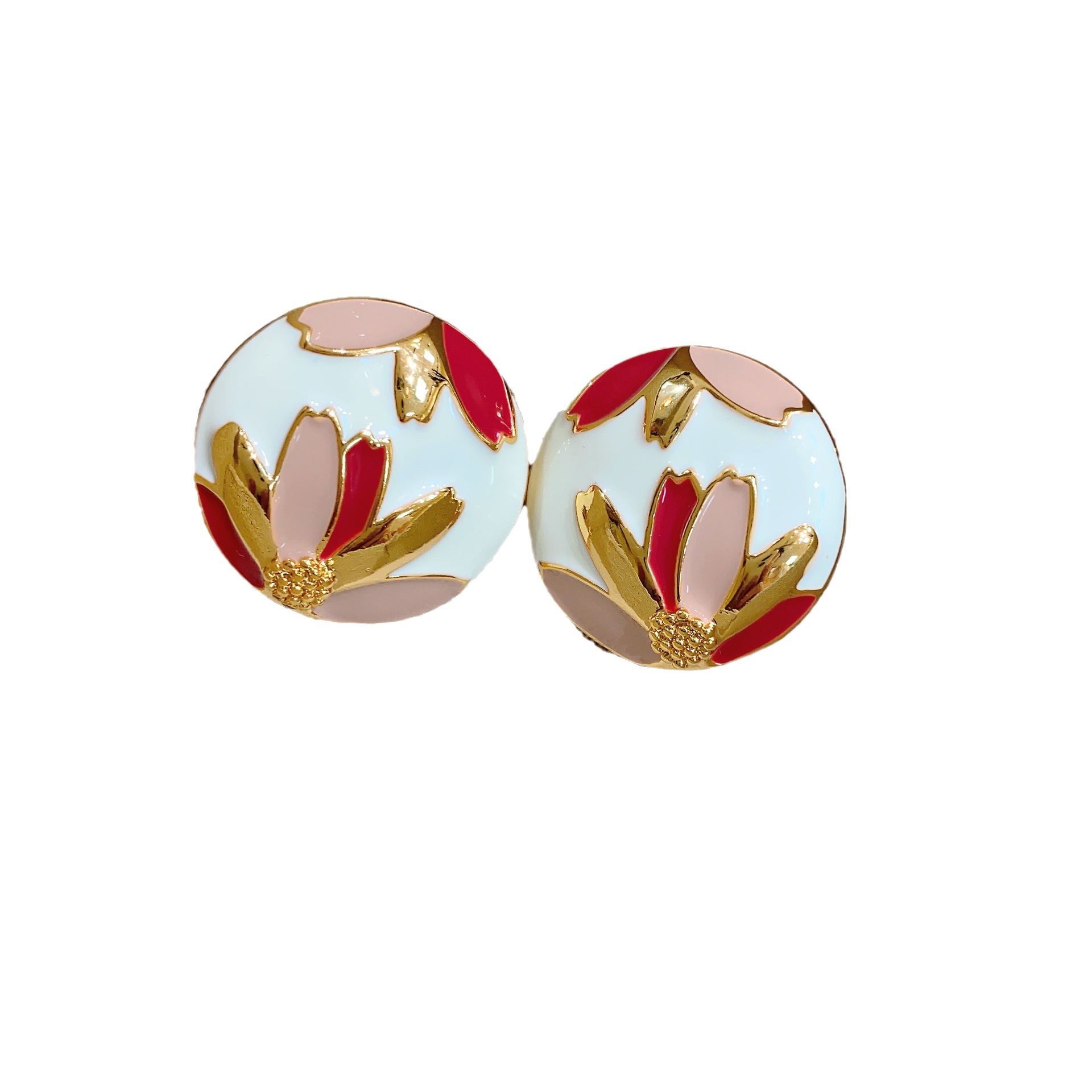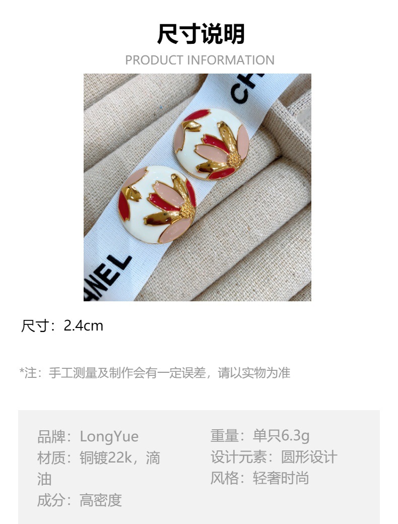 欧美法式复古耳环合金滴油耳钉女圆形时尚花卉图案韩版耳饰冷淡风