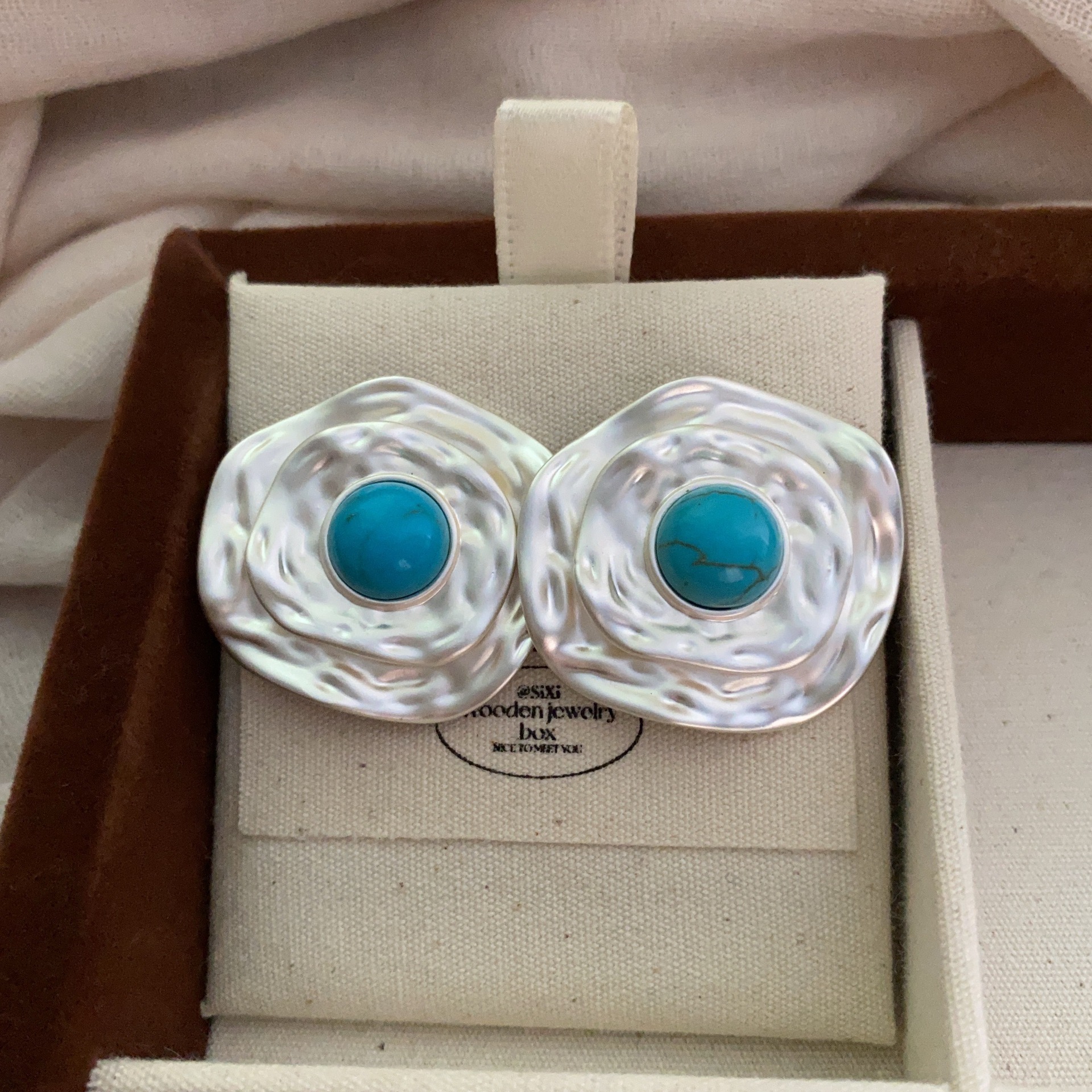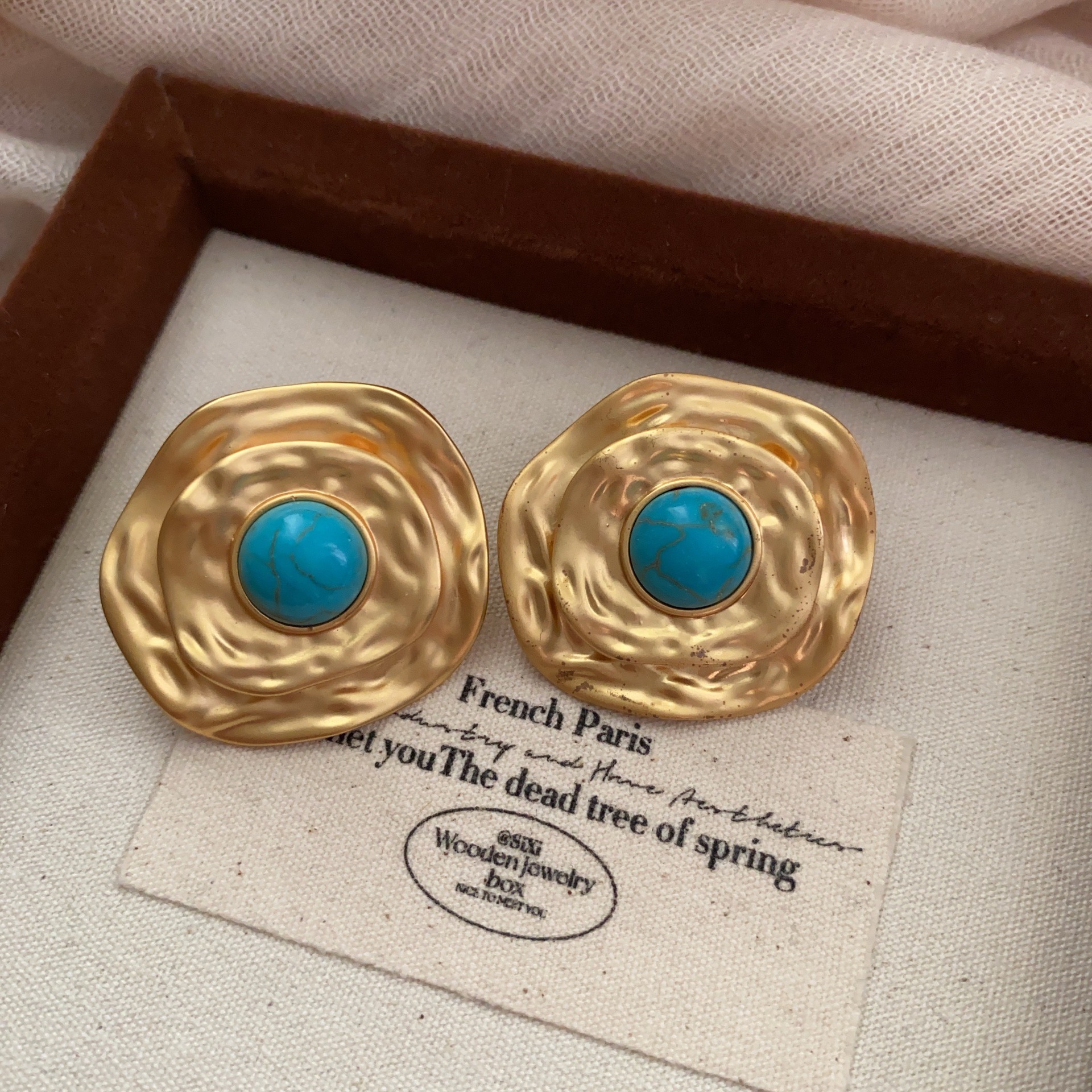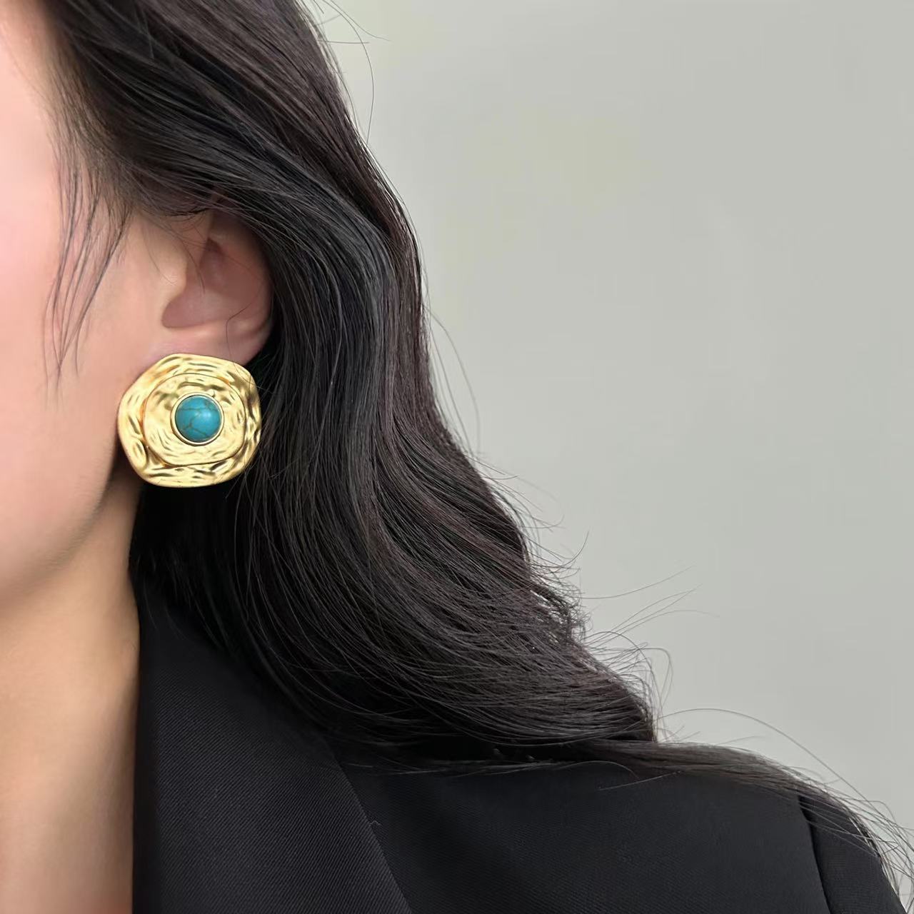 新款几何圆形花边褶皱耳钉耳环镶嵌绿松石耳钉女独特时尚欧美潮流