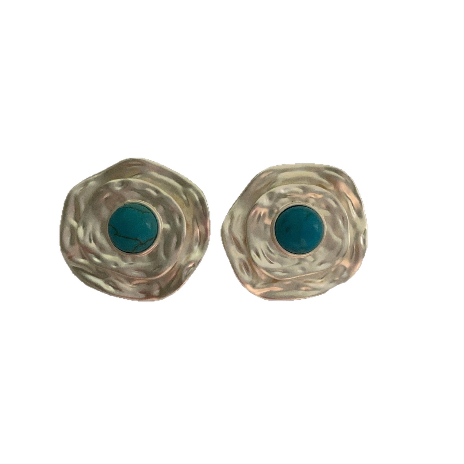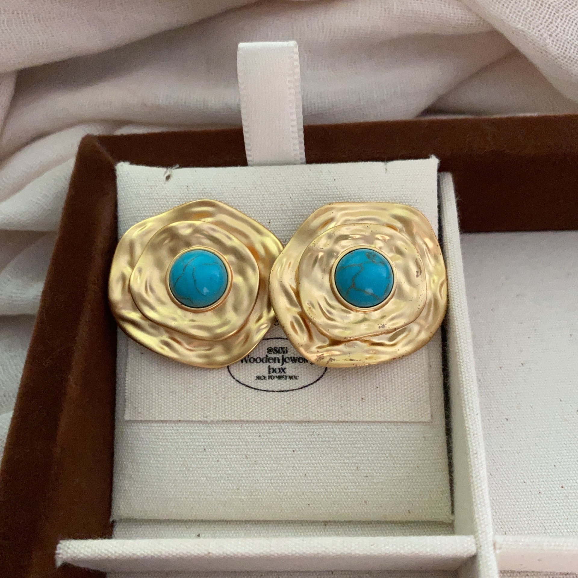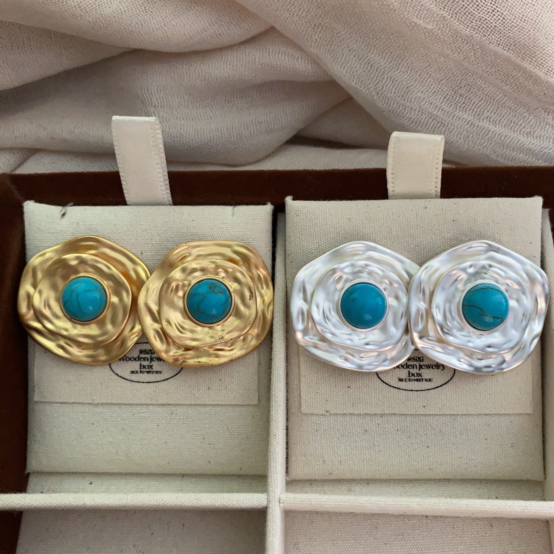 新款几何圆形花边褶皱耳钉耳环镶嵌绿松石耳钉女独特时尚欧美潮流