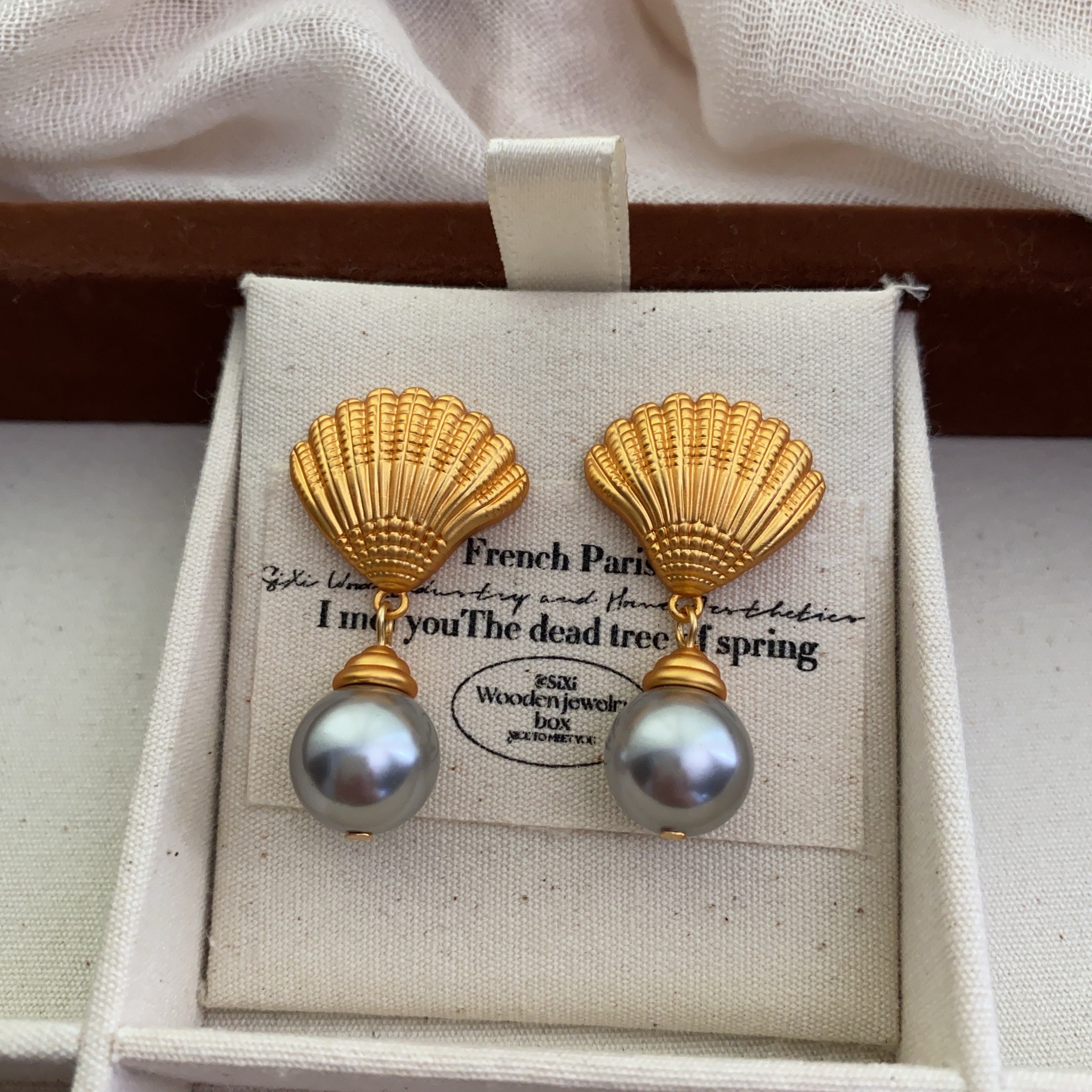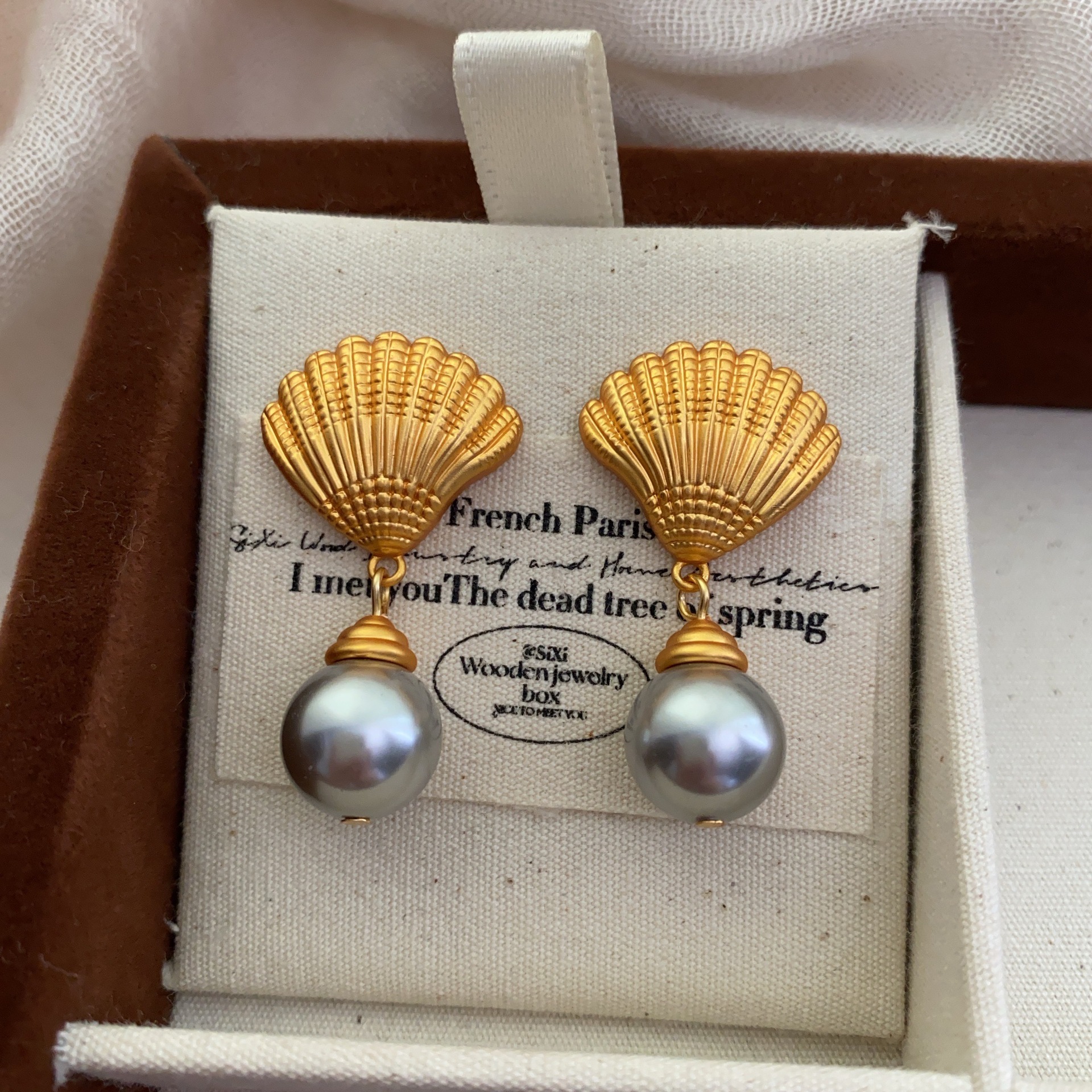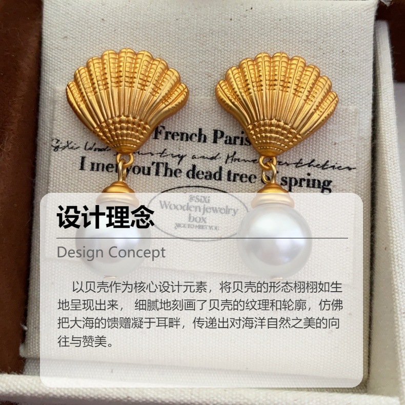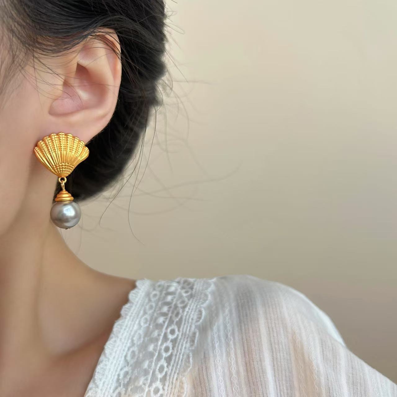 欧美百搭时尚珍珠贝壳设计金色耳钉耳环个性高级气质新款浪漫耳饰