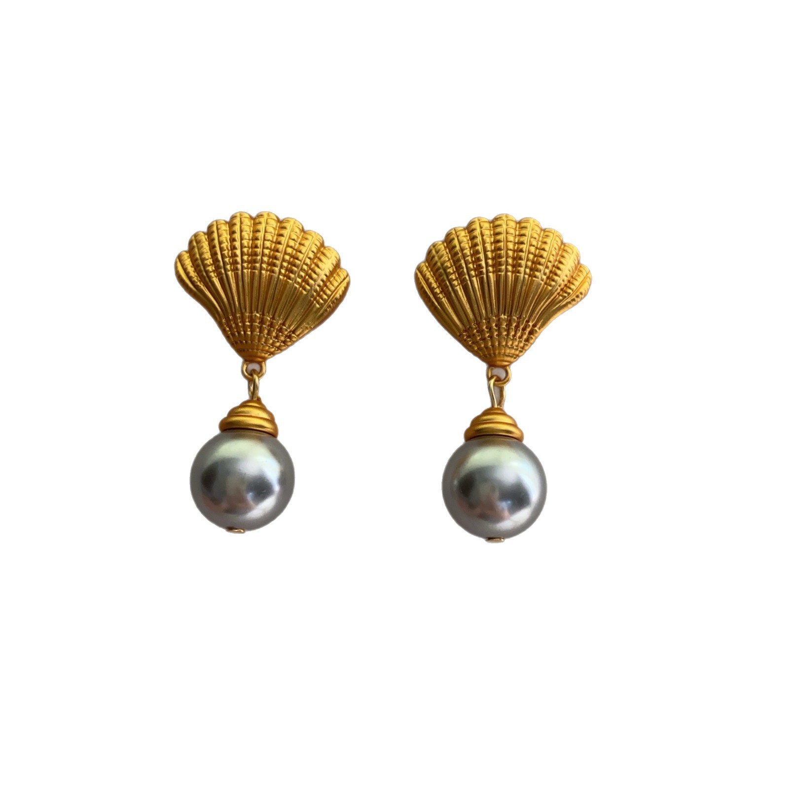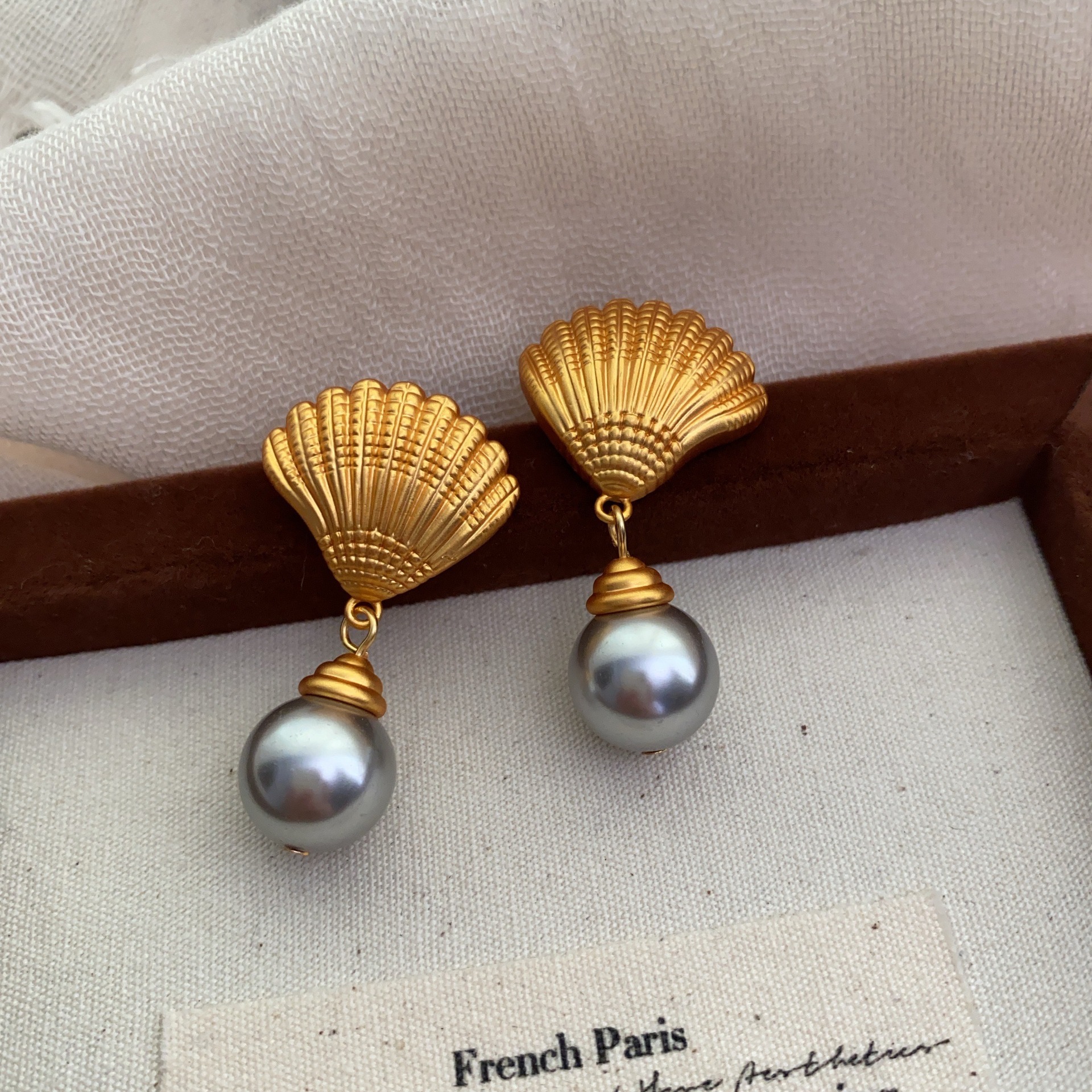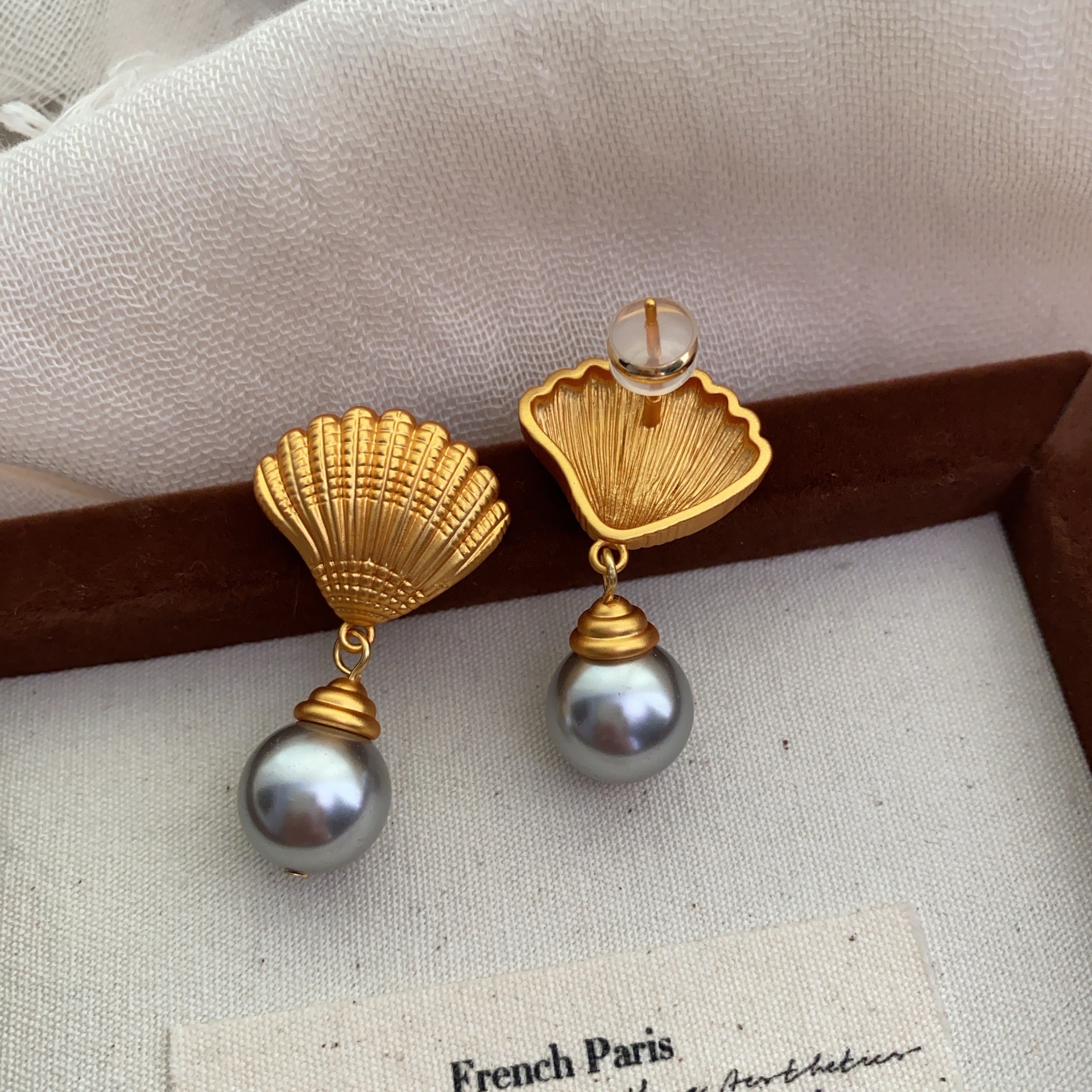 欧美百搭时尚珍珠贝壳设计金色耳钉耳环个性高级气质新款浪漫耳饰
