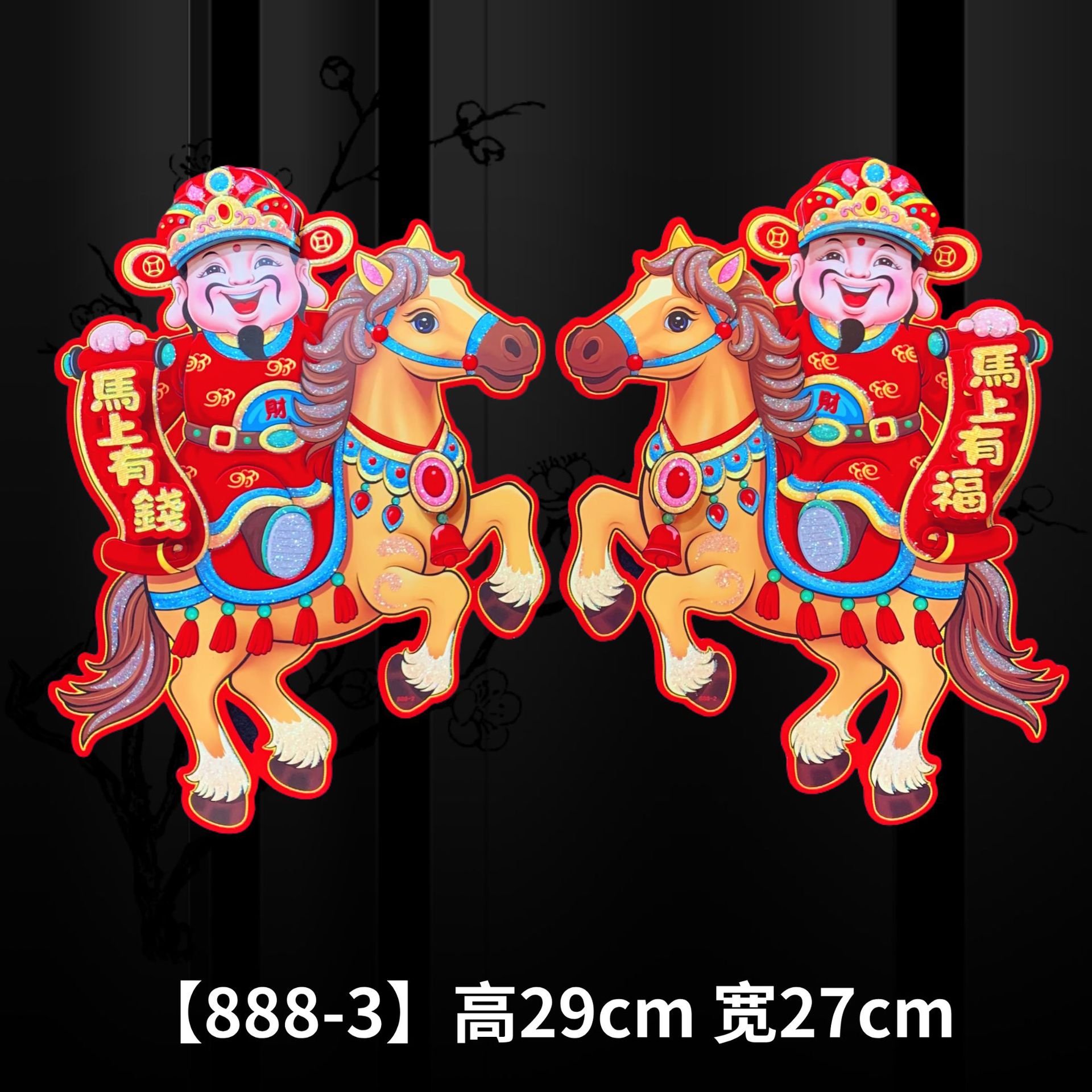 爆款水晶粉财神骑马生肖对贴888款,送胶贴,寓意马上发财,2026年大爆款出炉,财神骑马直播间必爆,四个尺寸,整套拿货6元一套(4个尺寸各1对为一套)选尺寸拿货:30# 0.85元一对,40# 1.4元一对,50# 2元一对,60# 2.8元一对,整件拿货私聊优惠,实际尺寸箱装数量详情请看第一张照片表、底板加厚硬卡纸植绒水晶撒粉加立体植绒水晶粉配件背面印花,高端大气上档次,专业设计师新创意设计经久耐看,供各大平台马年生肖对贴……