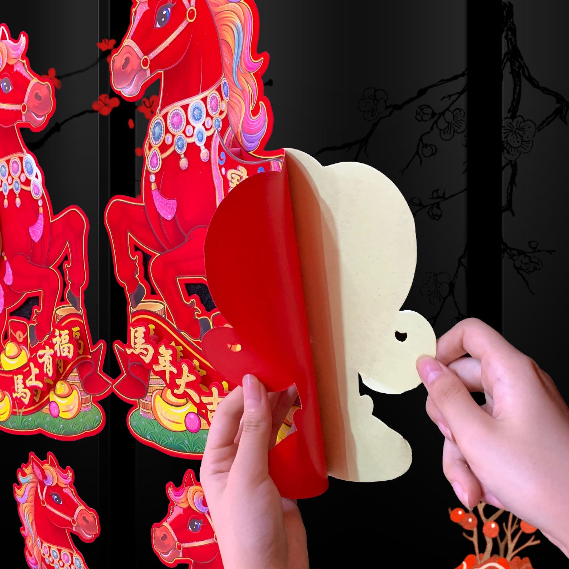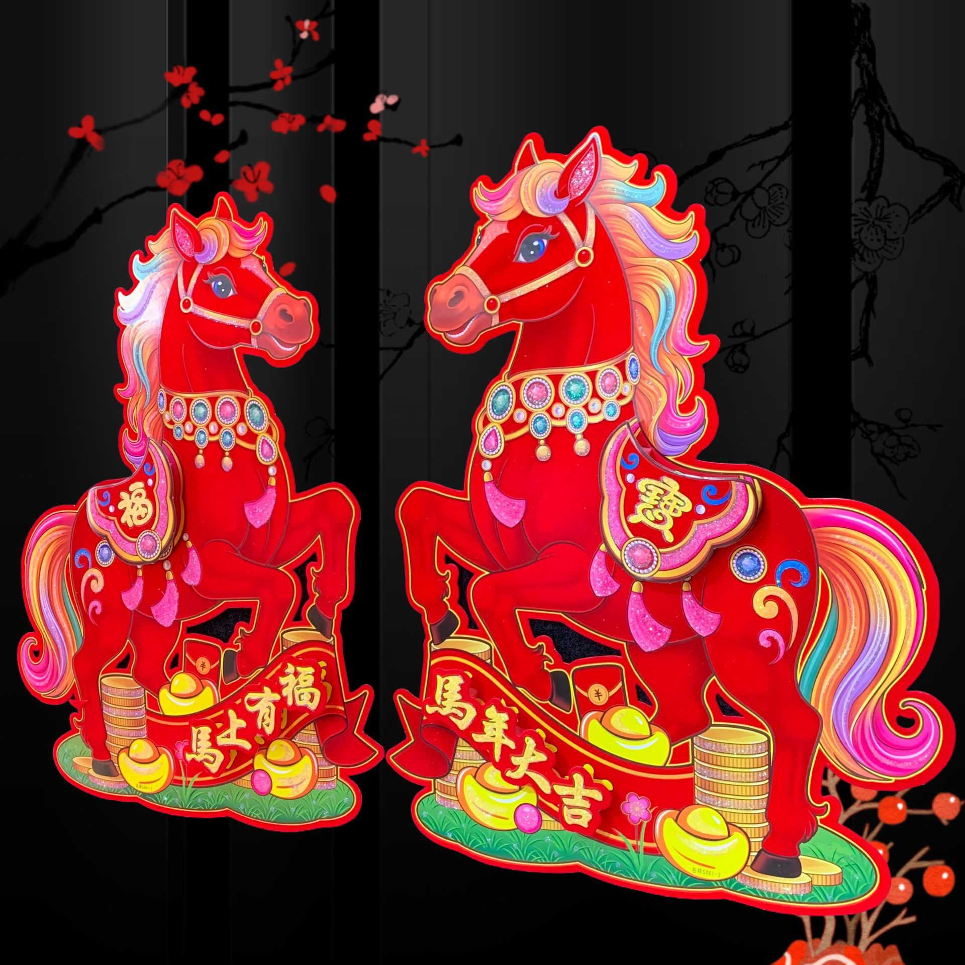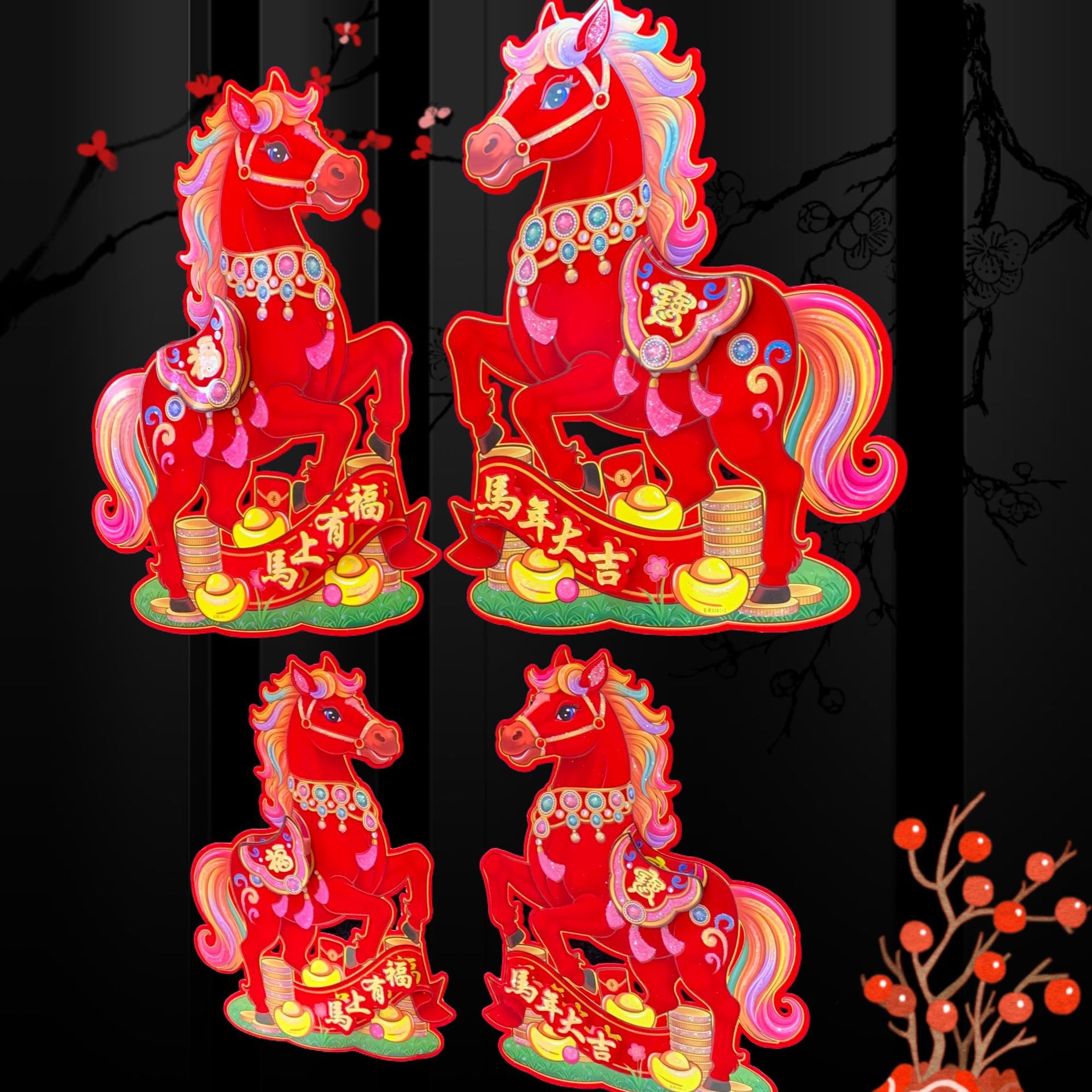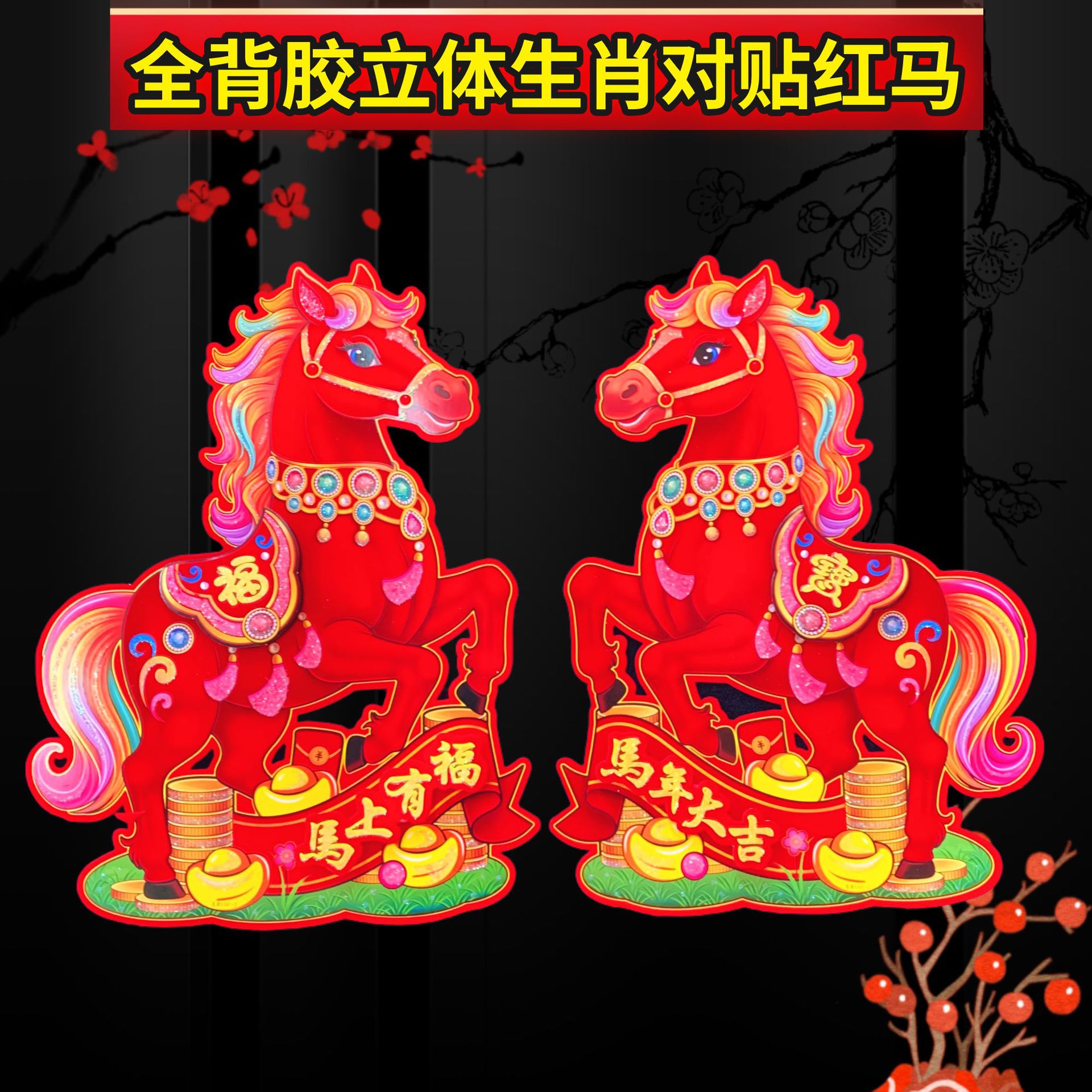 全背胶生肖立体对贴~红马SX81款,2026年大爆款出炉,红马直代表红红火火播间必爆,四个尺寸,整套拿货6.5元一套(4个尺寸各1对为一套)选尺寸拿货:30# 0.95元一对,40# 1.5元一对,50# 2.1元一对,60# 2.9元一对,整件拿货私聊优惠,实际尺寸箱装数量详情请看第一张照片表、底板加厚硬卡纸植绒撒水晶粉加立体植绒撒水晶粉配件背面全背胶撕开红色款式高端大气上档次,实物比图片更好看更有质感,专业设计师新创意设计经久耐看,供各大平台马年生肖对贴……
