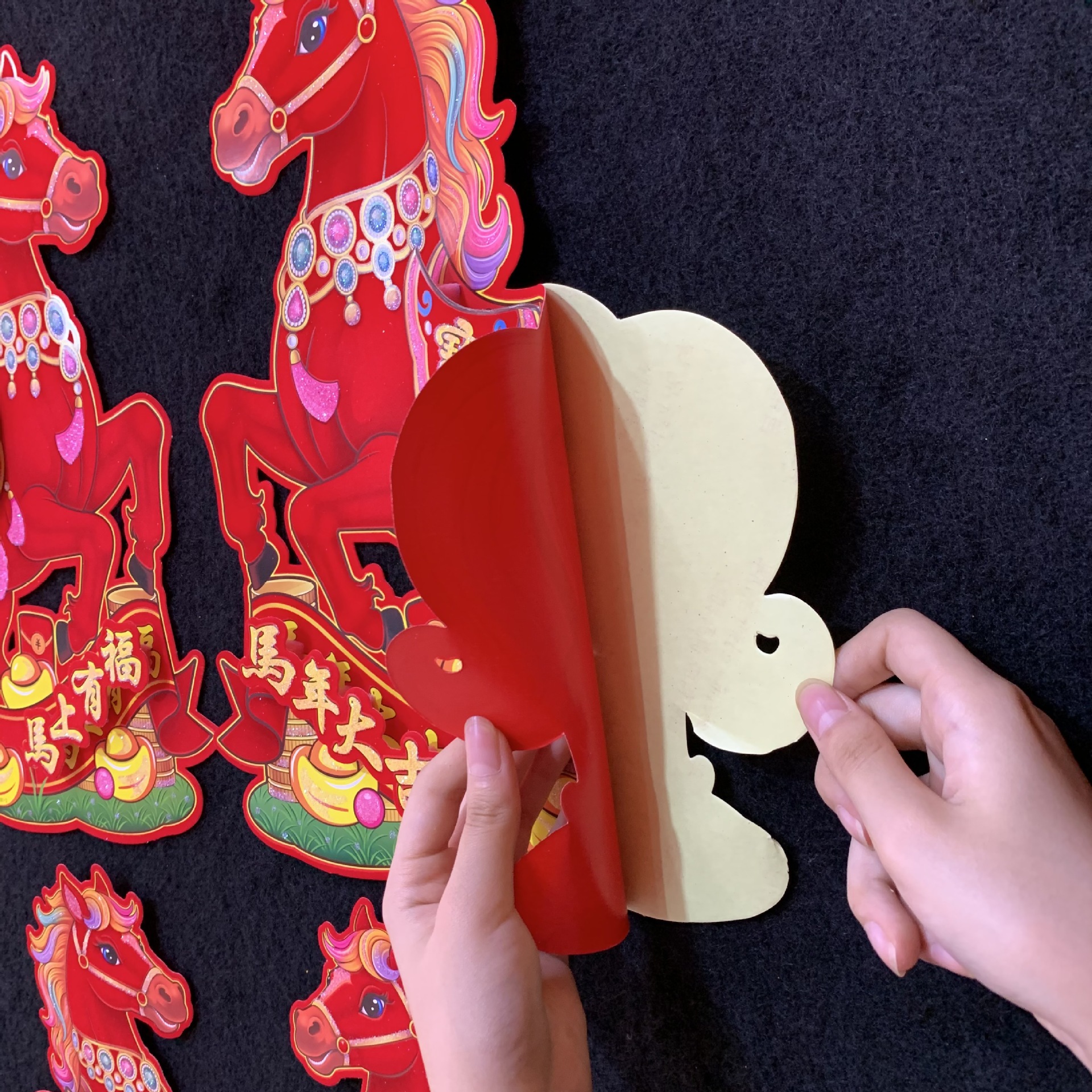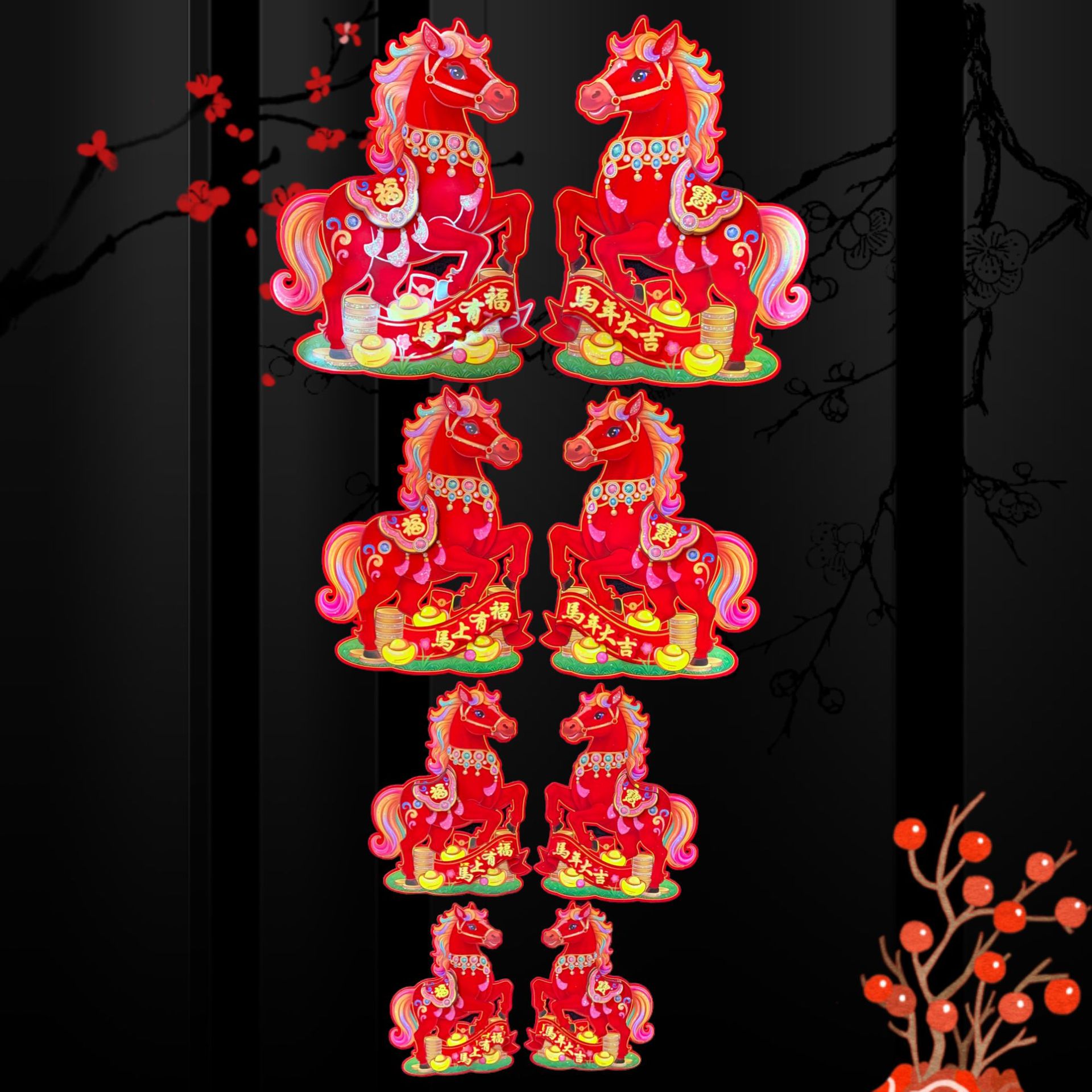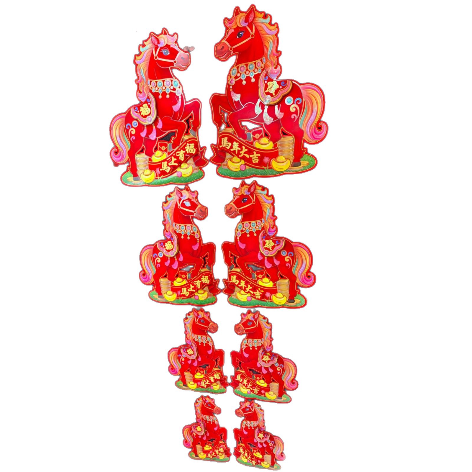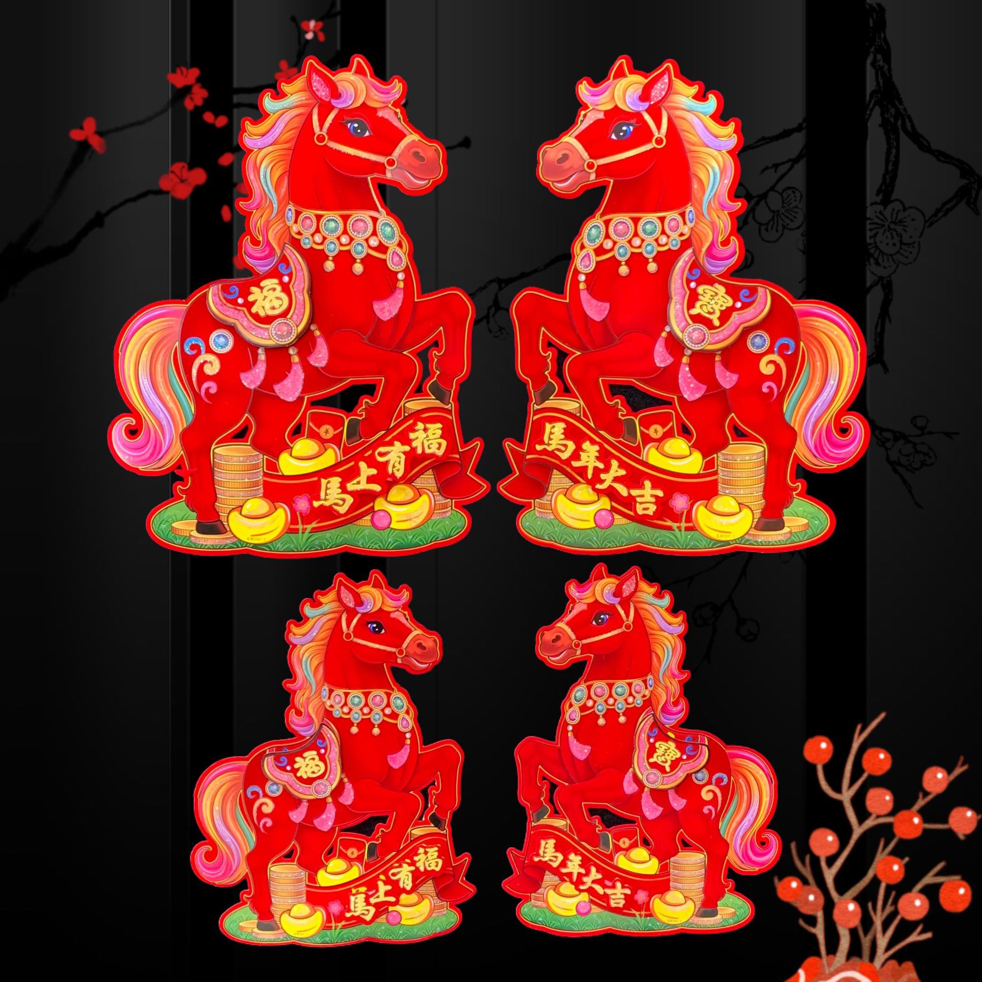 全背胶生肖立体对贴~红马SX81款,2026年大爆款出炉,红马直代表红红火火播间必爆,四个尺寸,整套拿货6.5元一套(4个尺寸各1对为一套)选尺寸拿货:30# 0.95元一对,40# 1.5元一对,50# 2.1元一对,60# 2.9元一对,整件拿货私聊优惠,实际尺寸箱装数量详情请看第一张照片表、底板加厚硬卡纸植绒撒水晶粉加立体植绒撒水晶粉配件背面全背胶撕开红色款式高端大气上档次,实物比图片更好看更有质感,专业设计师新创意设计经久耐看,供各大平台马年生肖对贴……