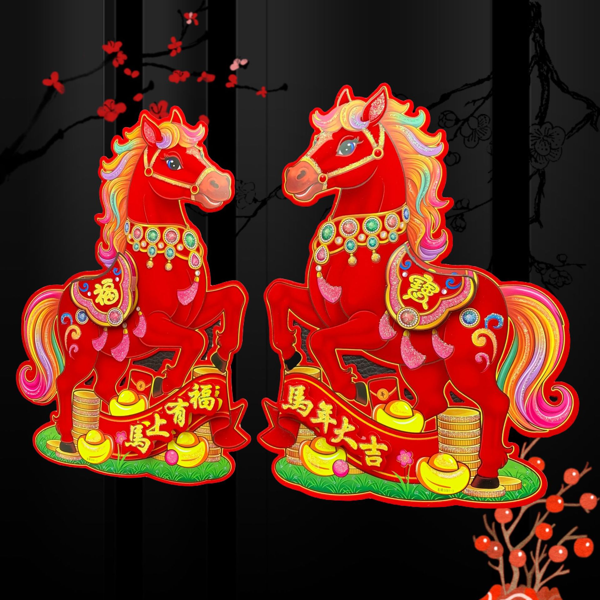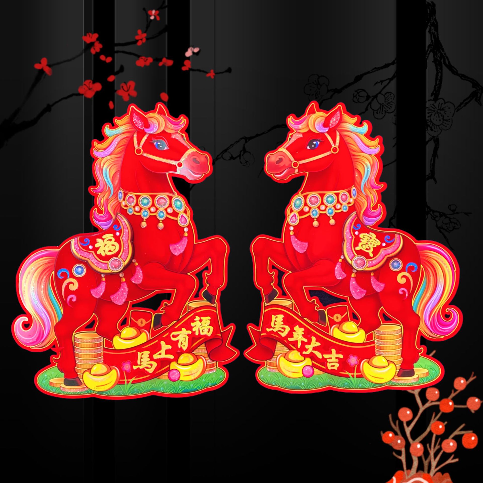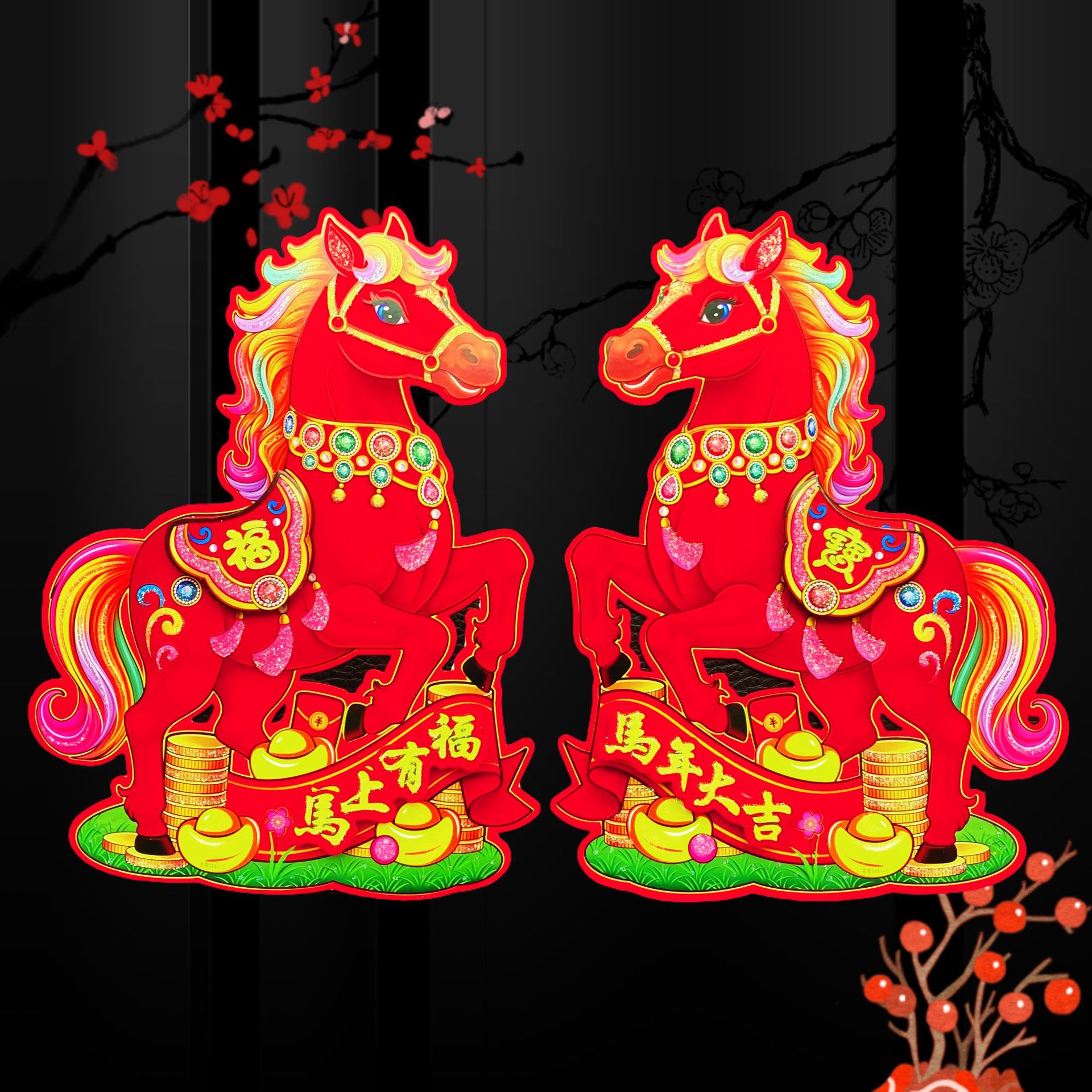 全背胶新款红马立体生肖对贴 2026马年 门贴烫金高档立体生肖门贴
