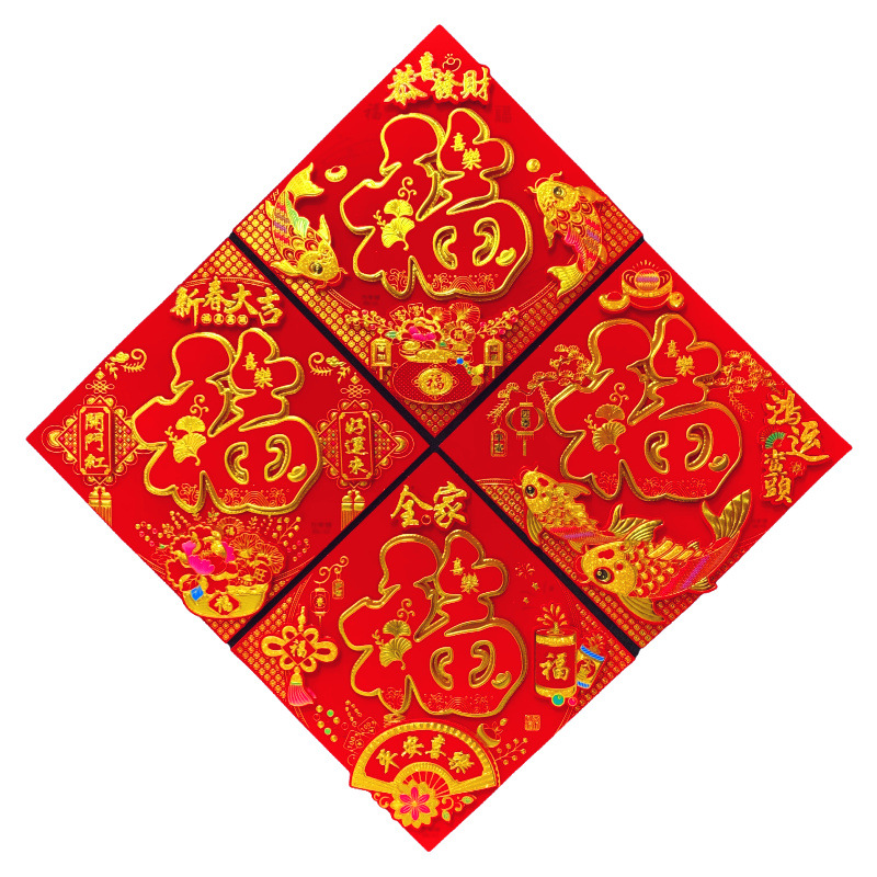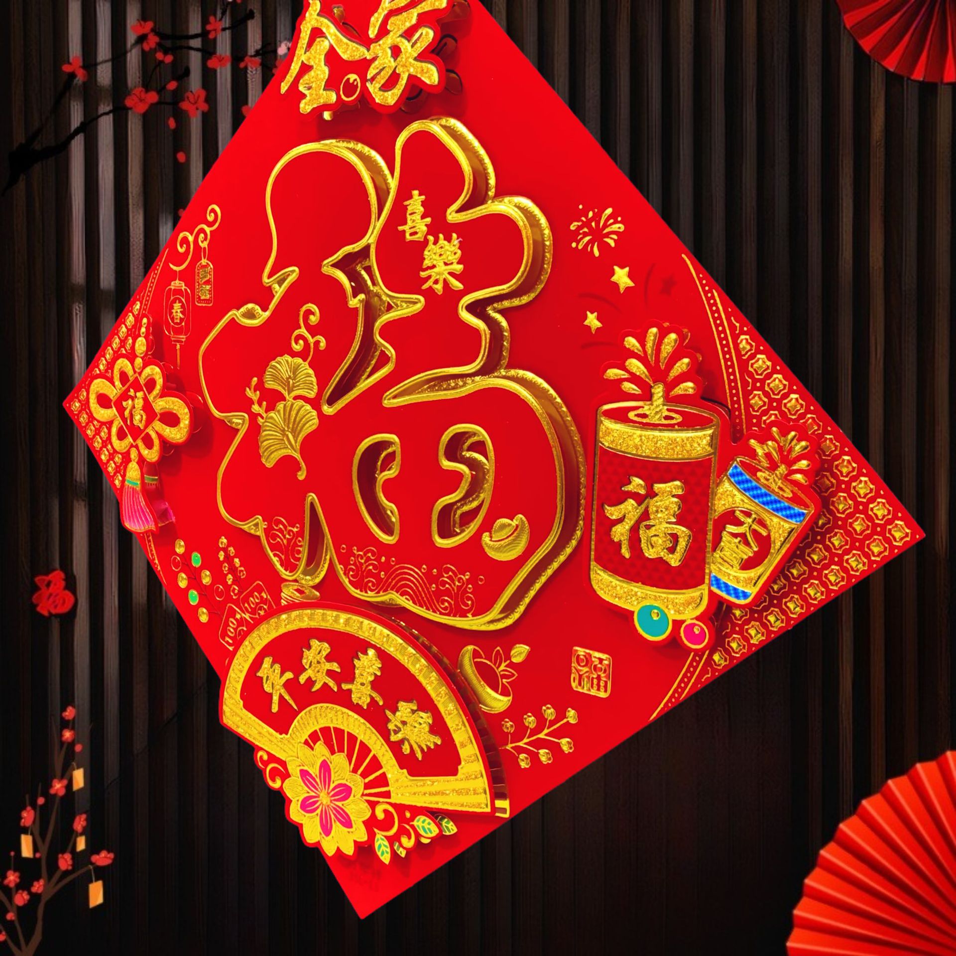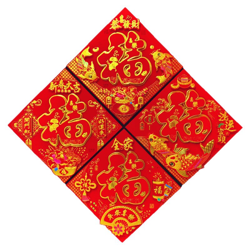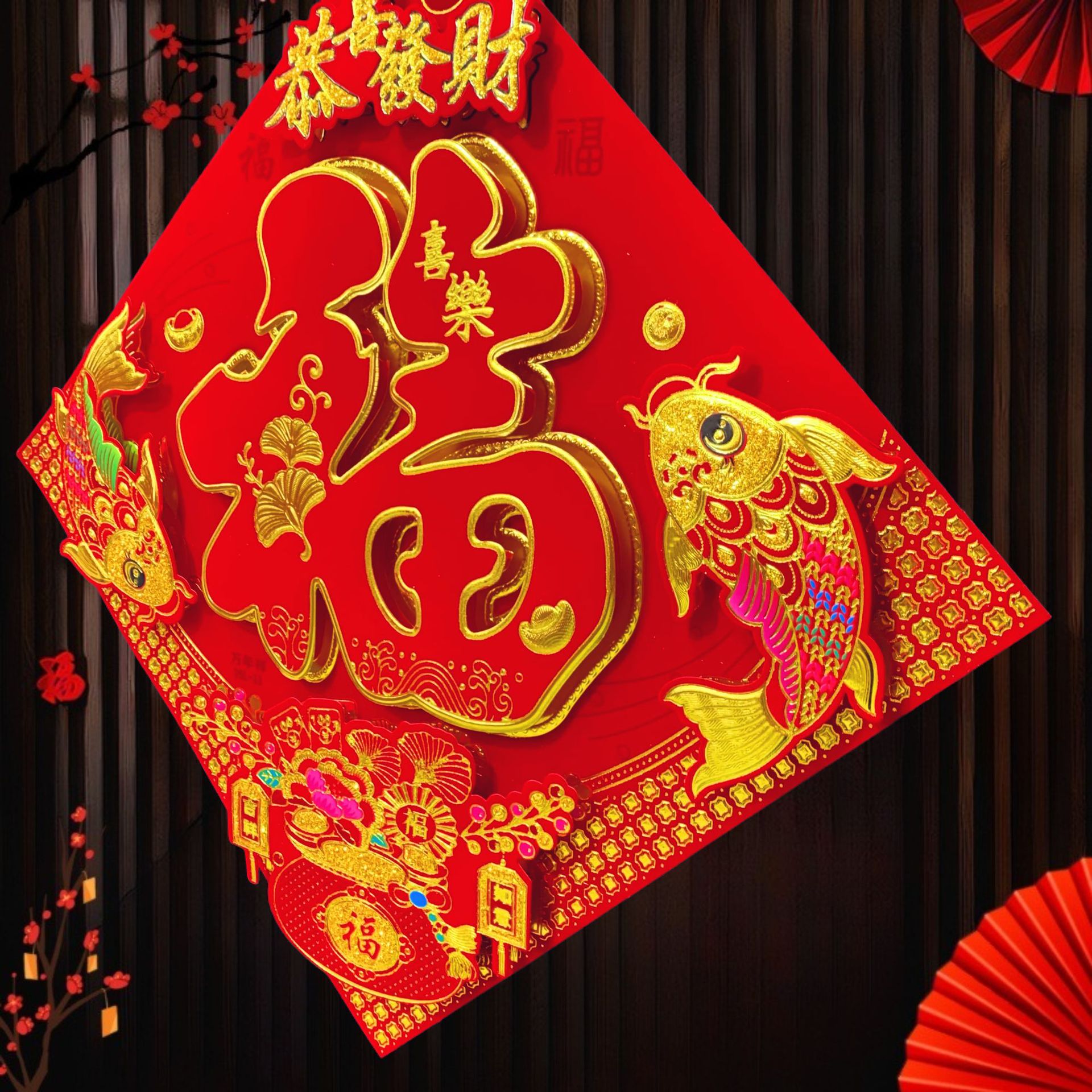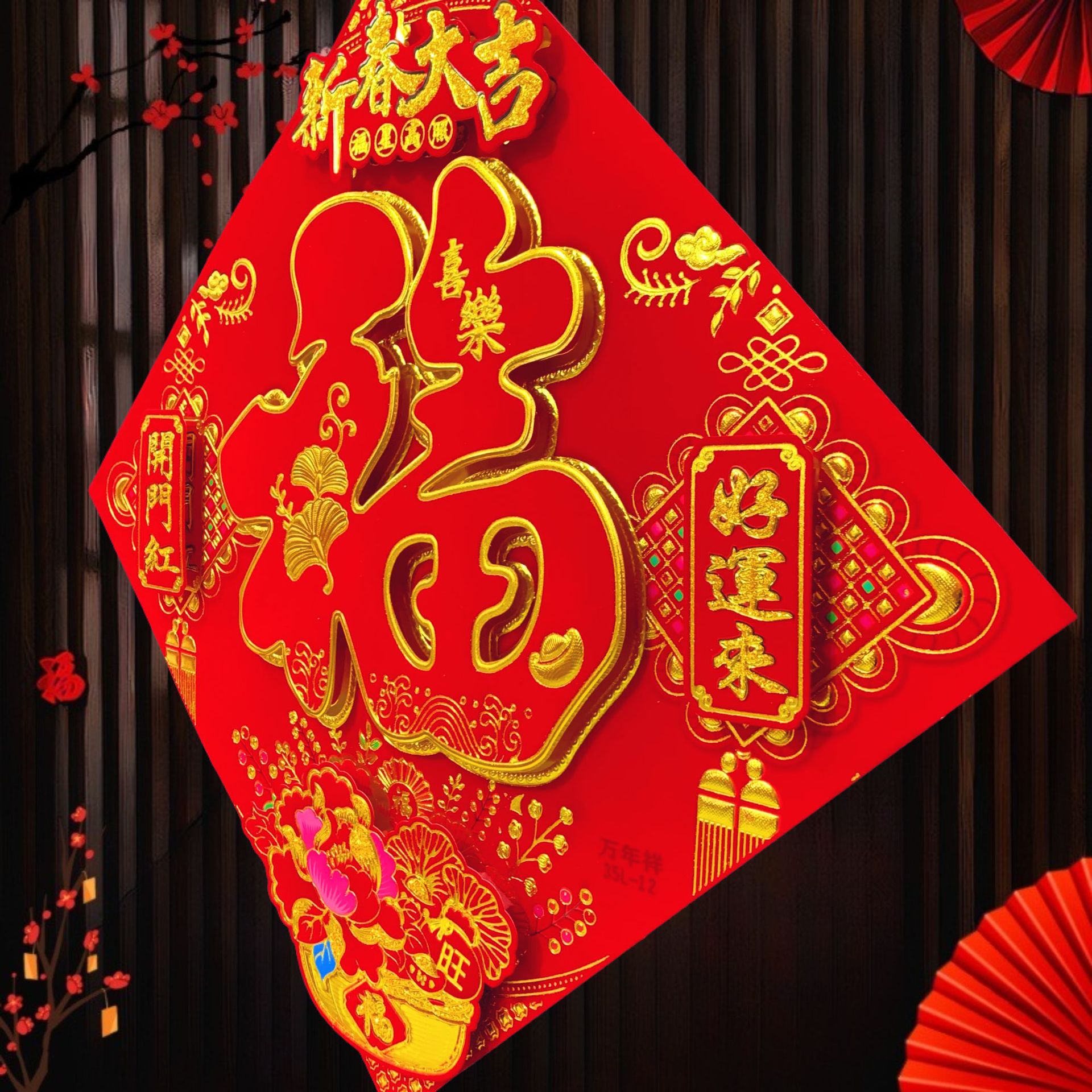 新品上市,全背胶四配件立体红福,40# 1.45元一张,四个款式,四角四个立体配件,实际尺寸40# 33.5×33.5cm.款式可混搭发货, 底板全胶植绒烫金+福字植绒加烫金,+配件彩色印花植绒撒粉,款式高端大气上档次,实物比照片更好看更有质感……箱装清装数量:40# 450/箱,清装整箱拿货私聊优惠……