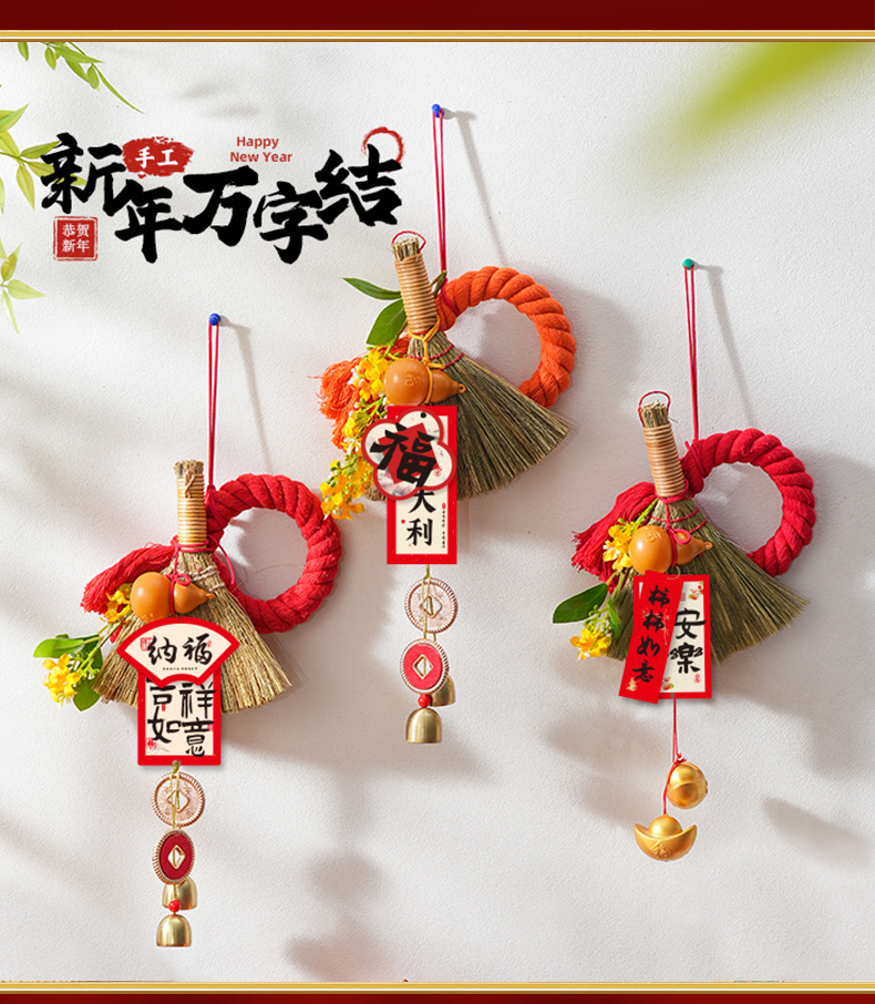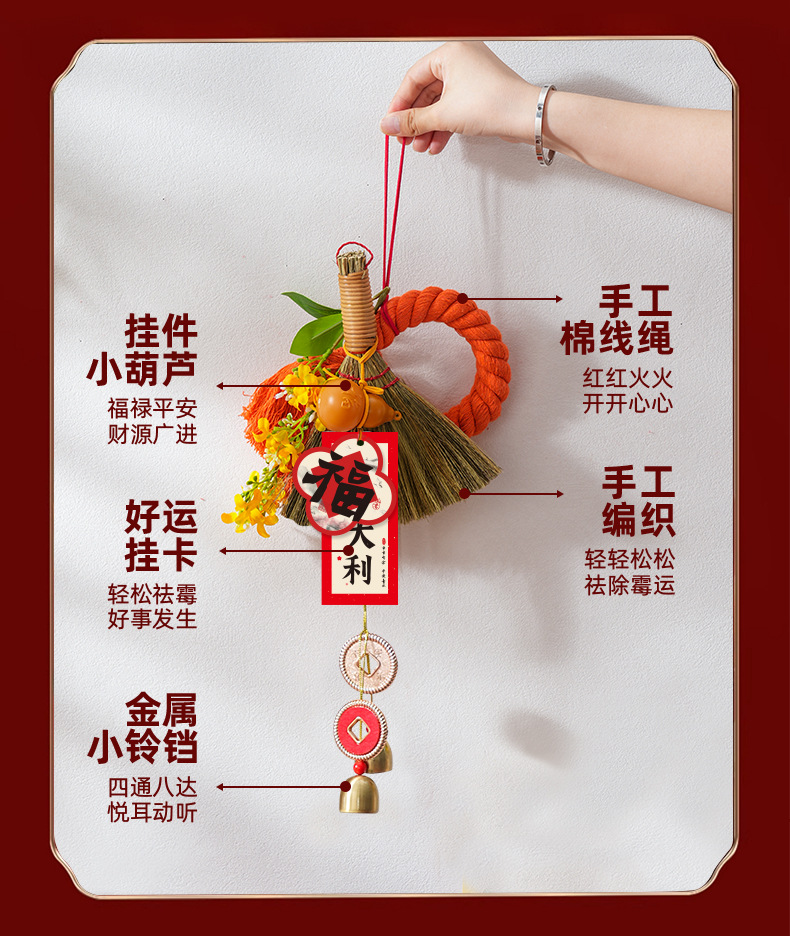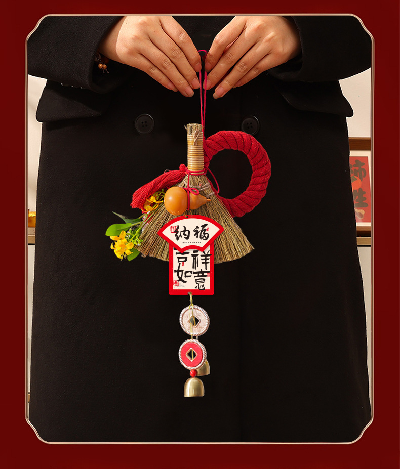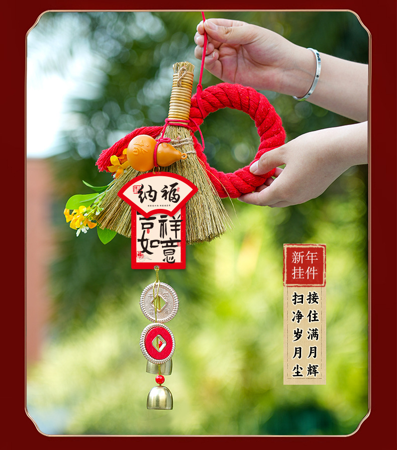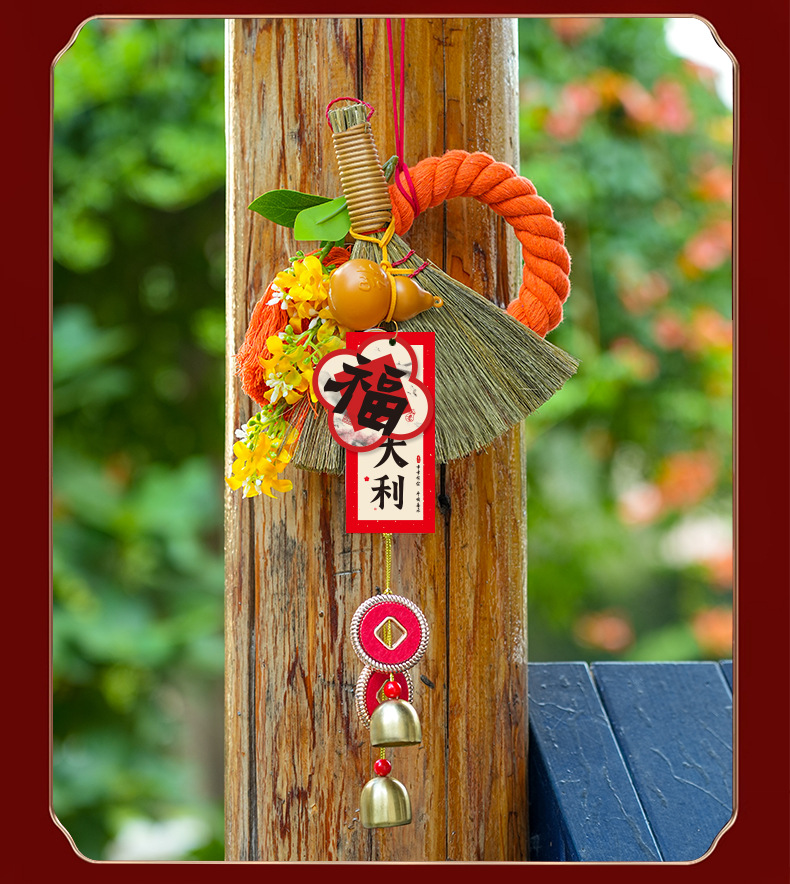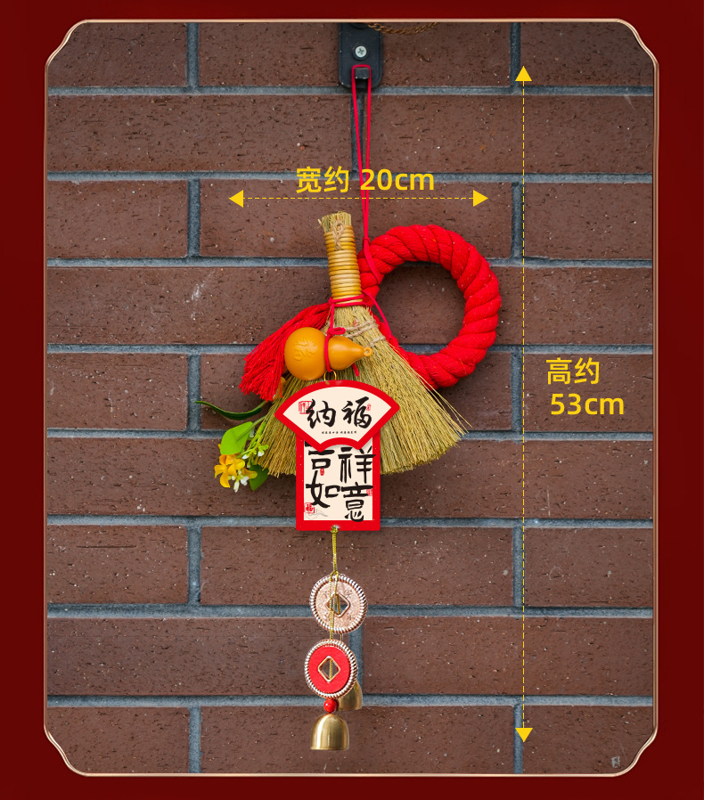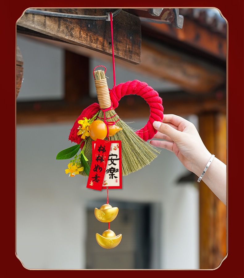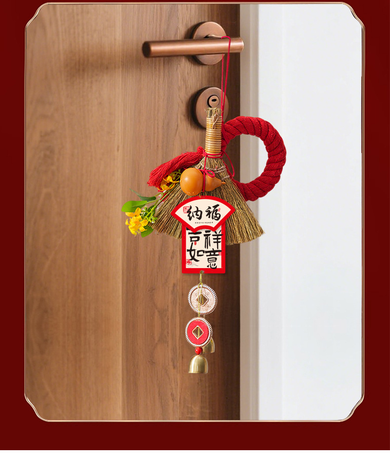 新年挂件竹编扫把门挂墙面铃铛喜庆入户门装饰布置门把手挂件