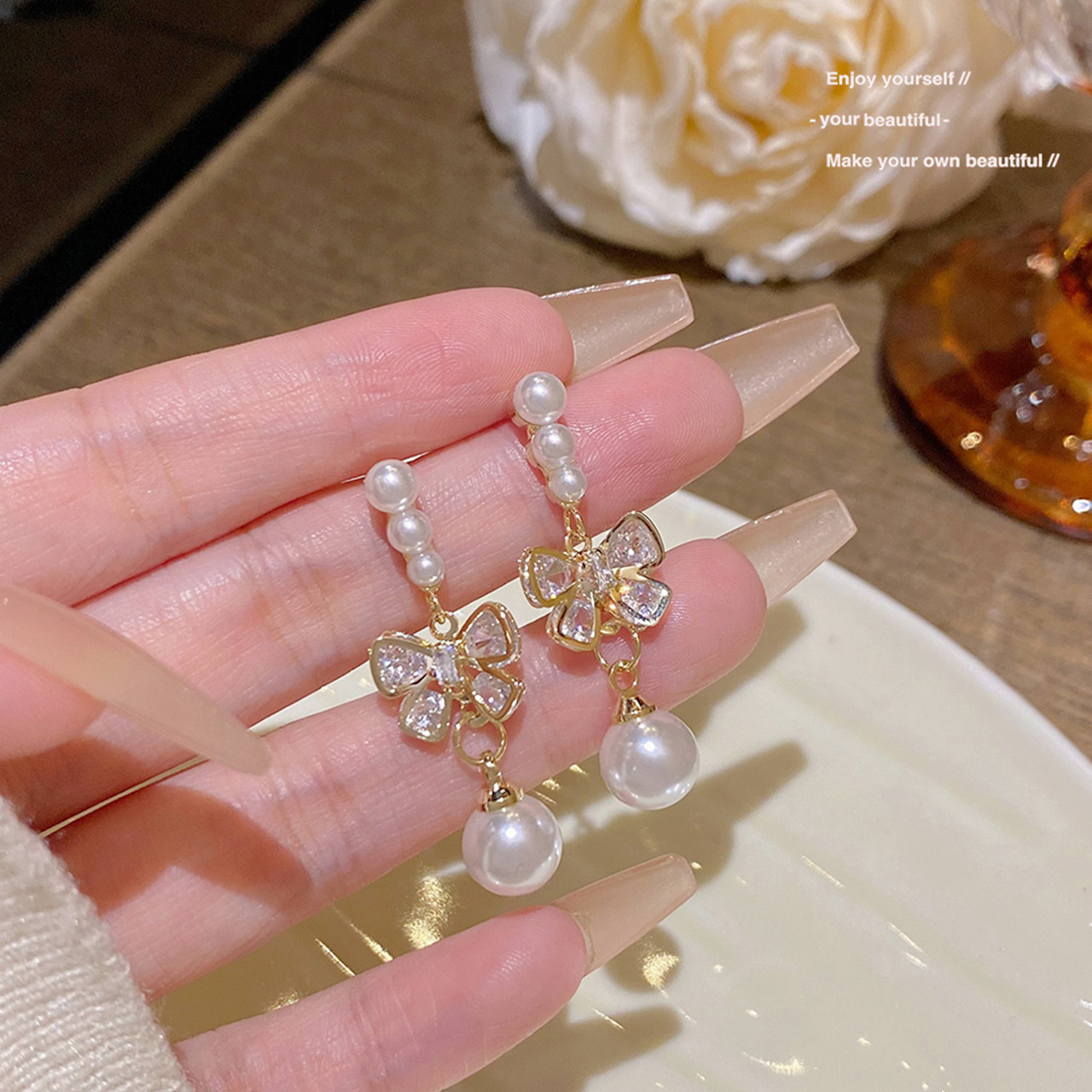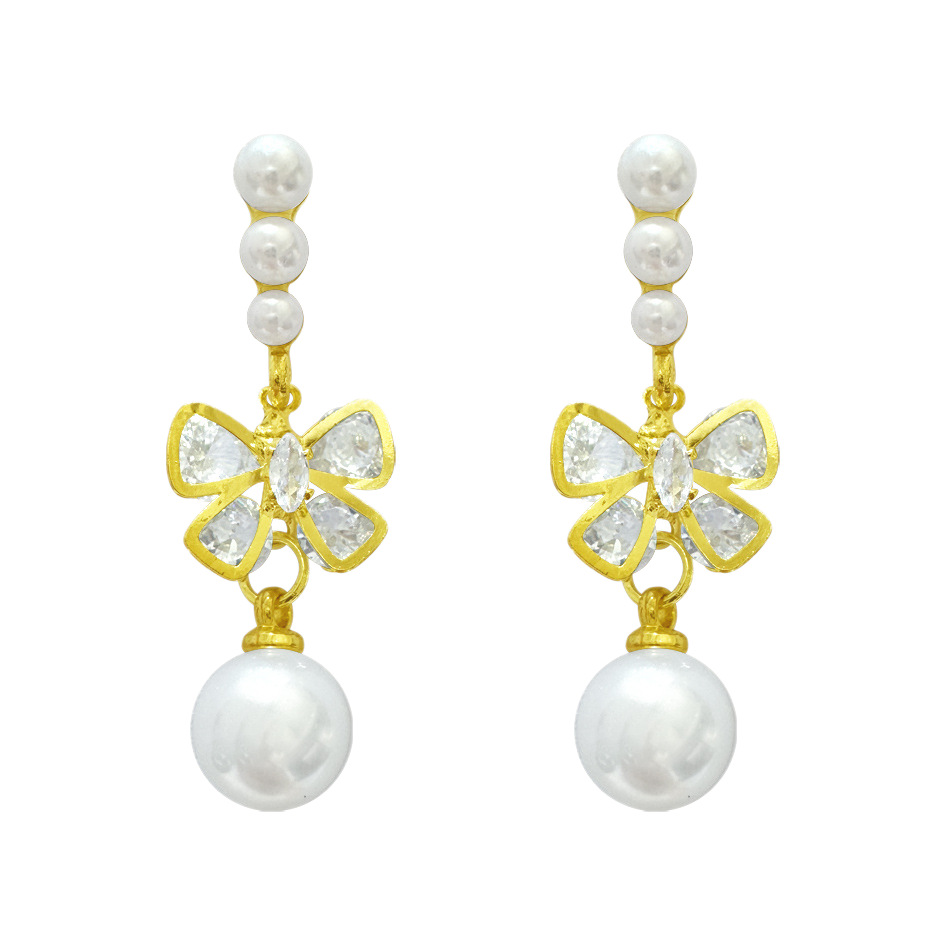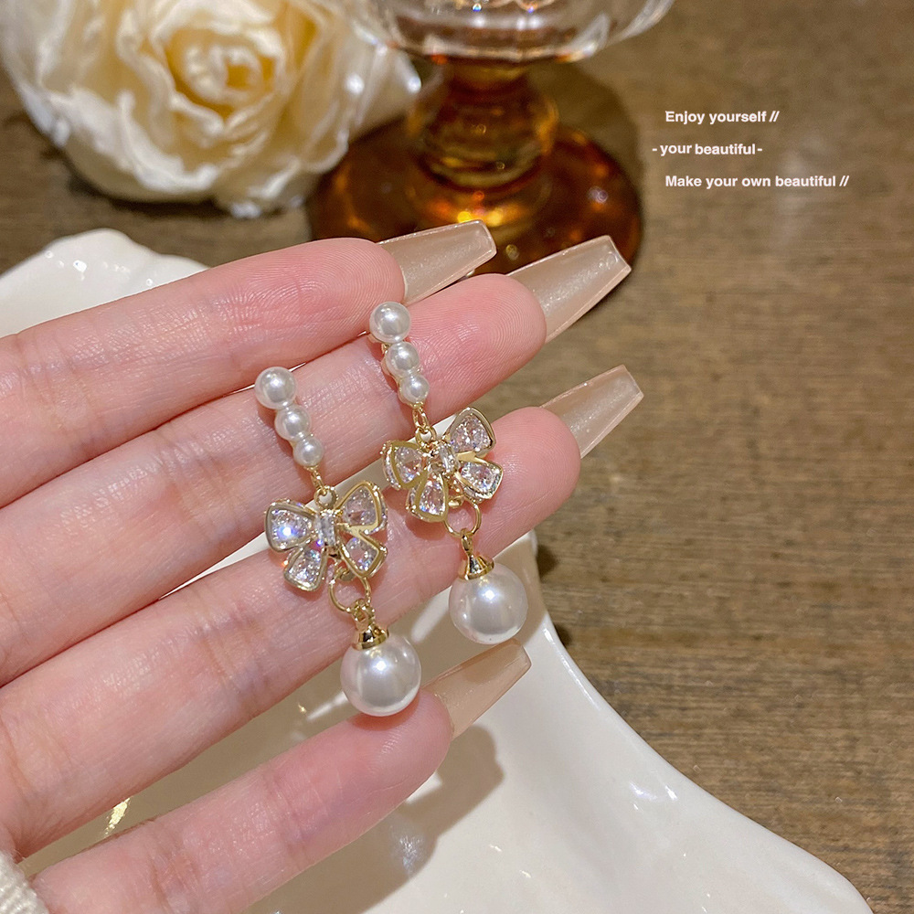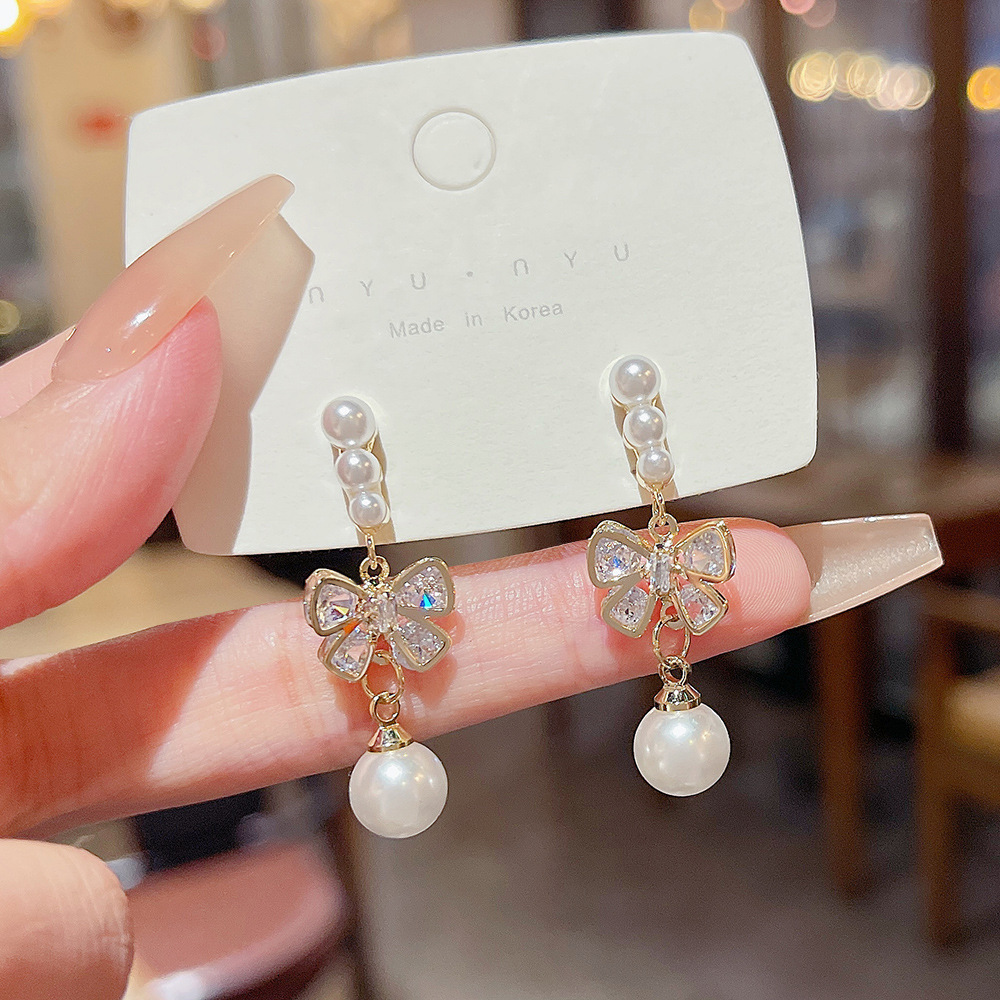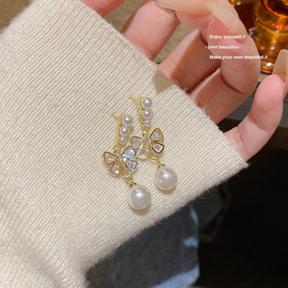 S925银针轻奢甜美蝴蝶结耳钉韩系百搭精致耳坠小众高级感珍珠耳环