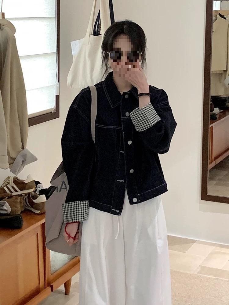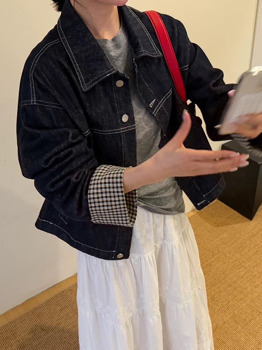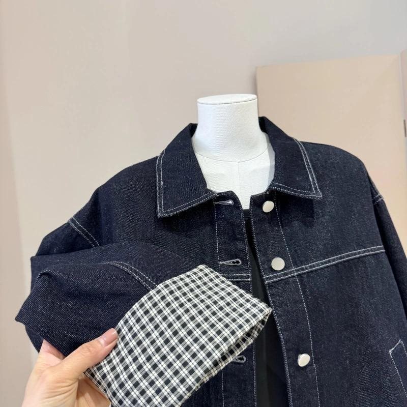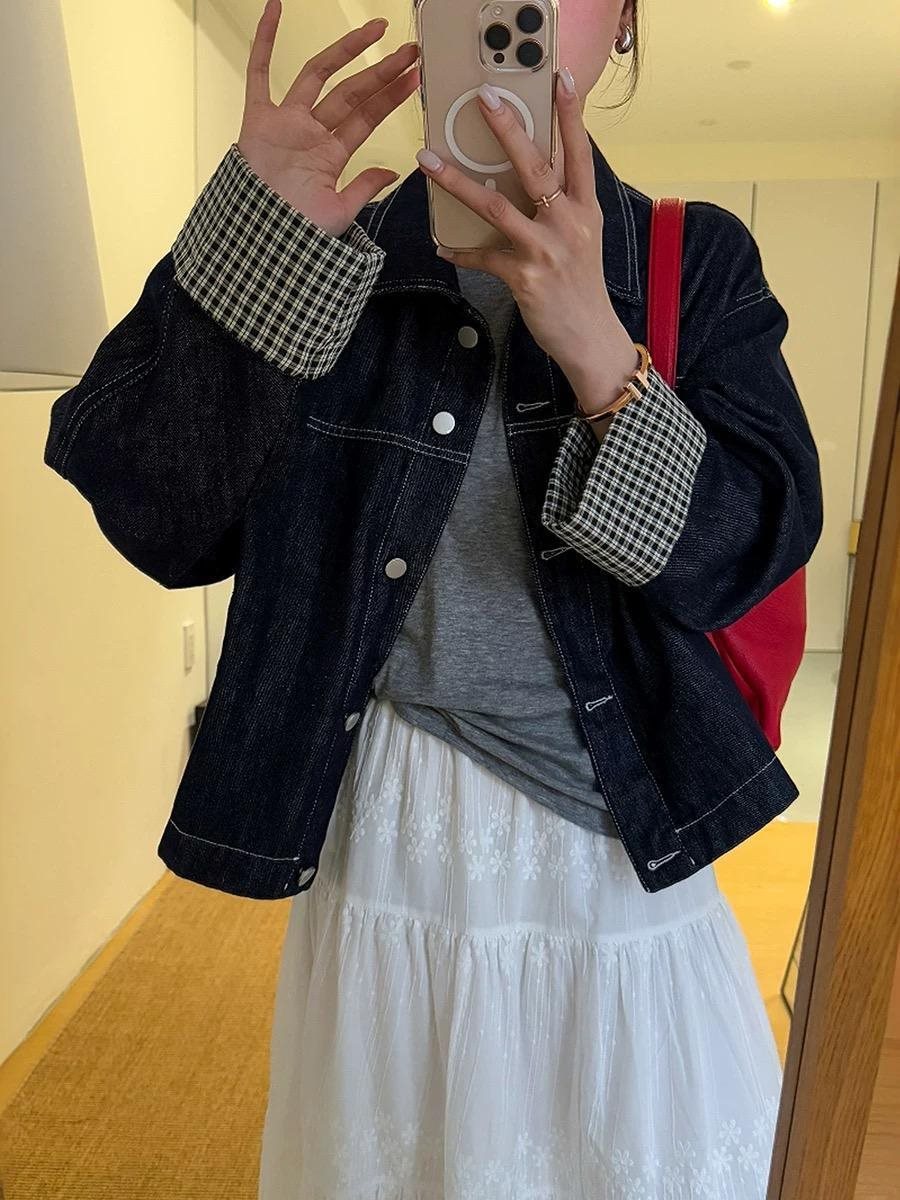 2025秋季流行新款格子拼接宽松拼接休闲牛仔短外套女复古夹克上衣