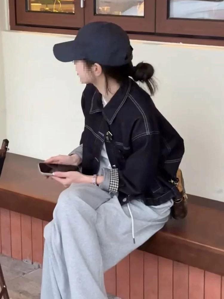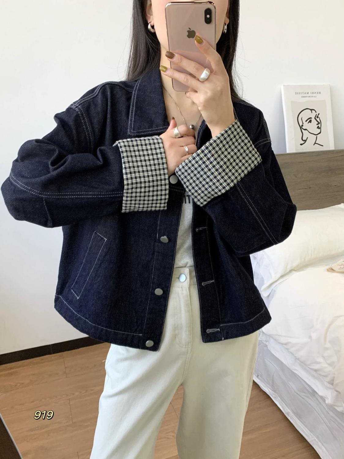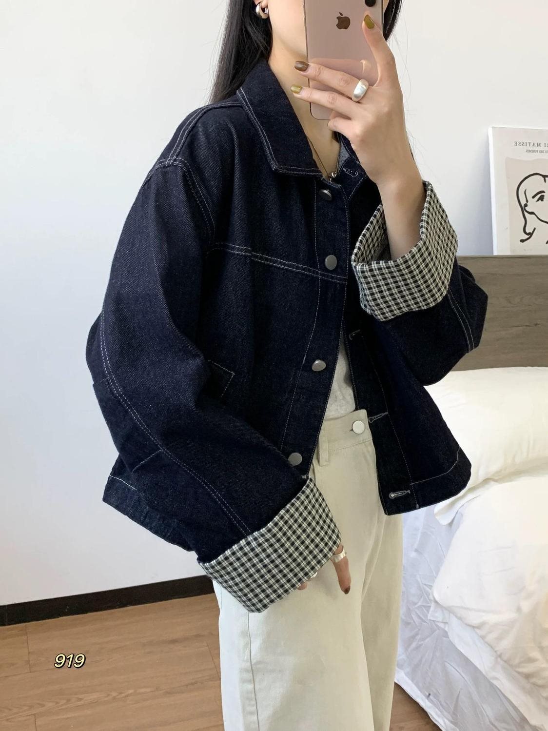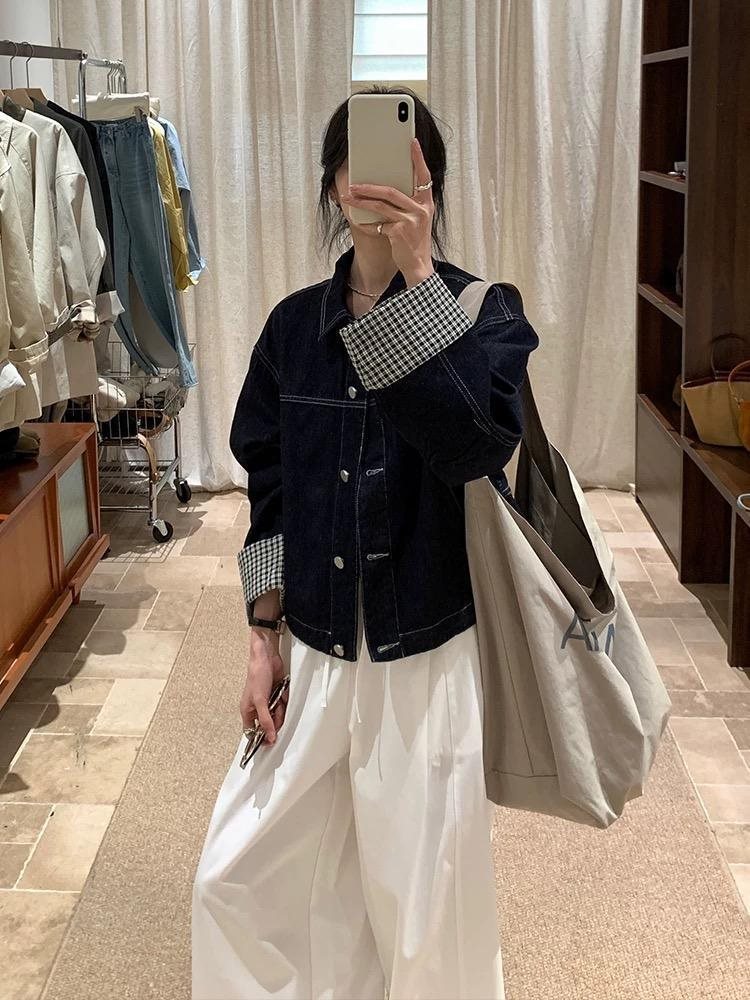 2025秋季流行新款格子拼接宽松拼接休闲牛仔短外套女复古夹克上衣