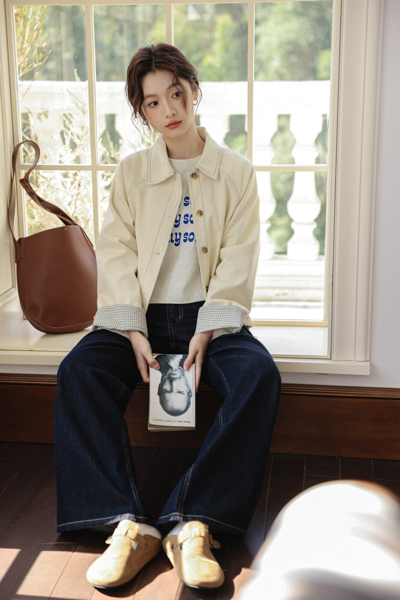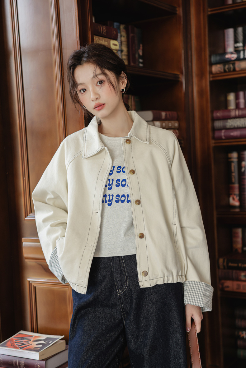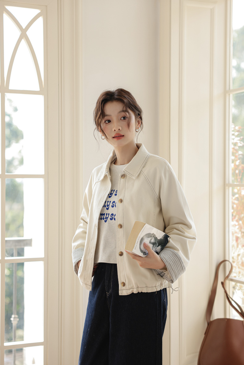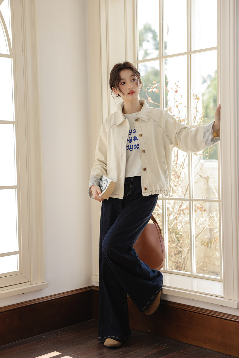 实拍2025春季新款韩版设计感抽绳白色牛仔外套女长袖百搭夹克衫