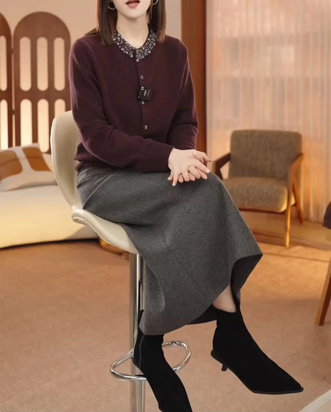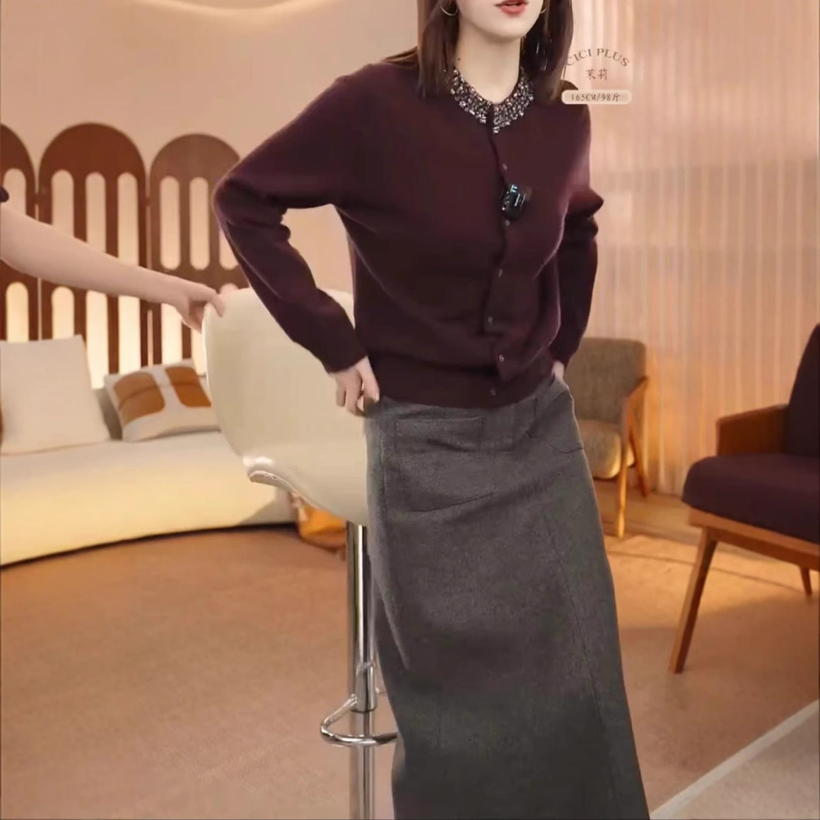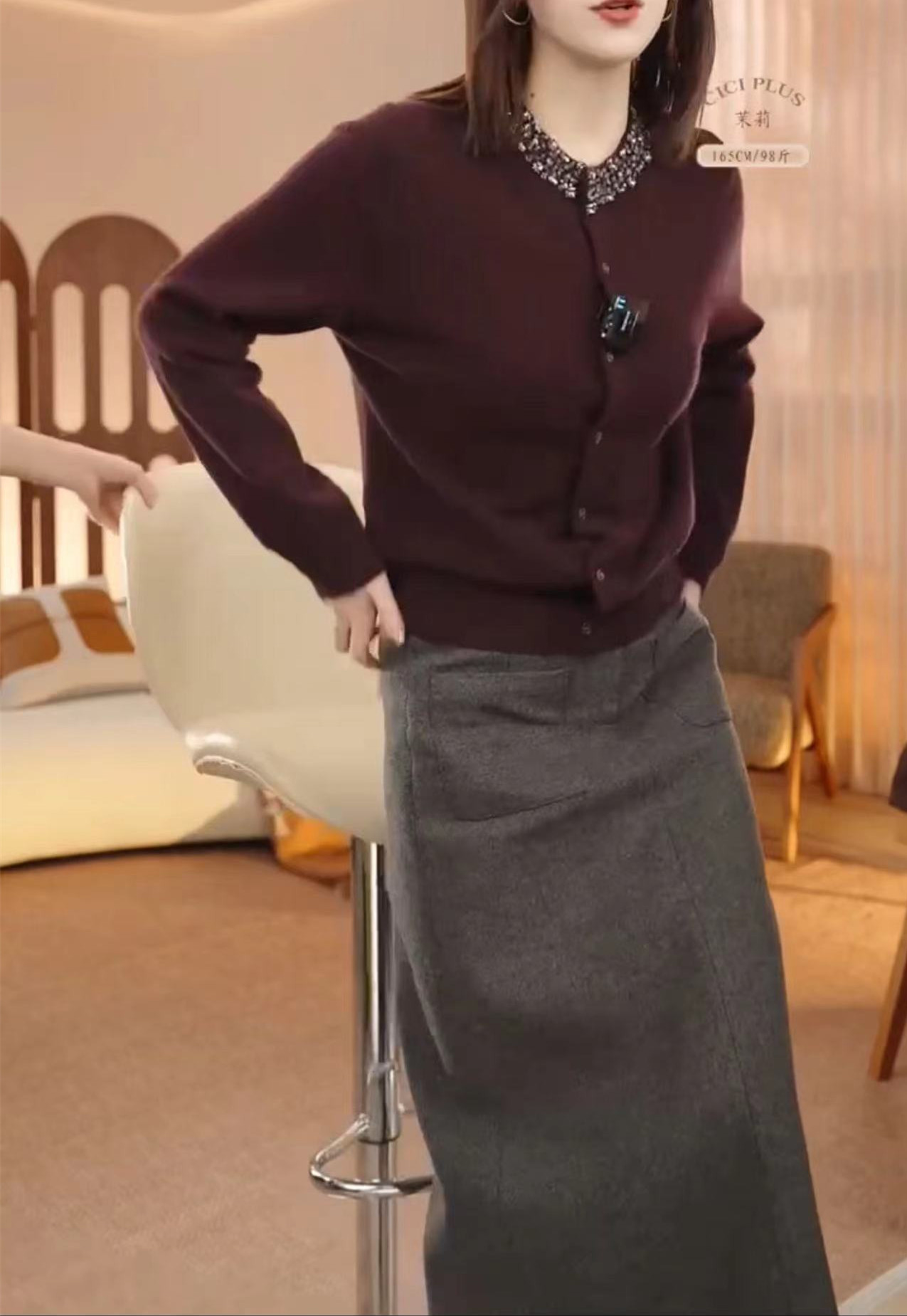 24986大爱美依缘2025秋季新款紫红色圆领烫钻上衣高腰半身裙女装