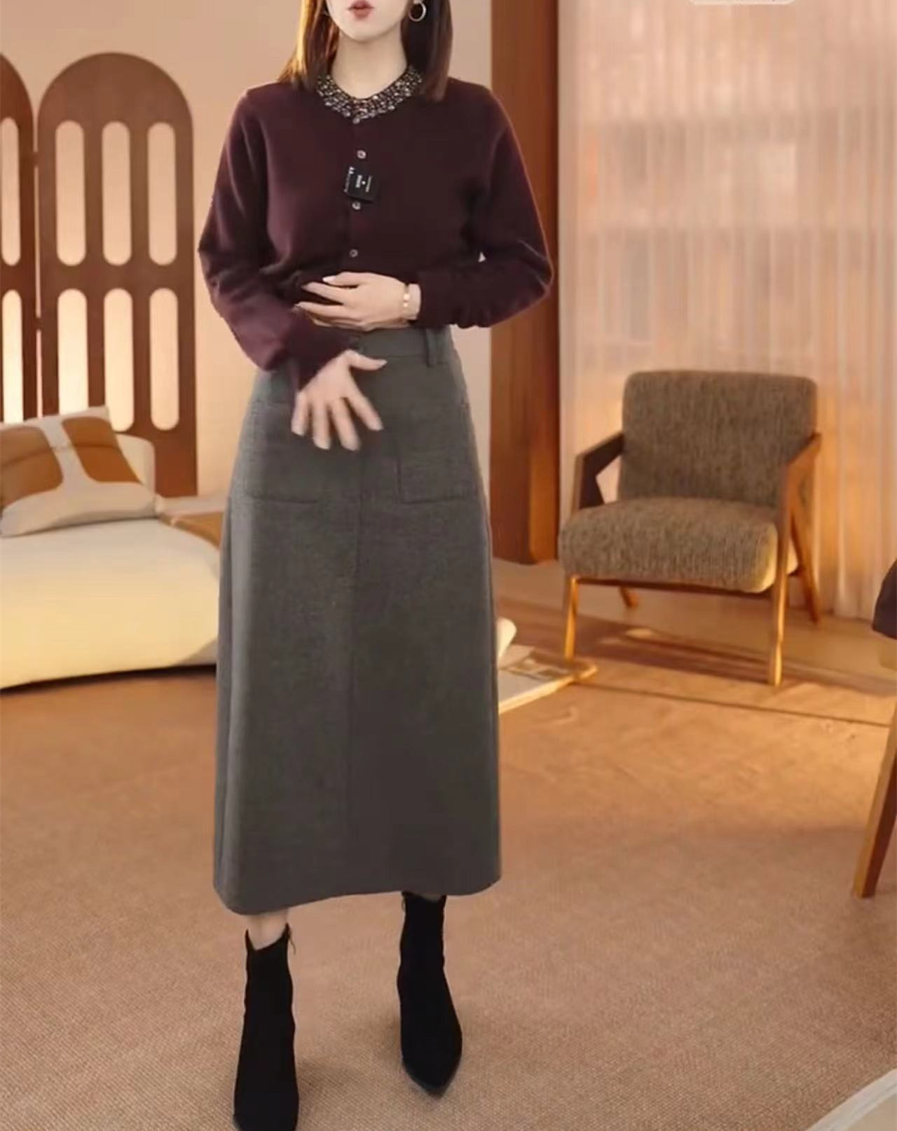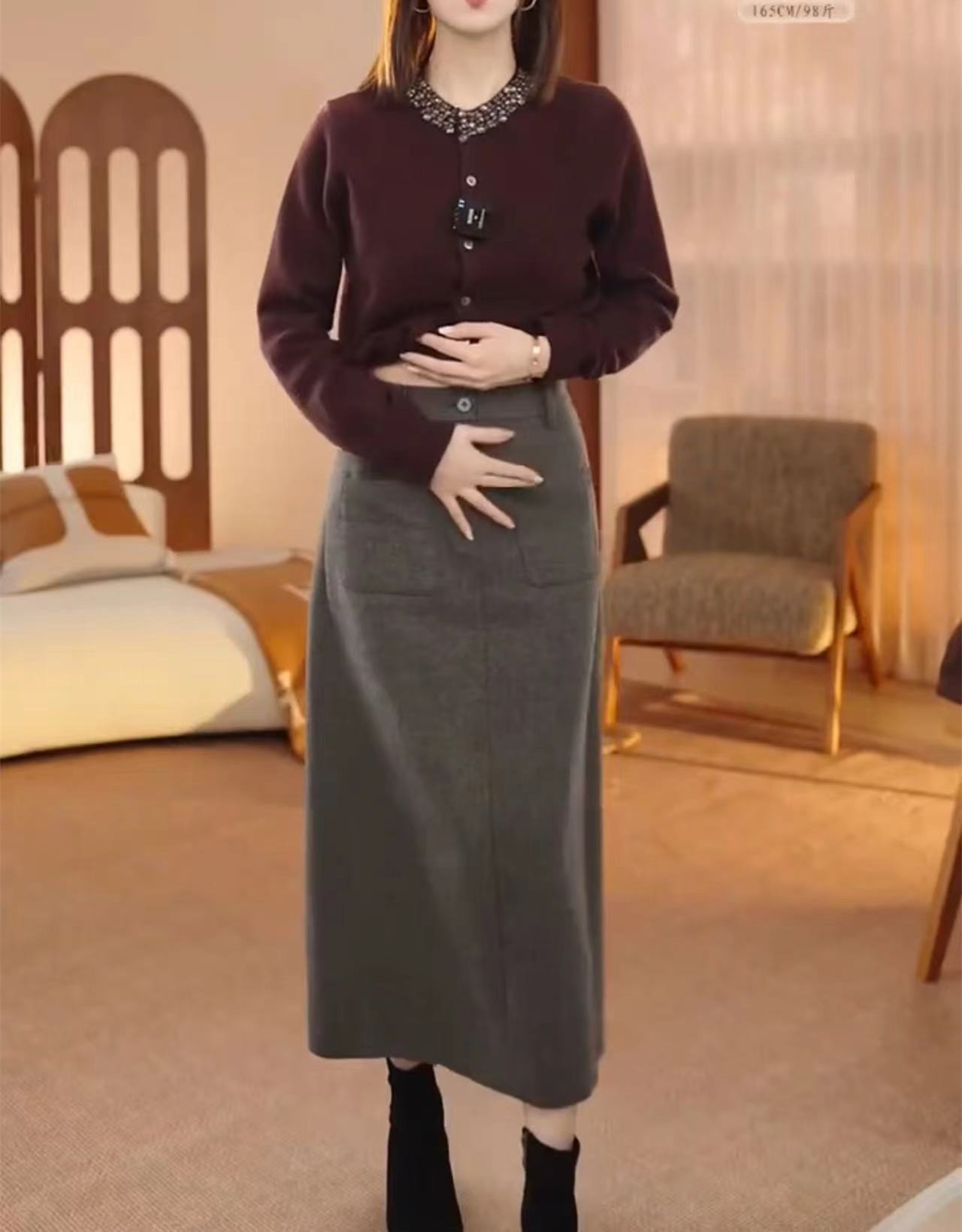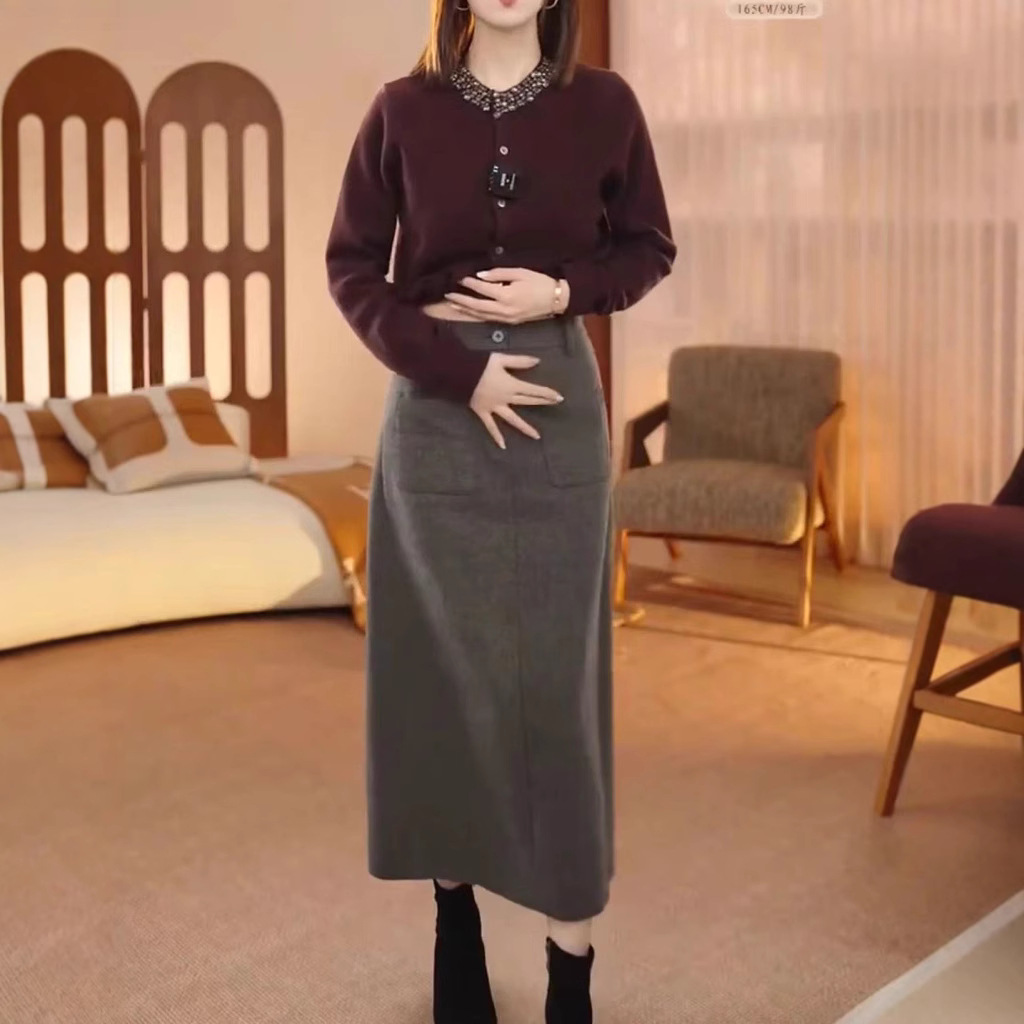 24986大爱美依缘2025秋季新款紫红色圆领烫钻上衣高腰半身裙女装