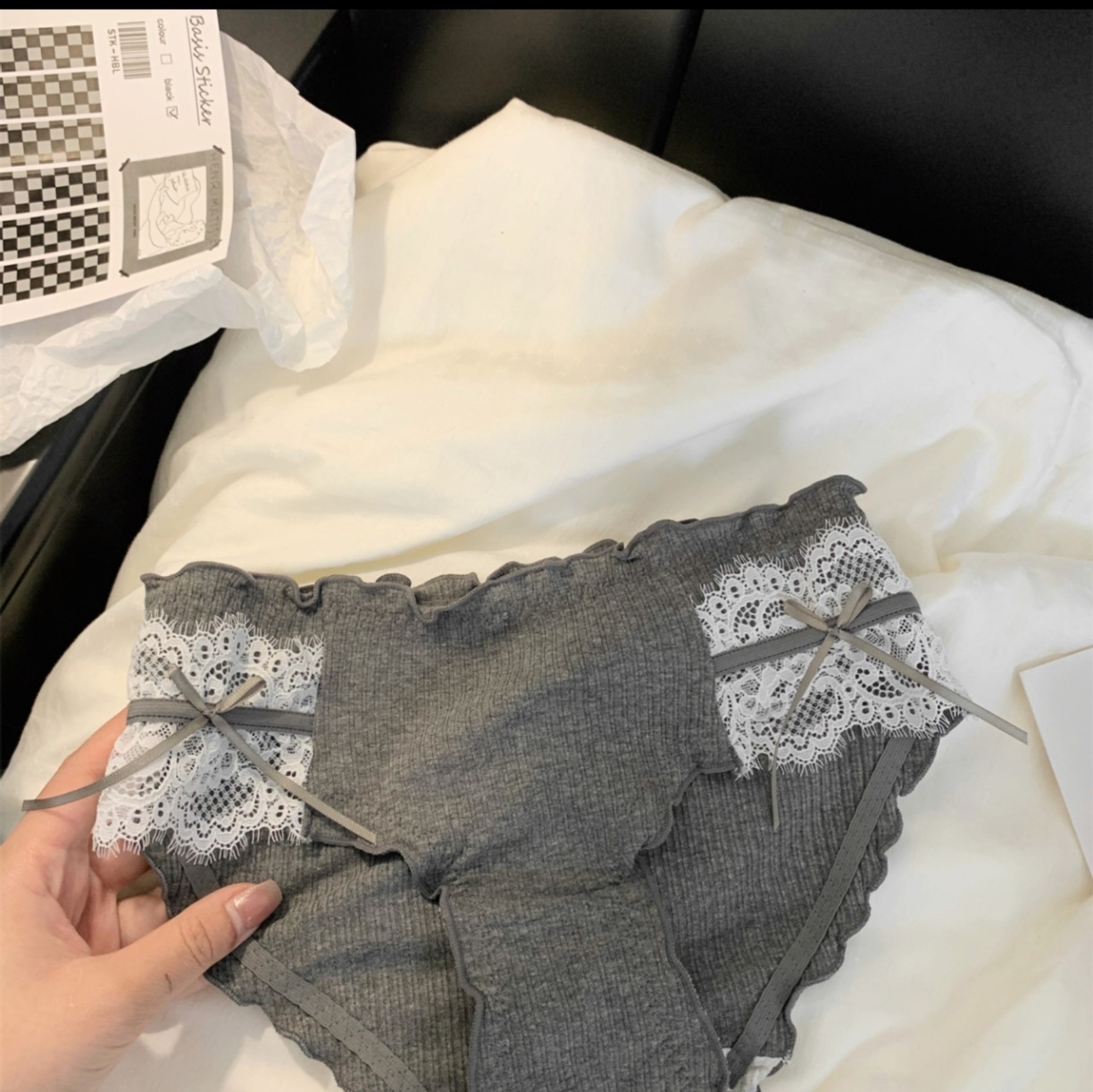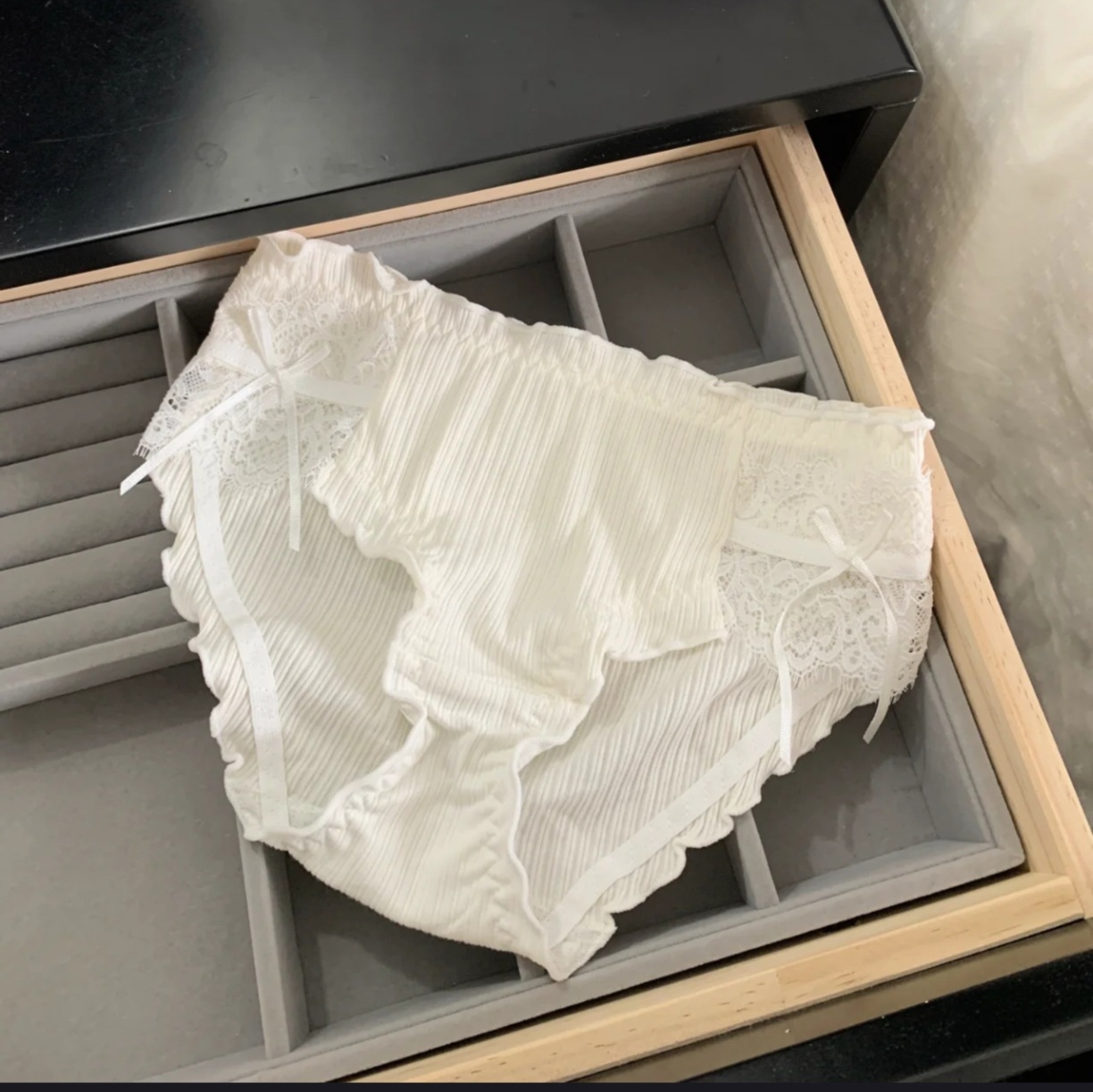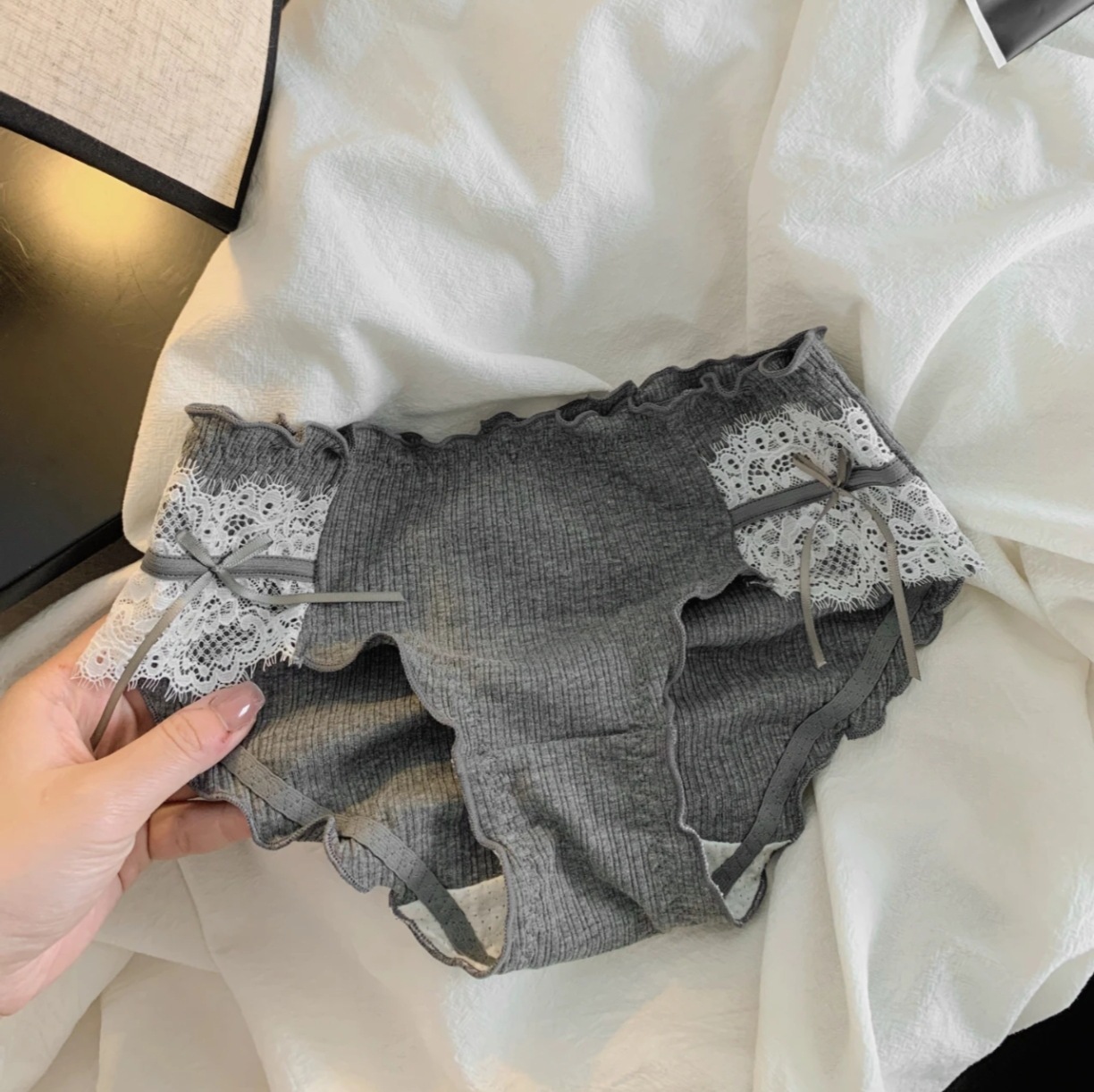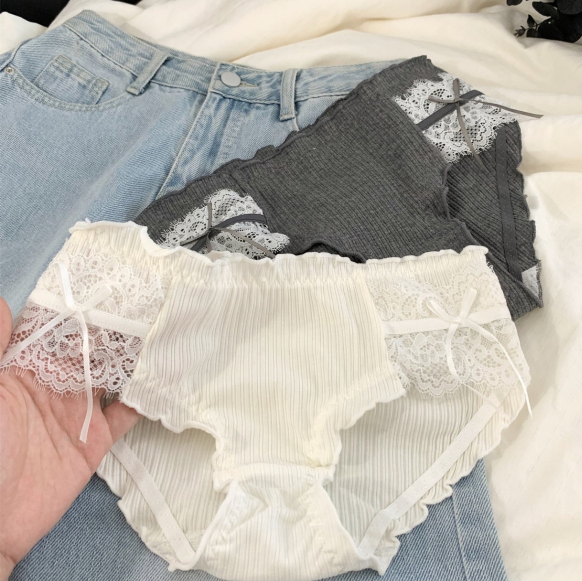 双蝴蝶结~甜美罗纹纯棉内裤女士a类波浪边柔软舒适中腰蕾丝三角裤