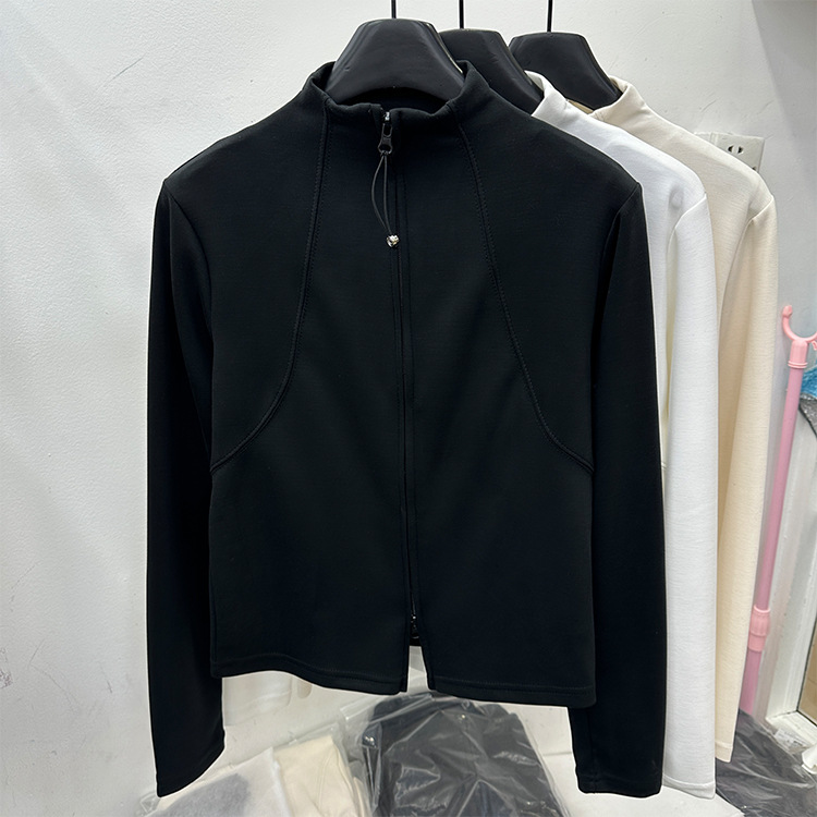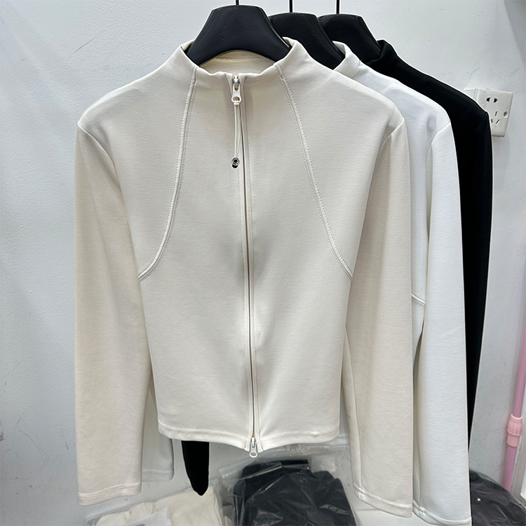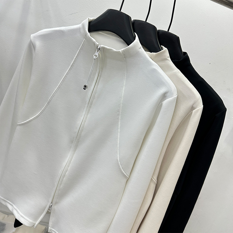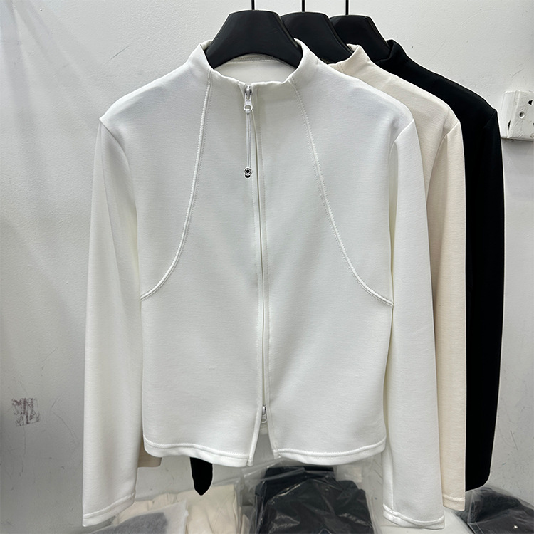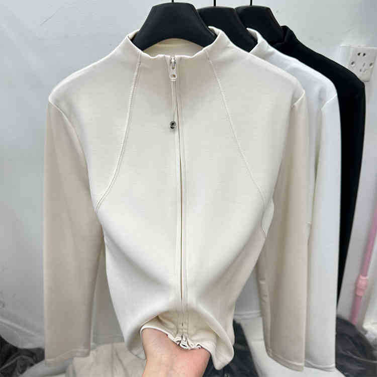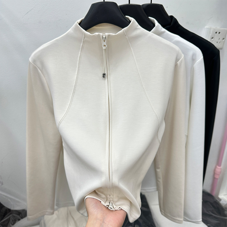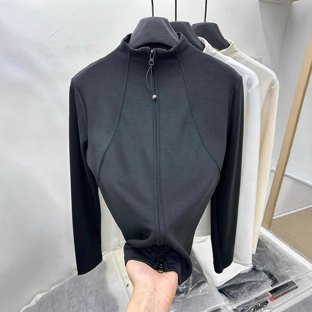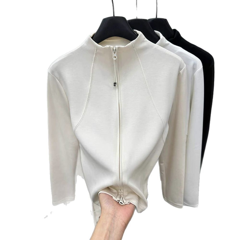 双拉链开衫立领长袖T恤卫衣设计感纯色百搭打底衫女春季修身上衣