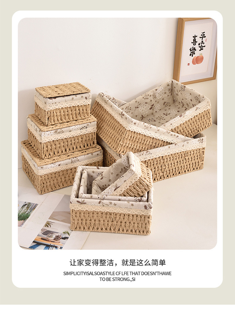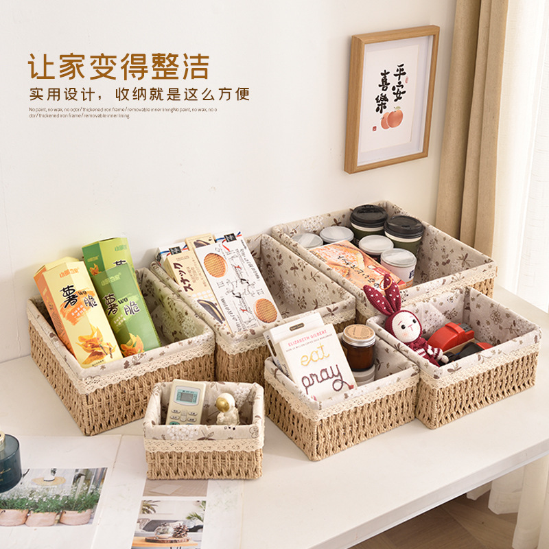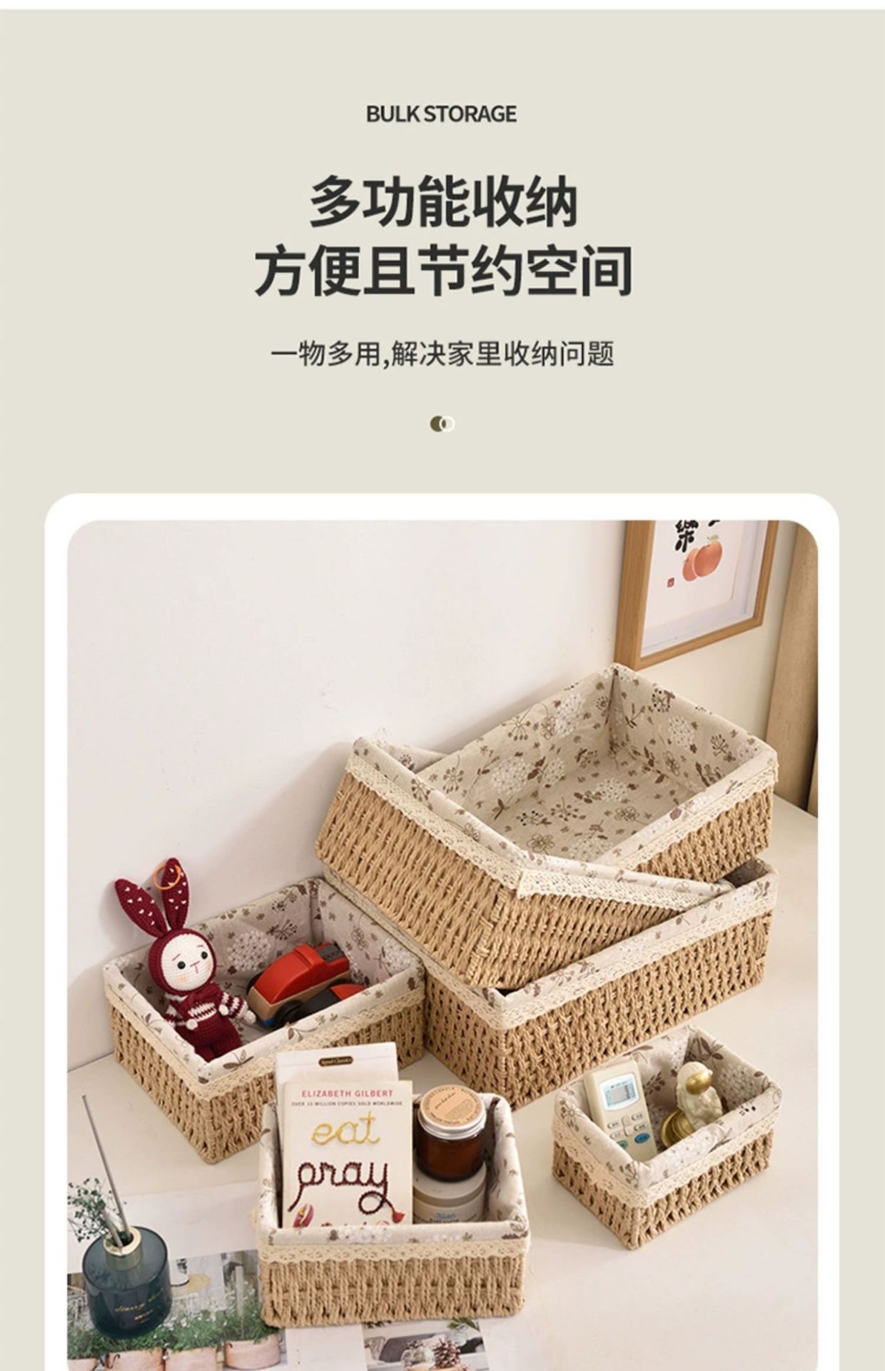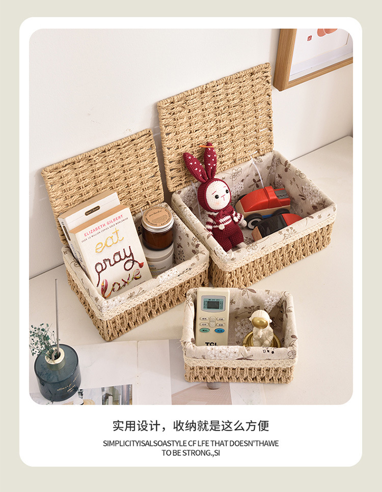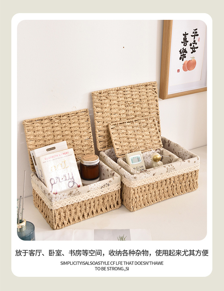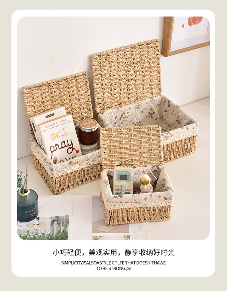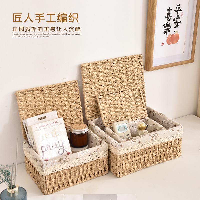 编织桌面收纳筐带盖仿藤编杂物零食化妆品收纳盒草编纸绳收纳篮