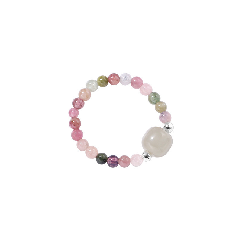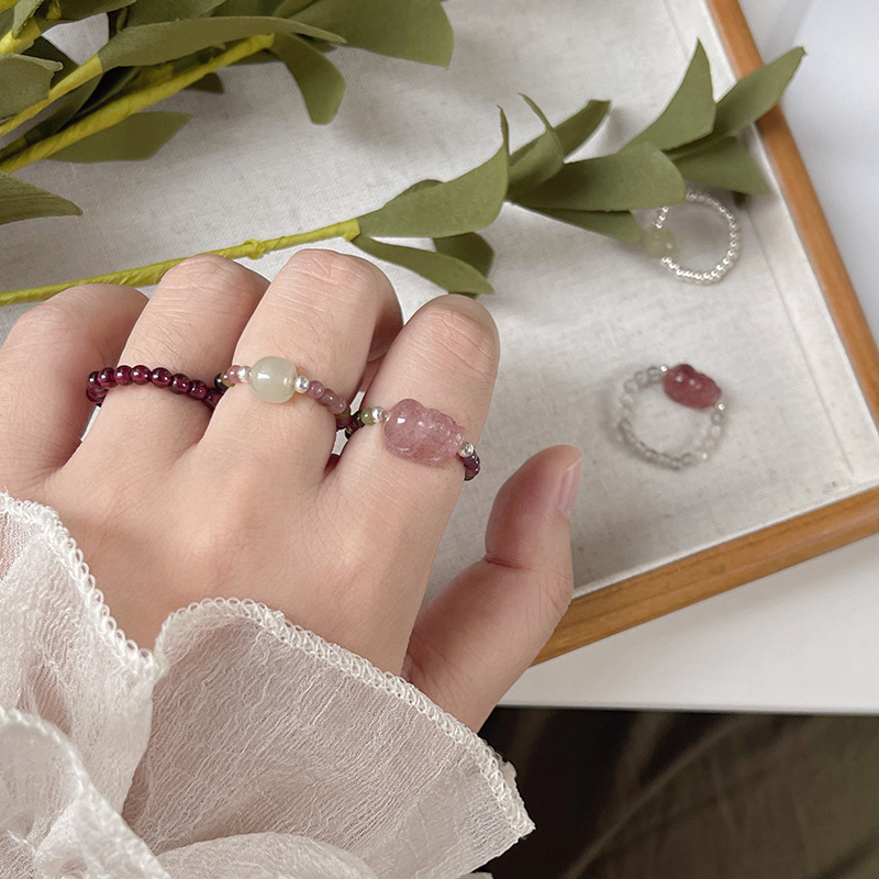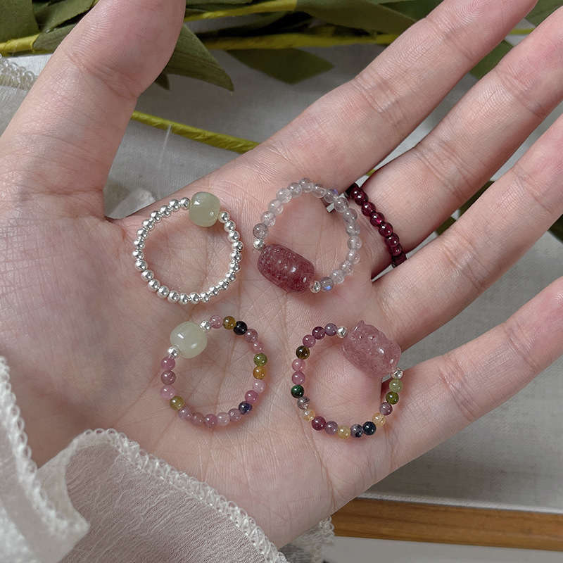 天然石水晶碧玺和田玉戒指女小众设计貔貅石榴石弹力绳潮