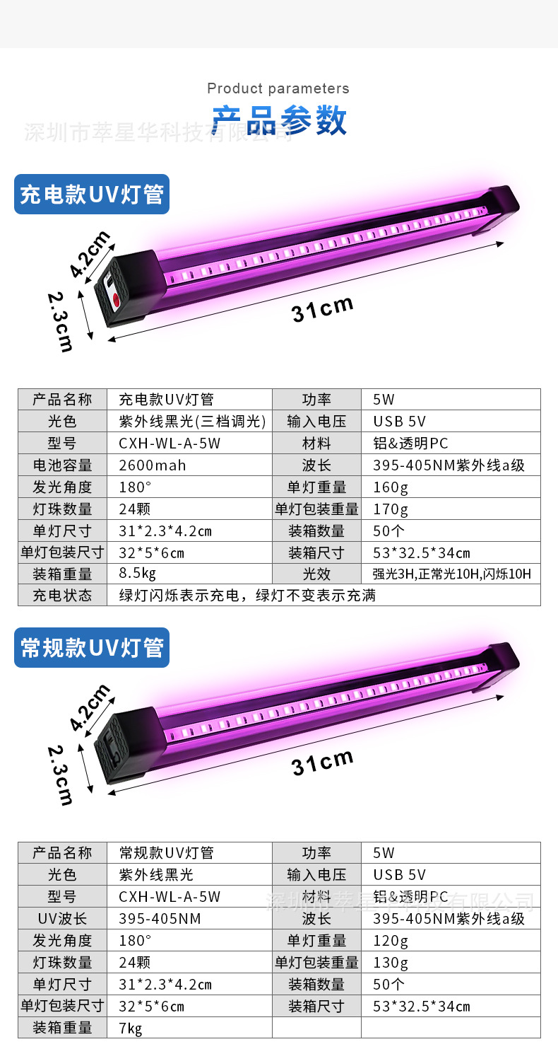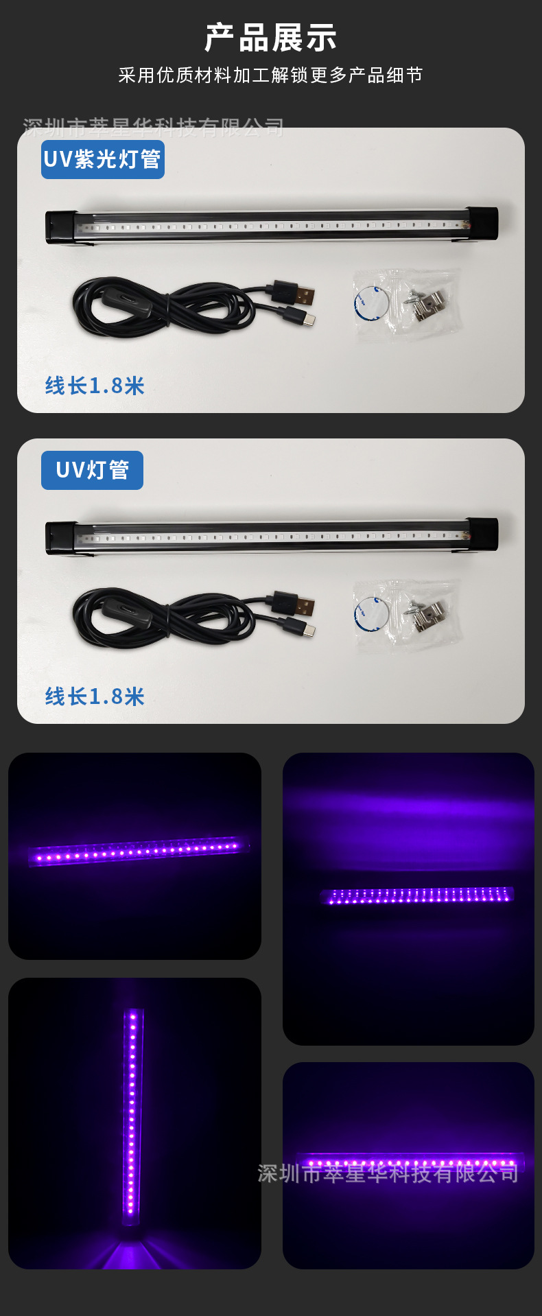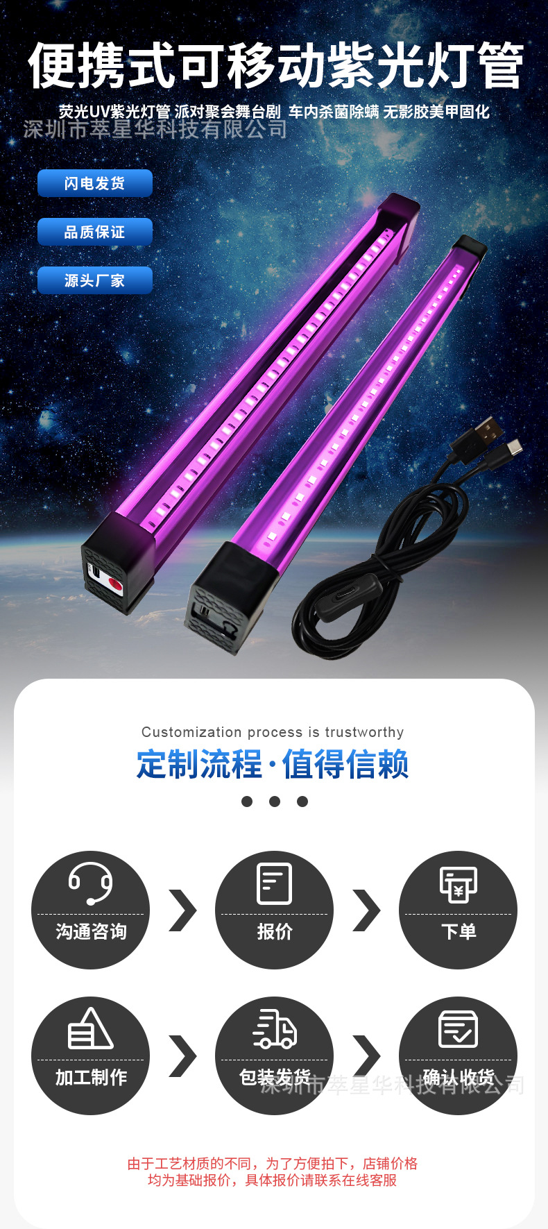 2024款紫光灯管 便携充电荧光壁画紫外线灯t5杀菌固化检测uv灯管