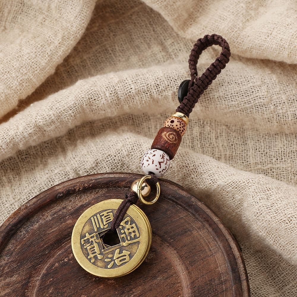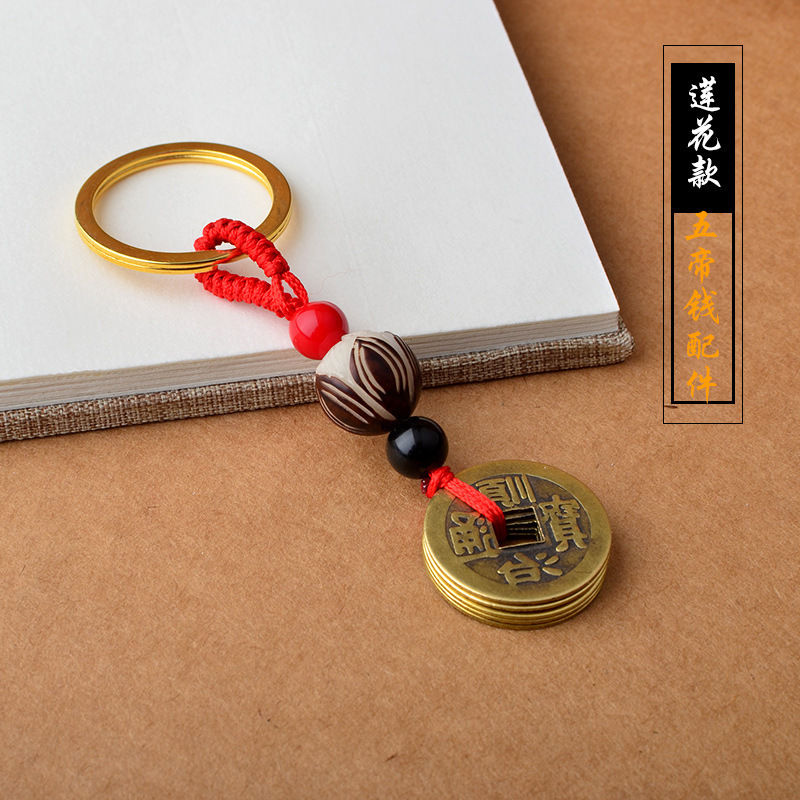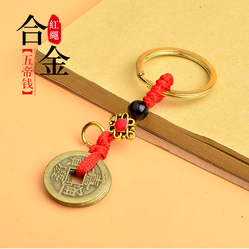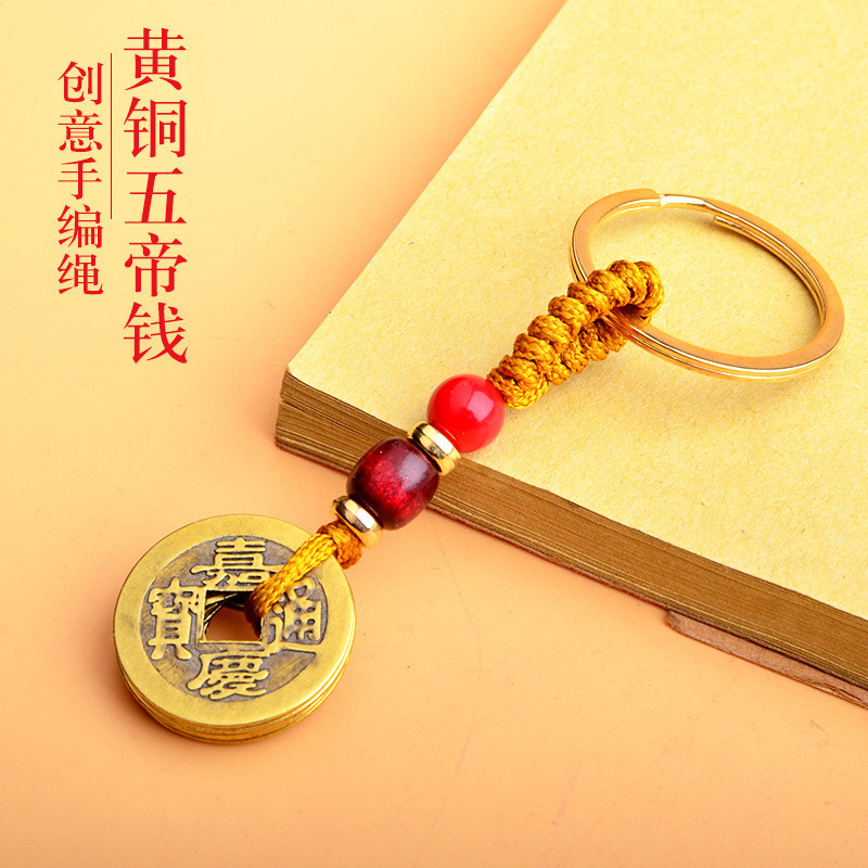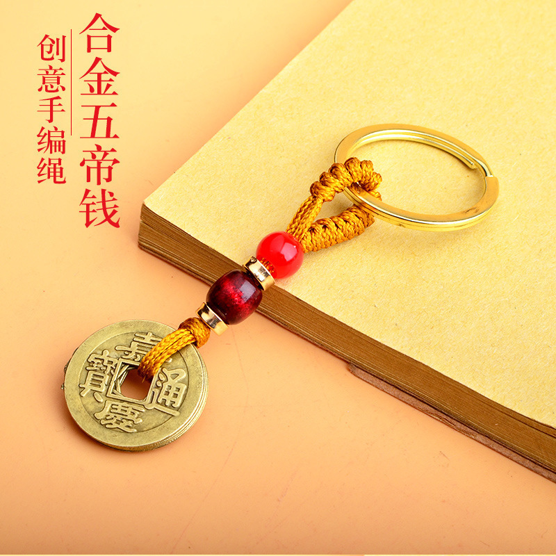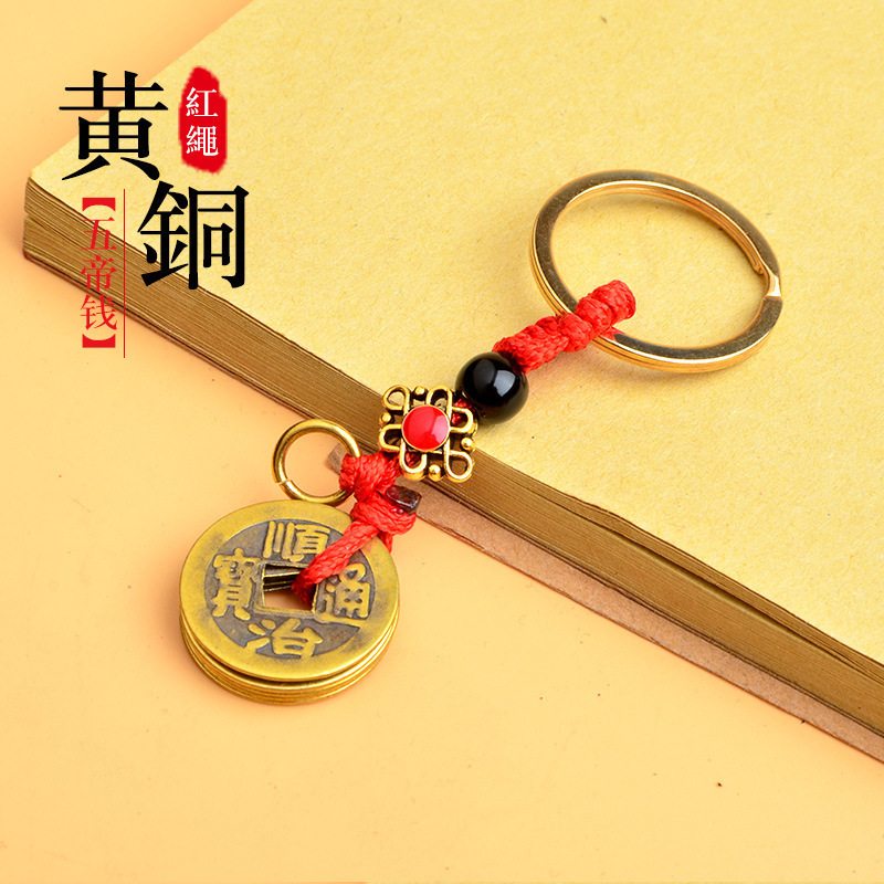 黄铜五帝钱钥匙扣配件绳厂家批发黄绳红绳配饰吊坠义乌小商品地摊