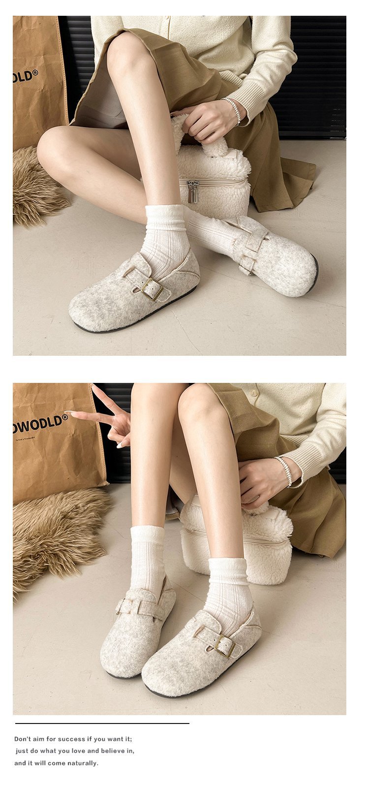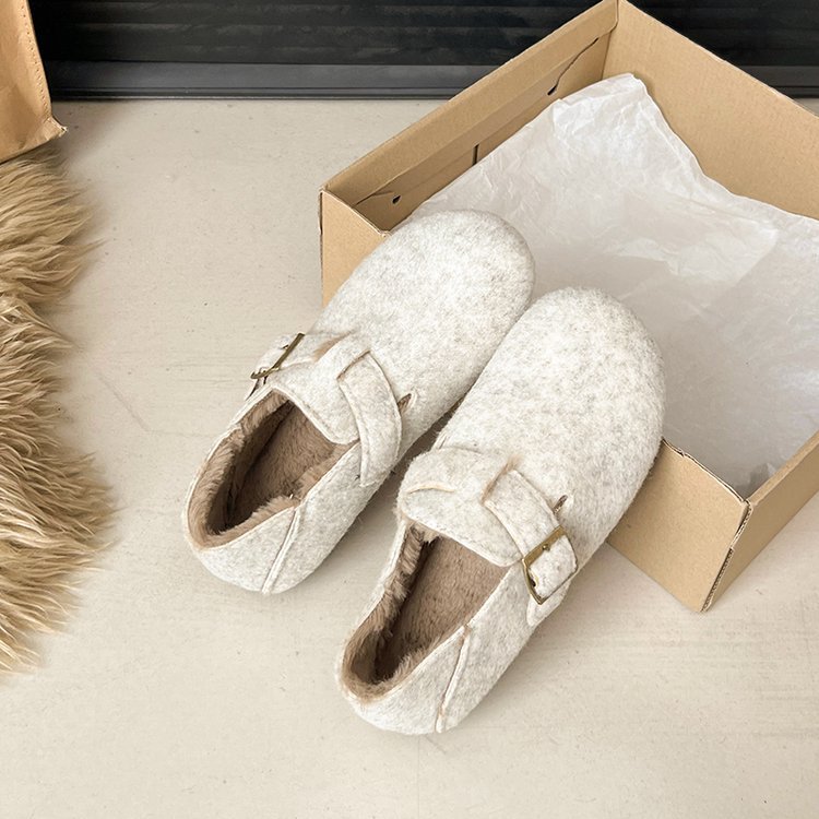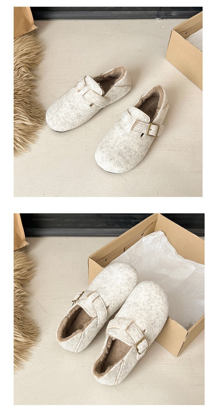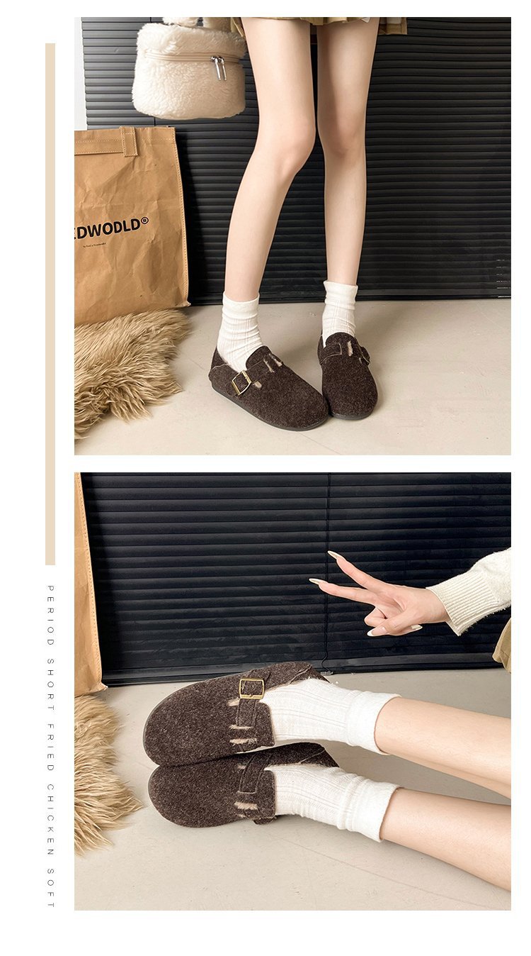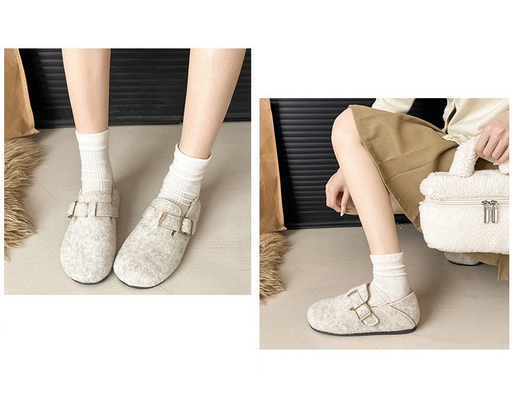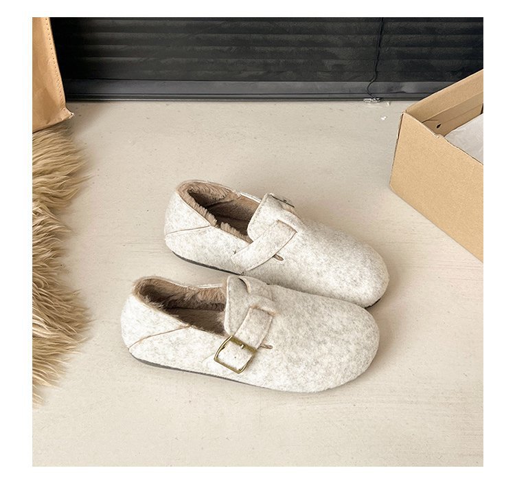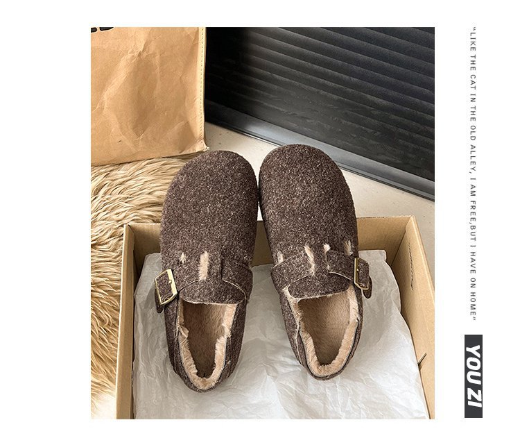 保暖又好看毛毛鞋加绒秋冬毛呢棉鞋包头半拖外穿平底燕麦色豆豆鞋