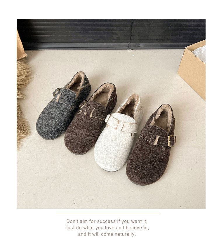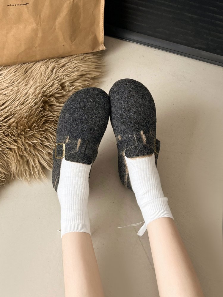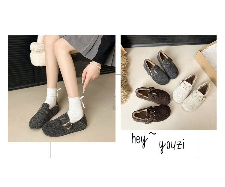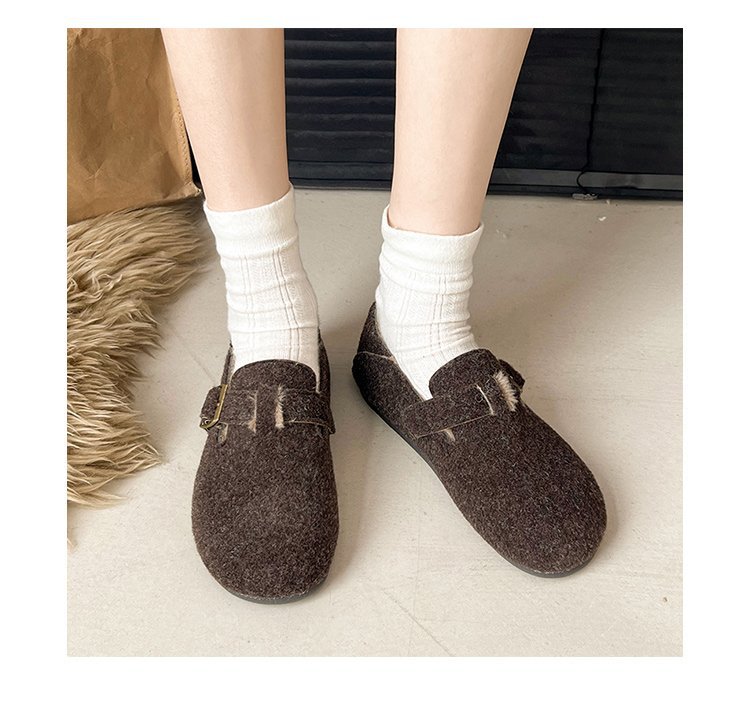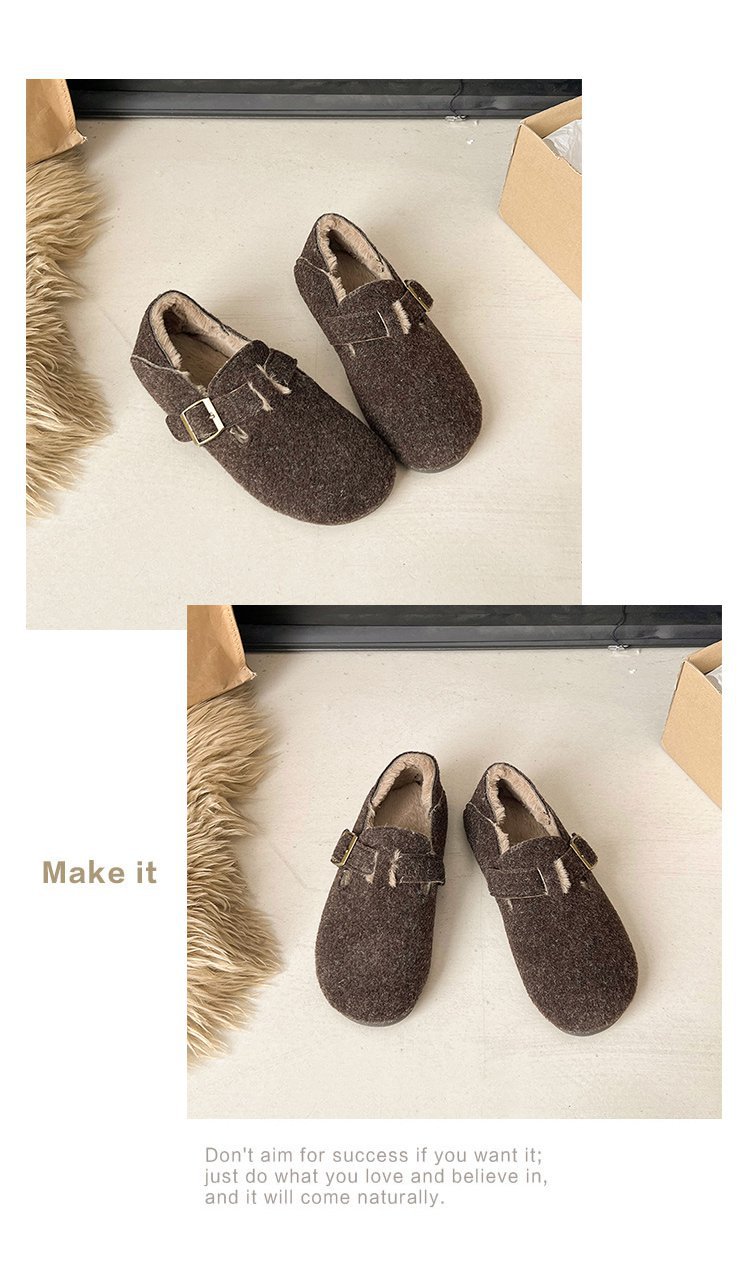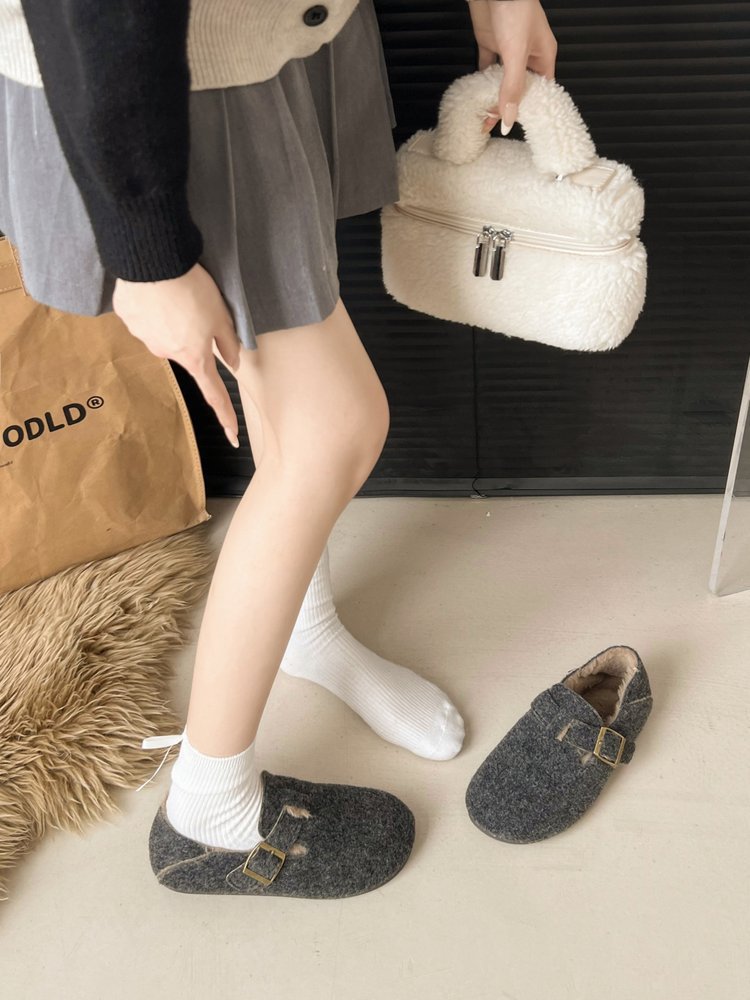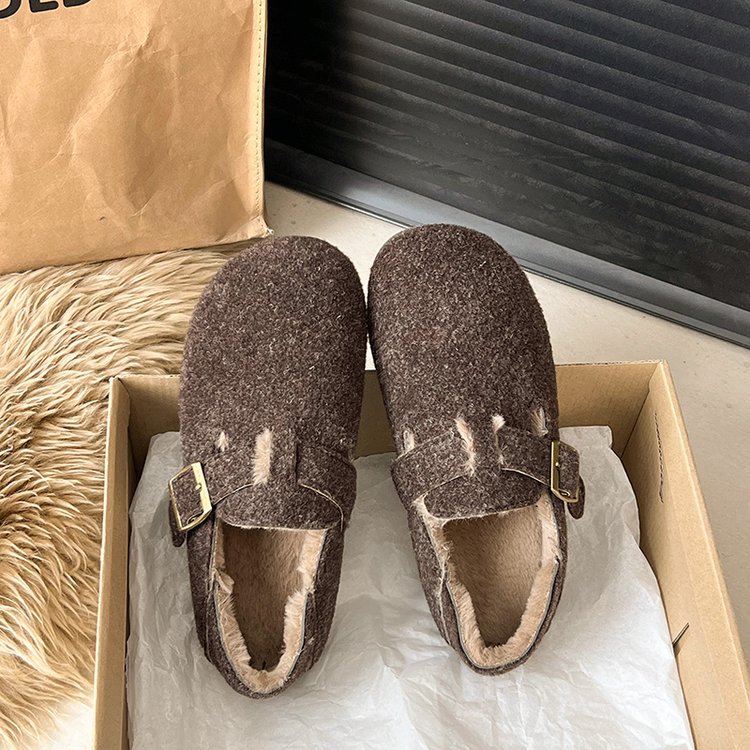 保暖又好看毛毛鞋加绒秋冬毛呢棉鞋包头半拖外穿平底燕麦色豆豆鞋