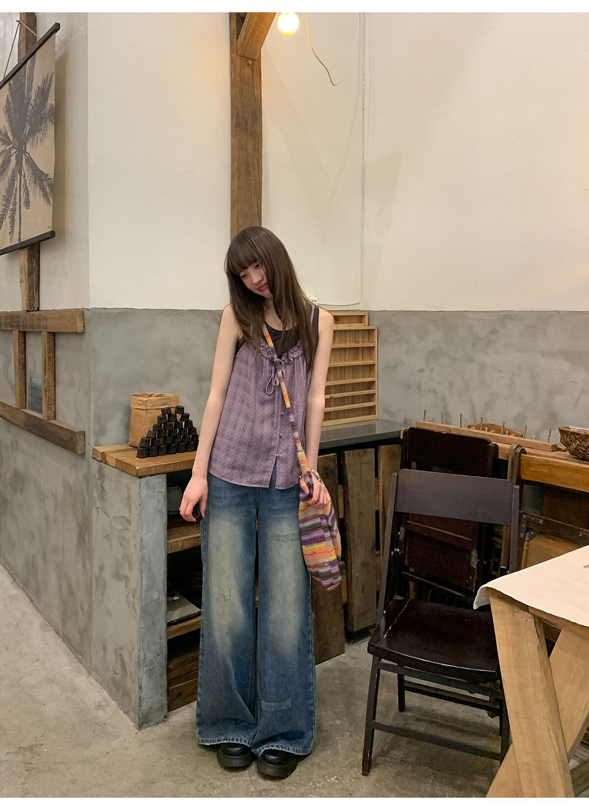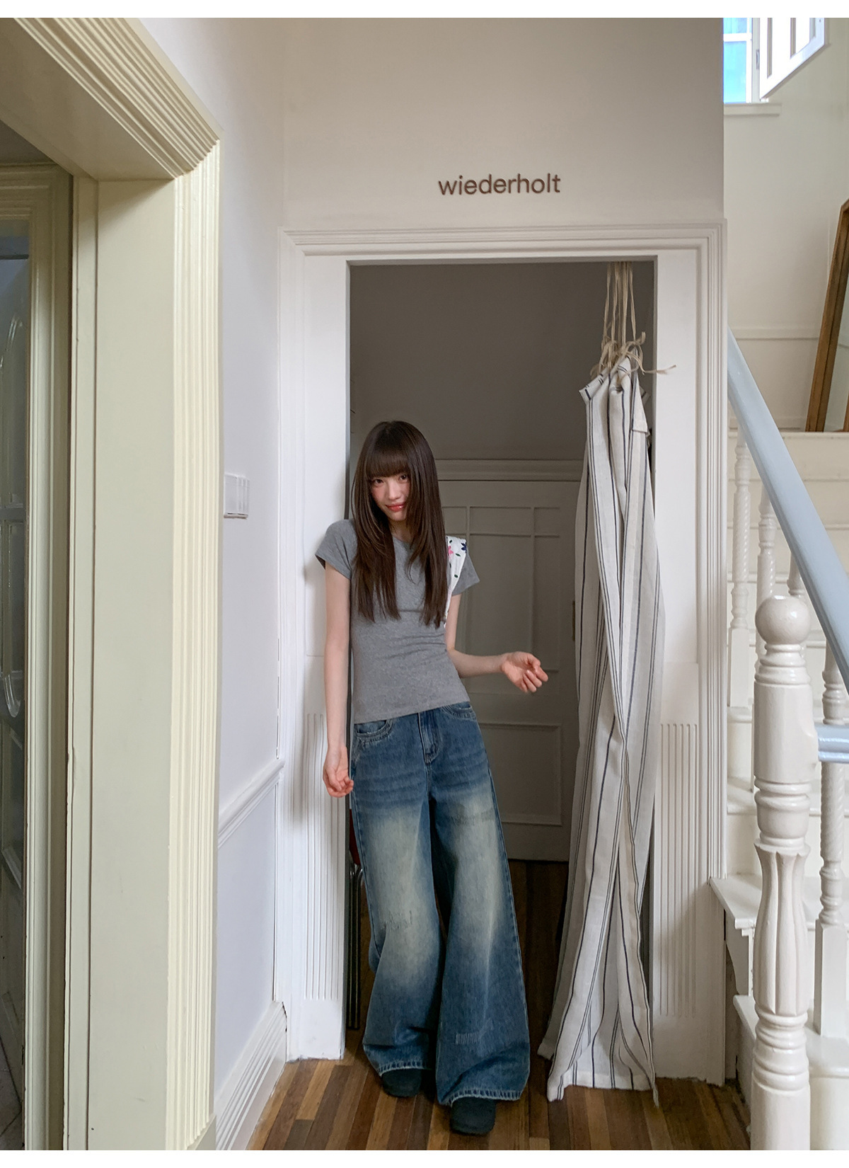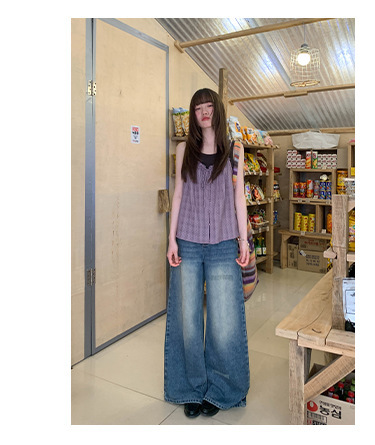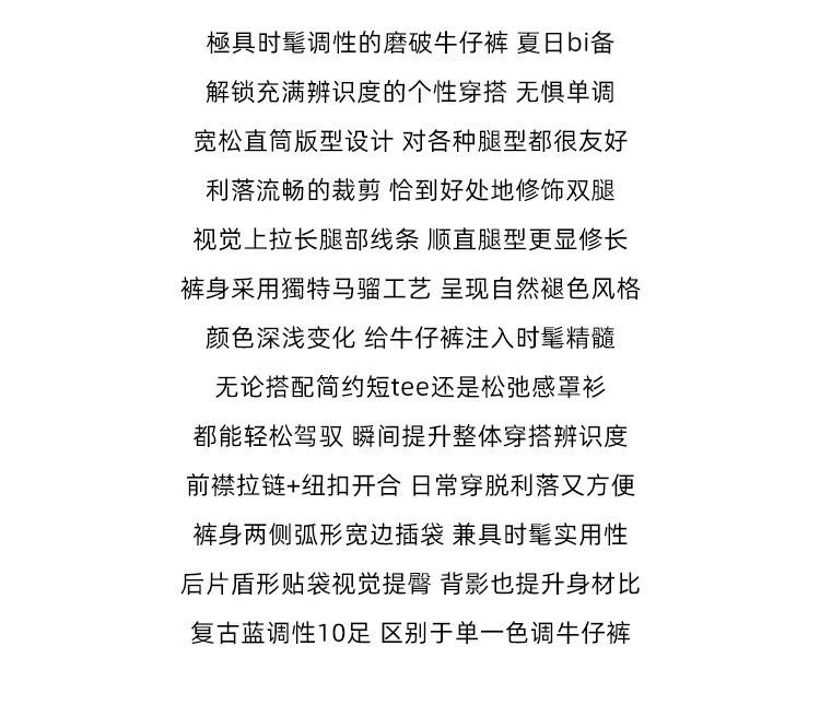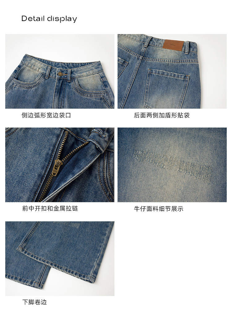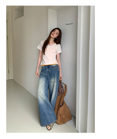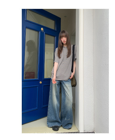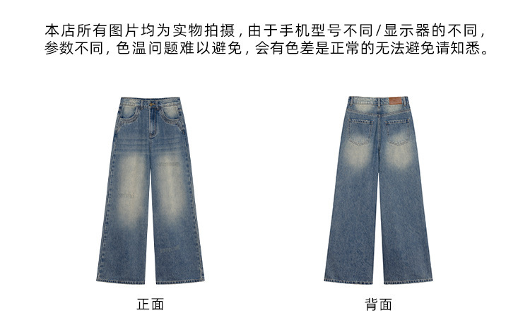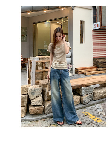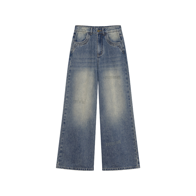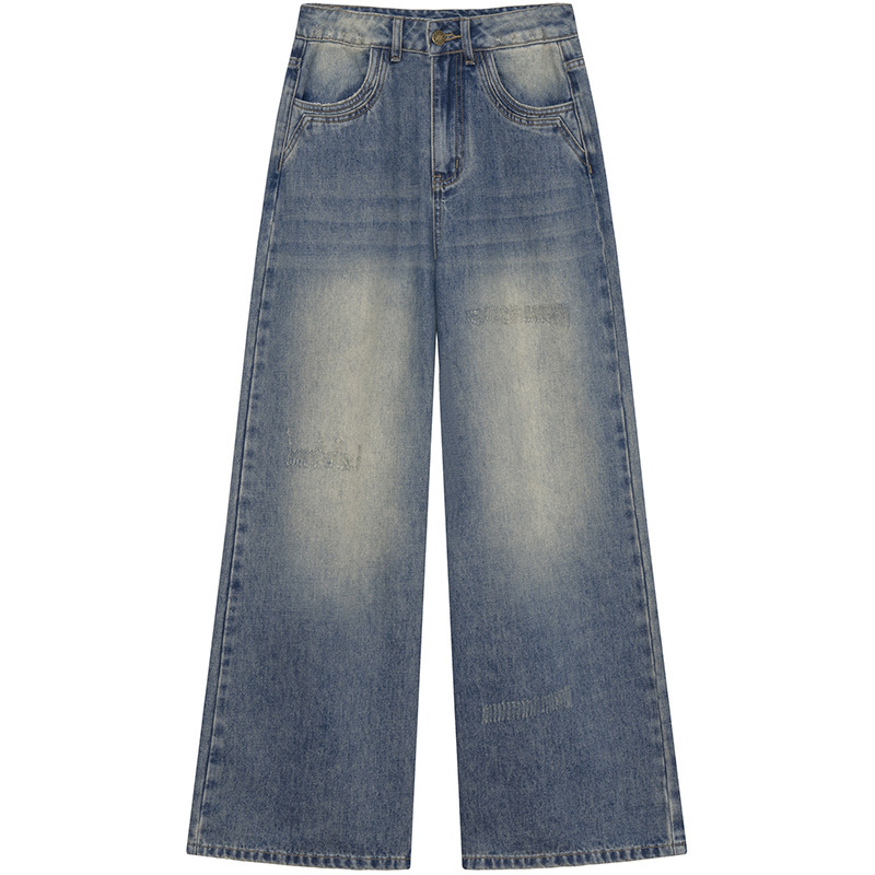 复古高腰阔腿牛仔裤女夏季做旧工艺磨破设计感休闲长裤