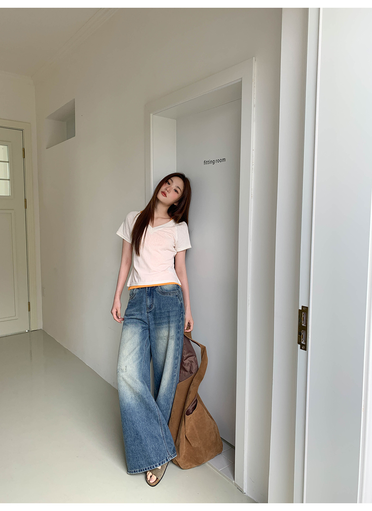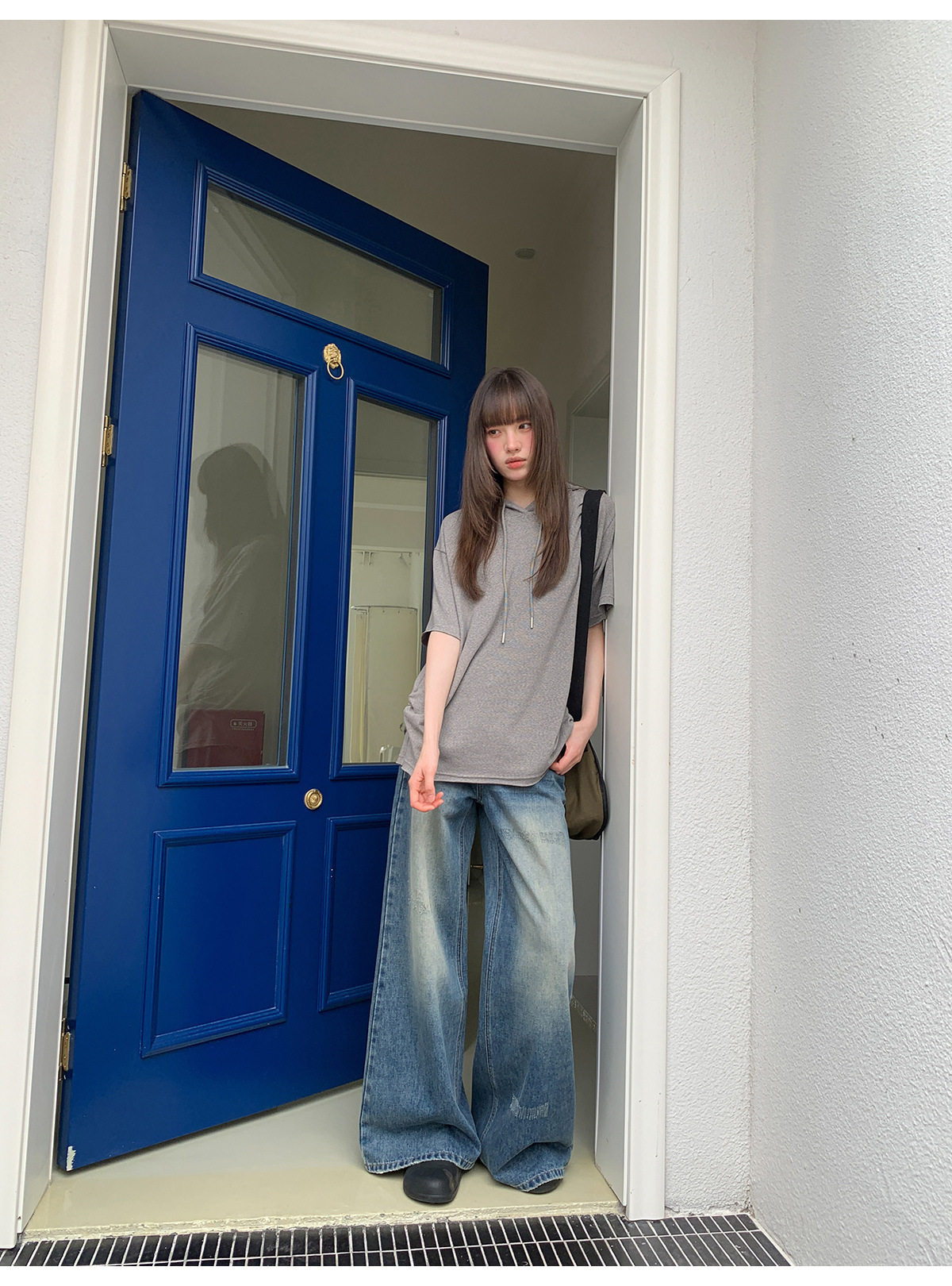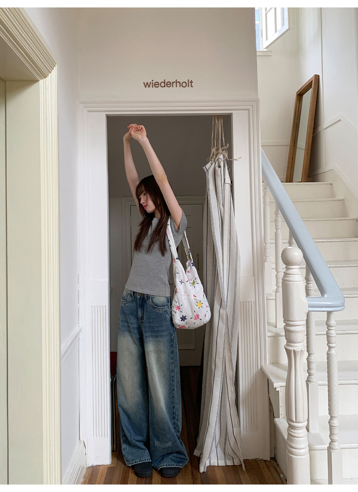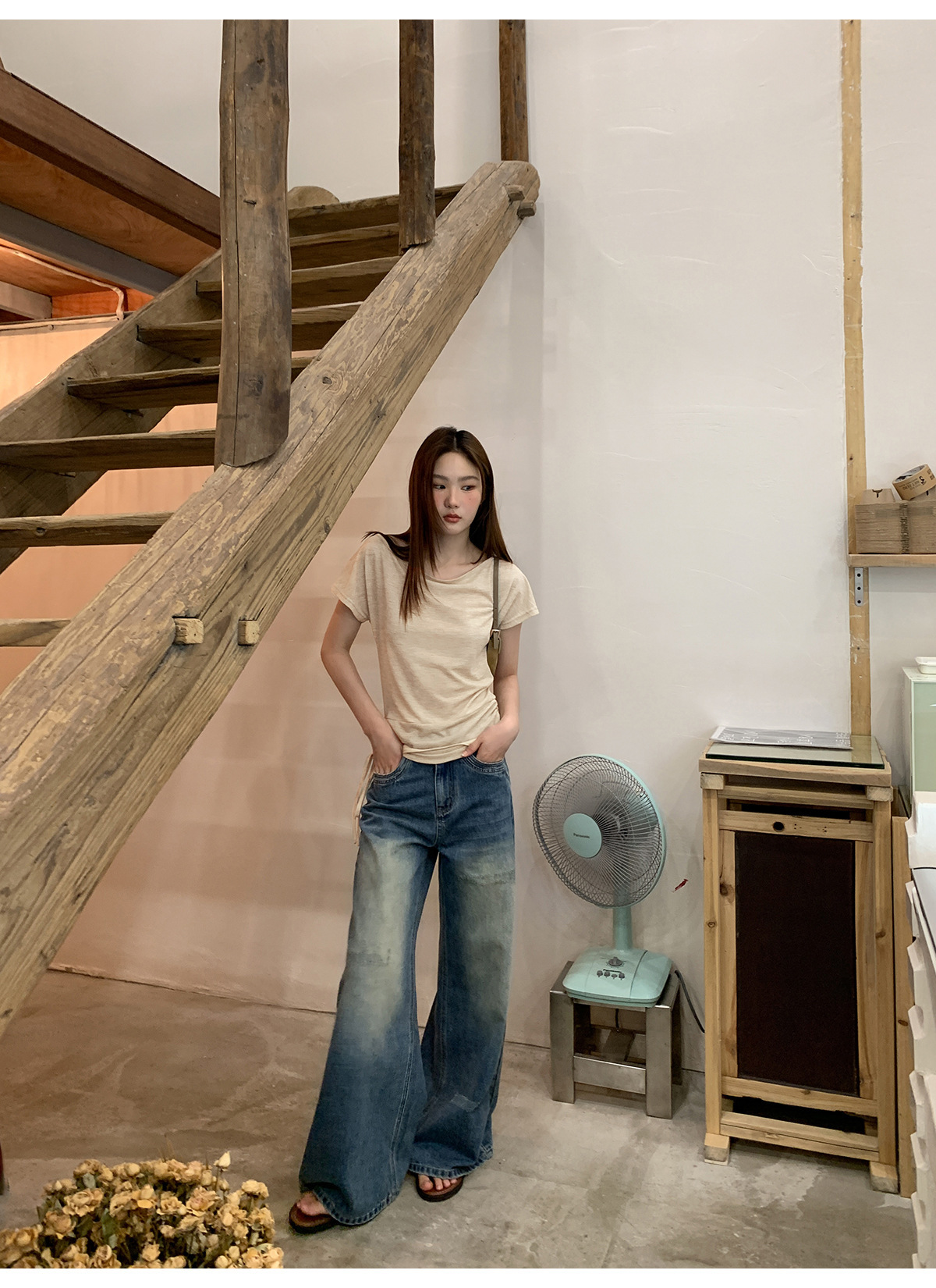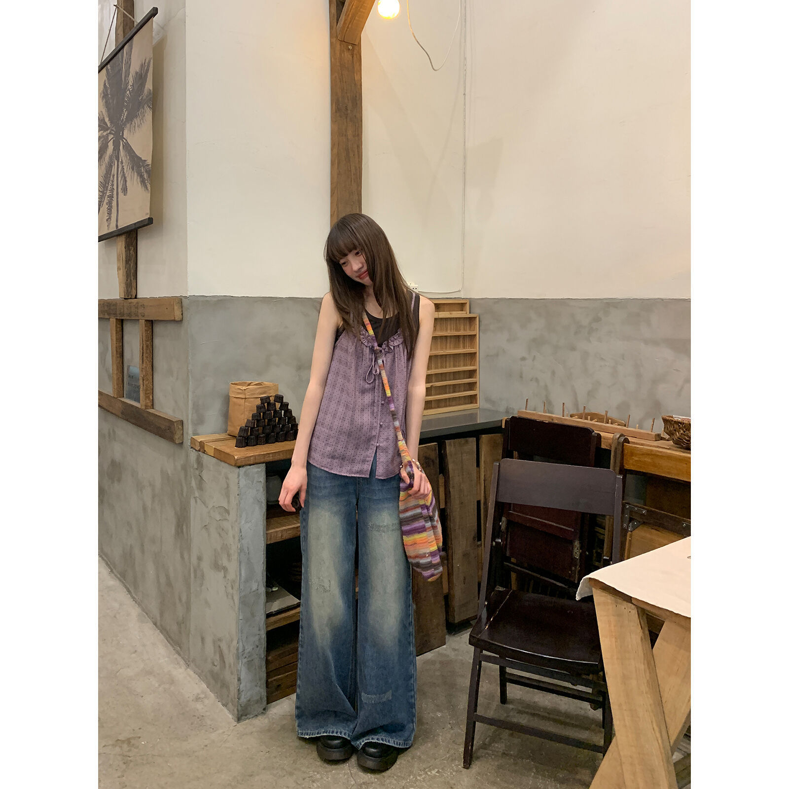 复古高腰阔腿牛仔裤女夏季做旧工艺磨破设计感休闲长裤