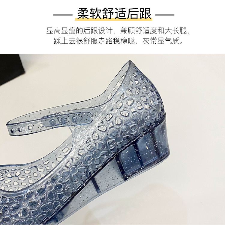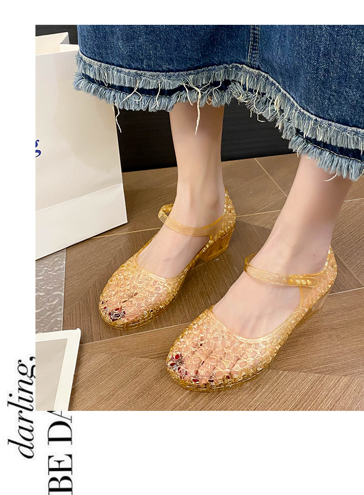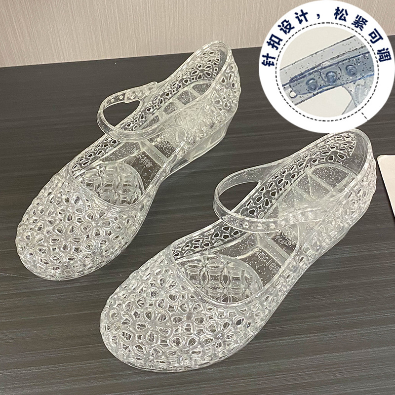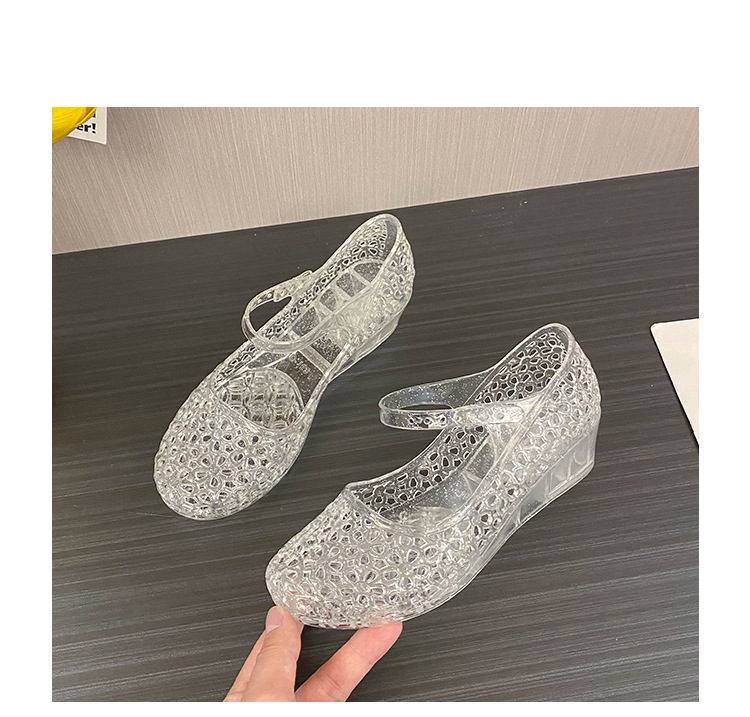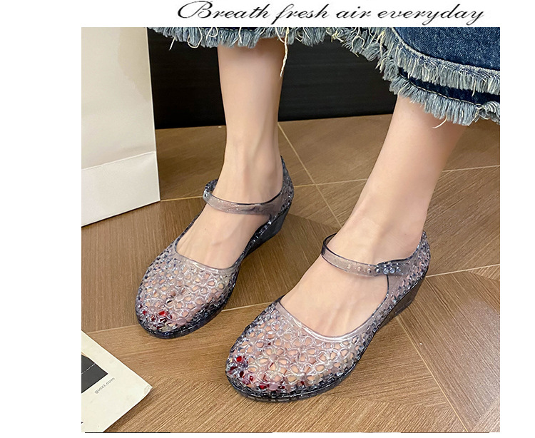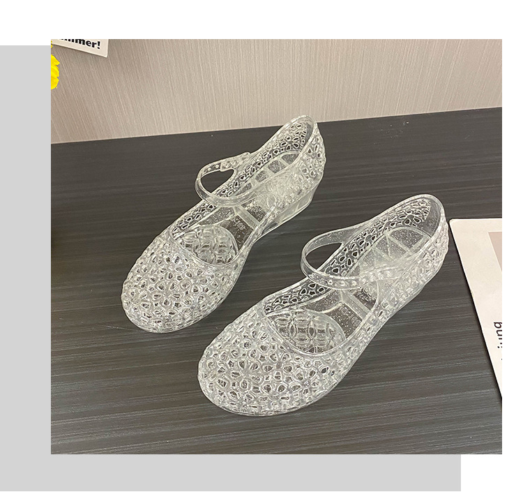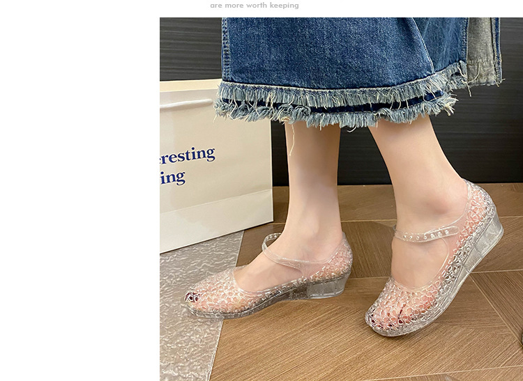 时尚塑料凉拖鞋女外穿水晶女鞋坡跟凉鞋中跟一字扣带包头夏季凉鞋