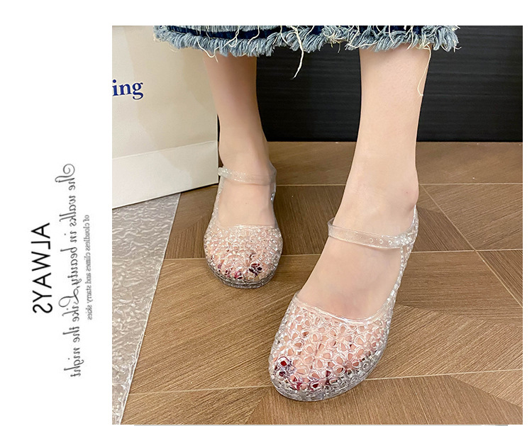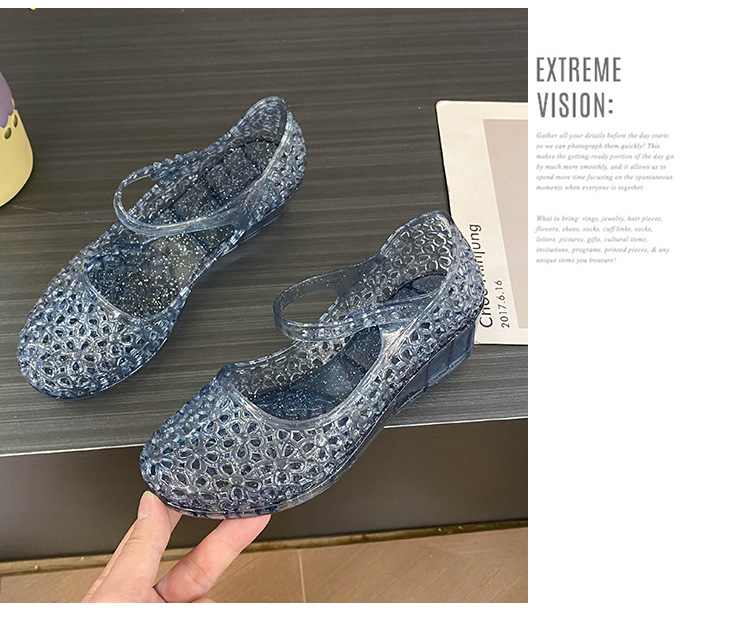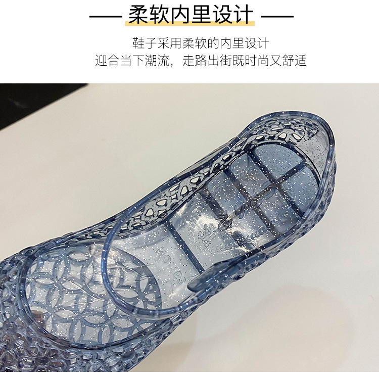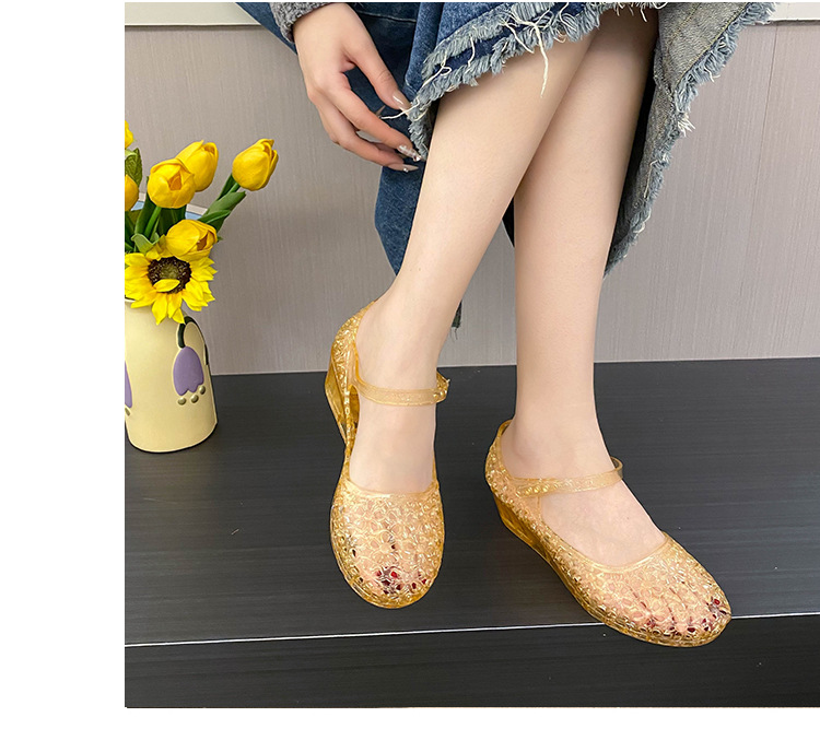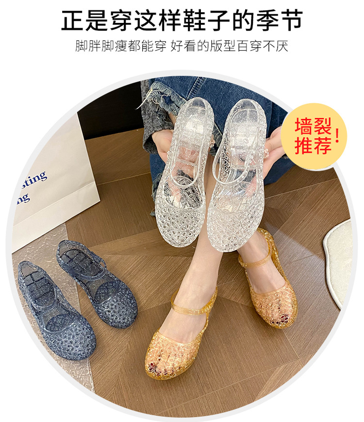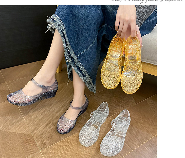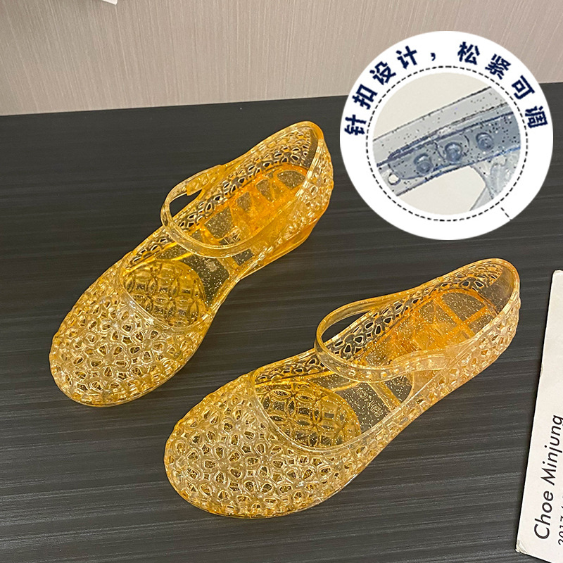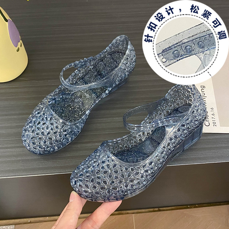 时尚塑料凉拖鞋女外穿水晶女鞋坡跟凉鞋中跟一字扣带包头夏季凉鞋