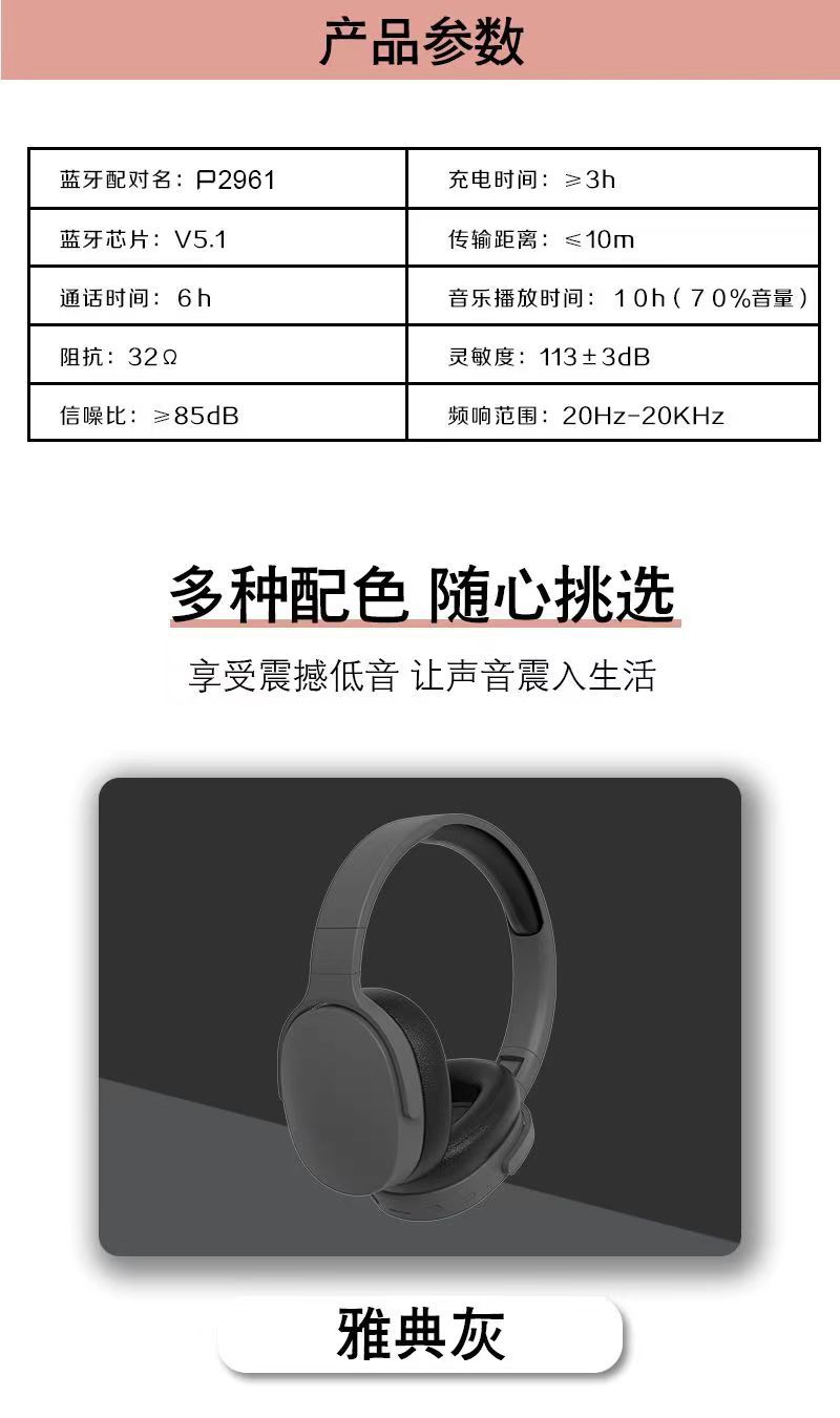 跨境新款P2961 头戴式运动简约可插线款无线蓝牙耳机耳机工厂批发