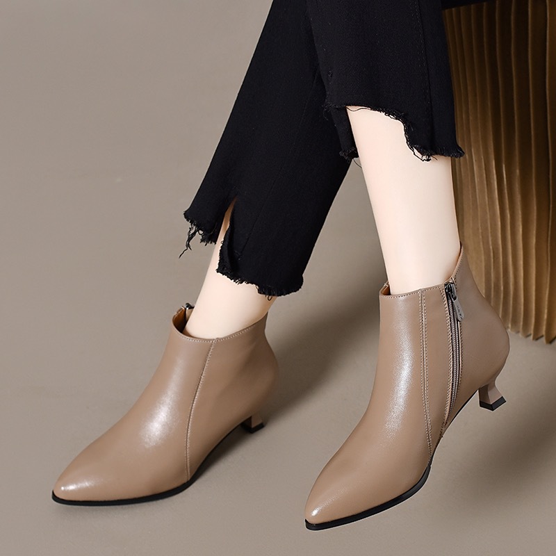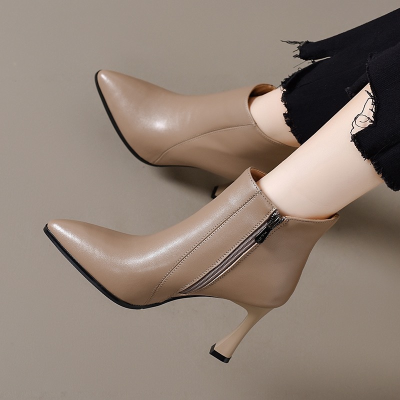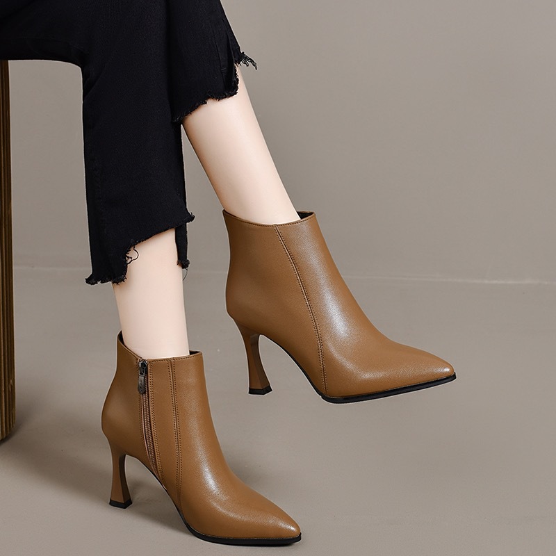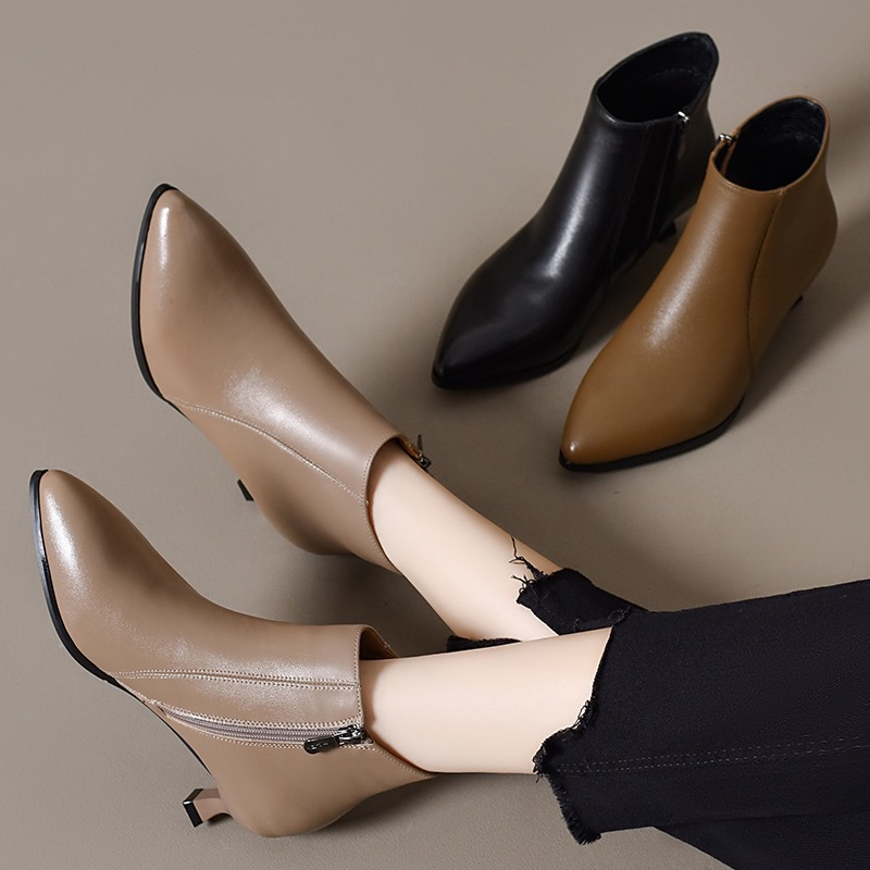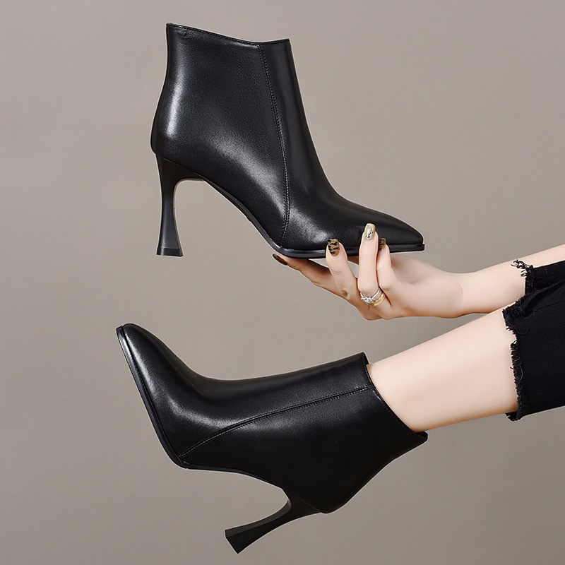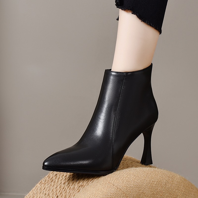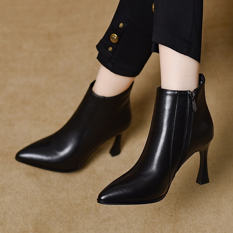 细跟高跟鞋女真皮短靴2024冬季新款尖头时尚加绒皮鞋百搭春秋单靴