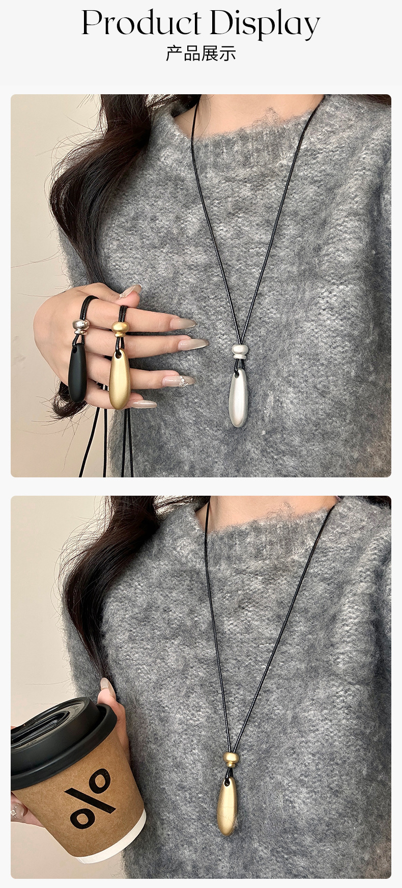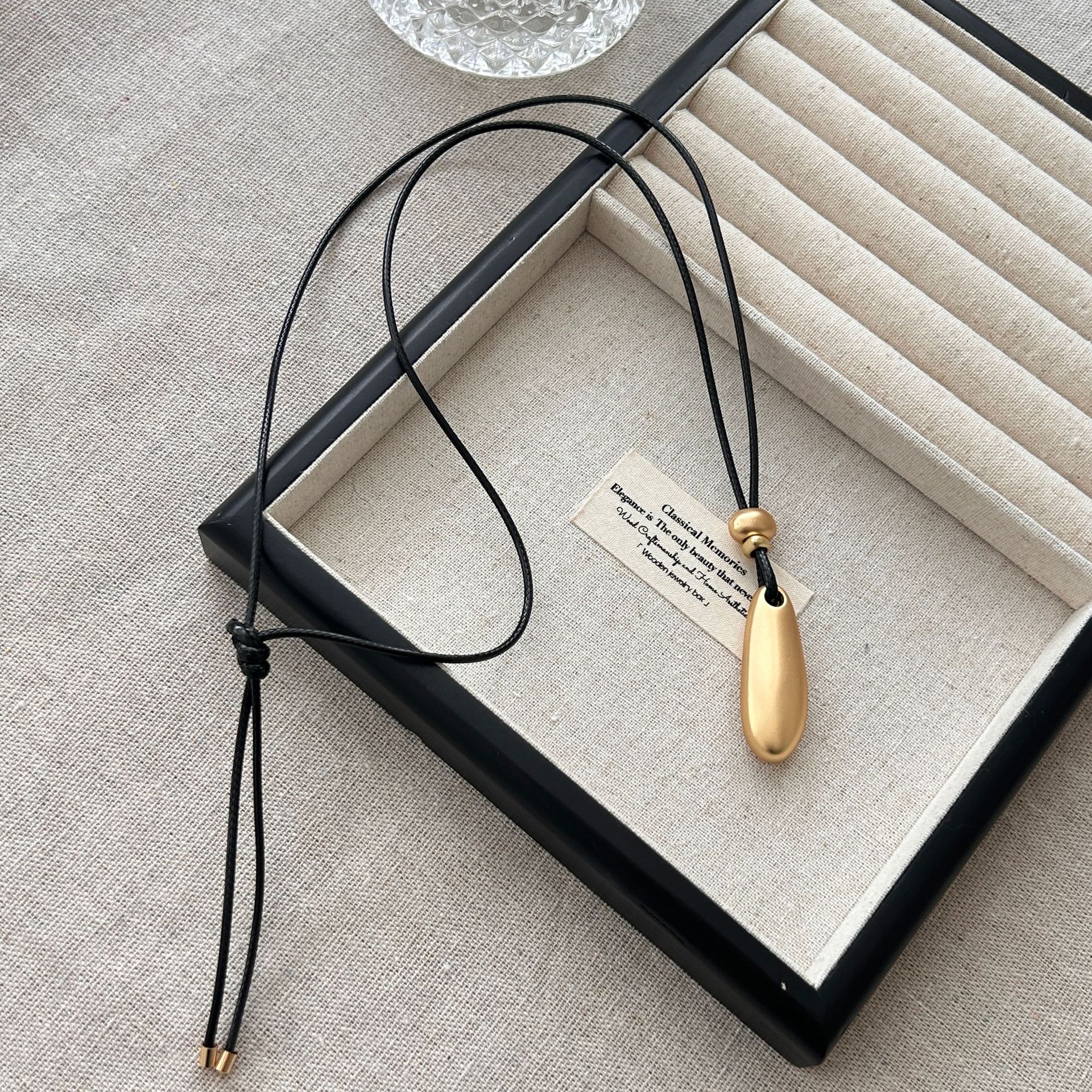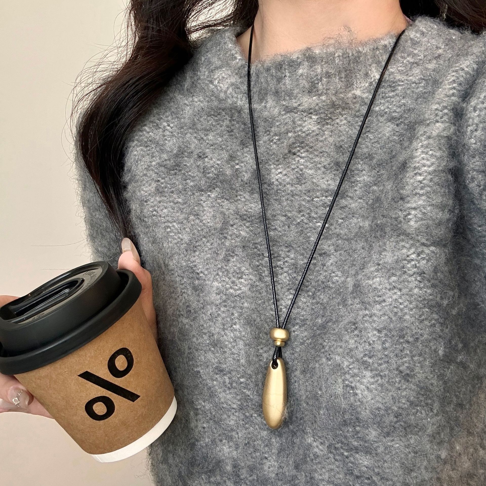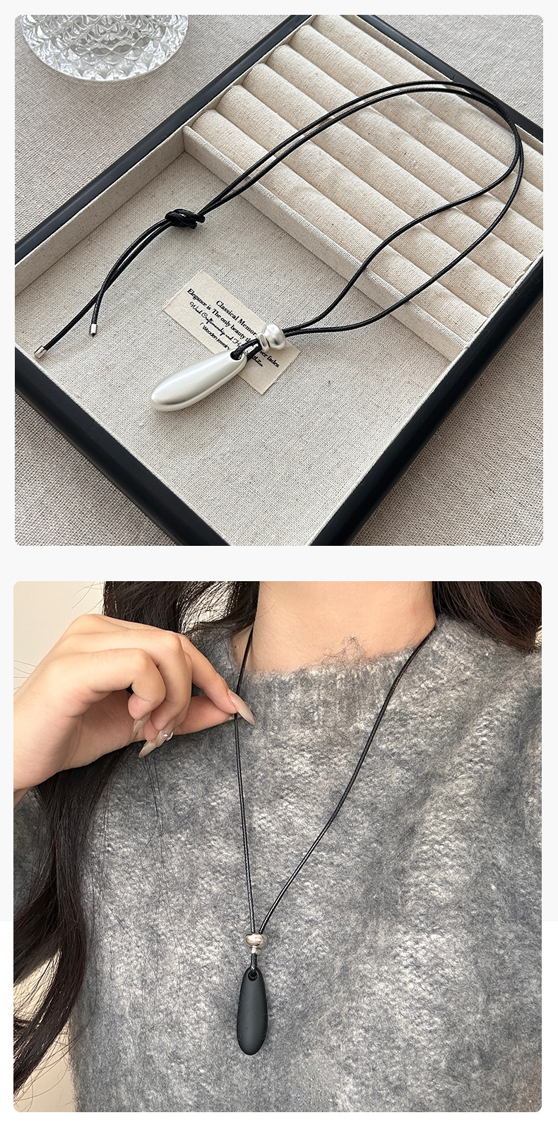 新款简约水滴形吊坠项链时尚气质高级感百搭皮绳长款毛衣链配饰女